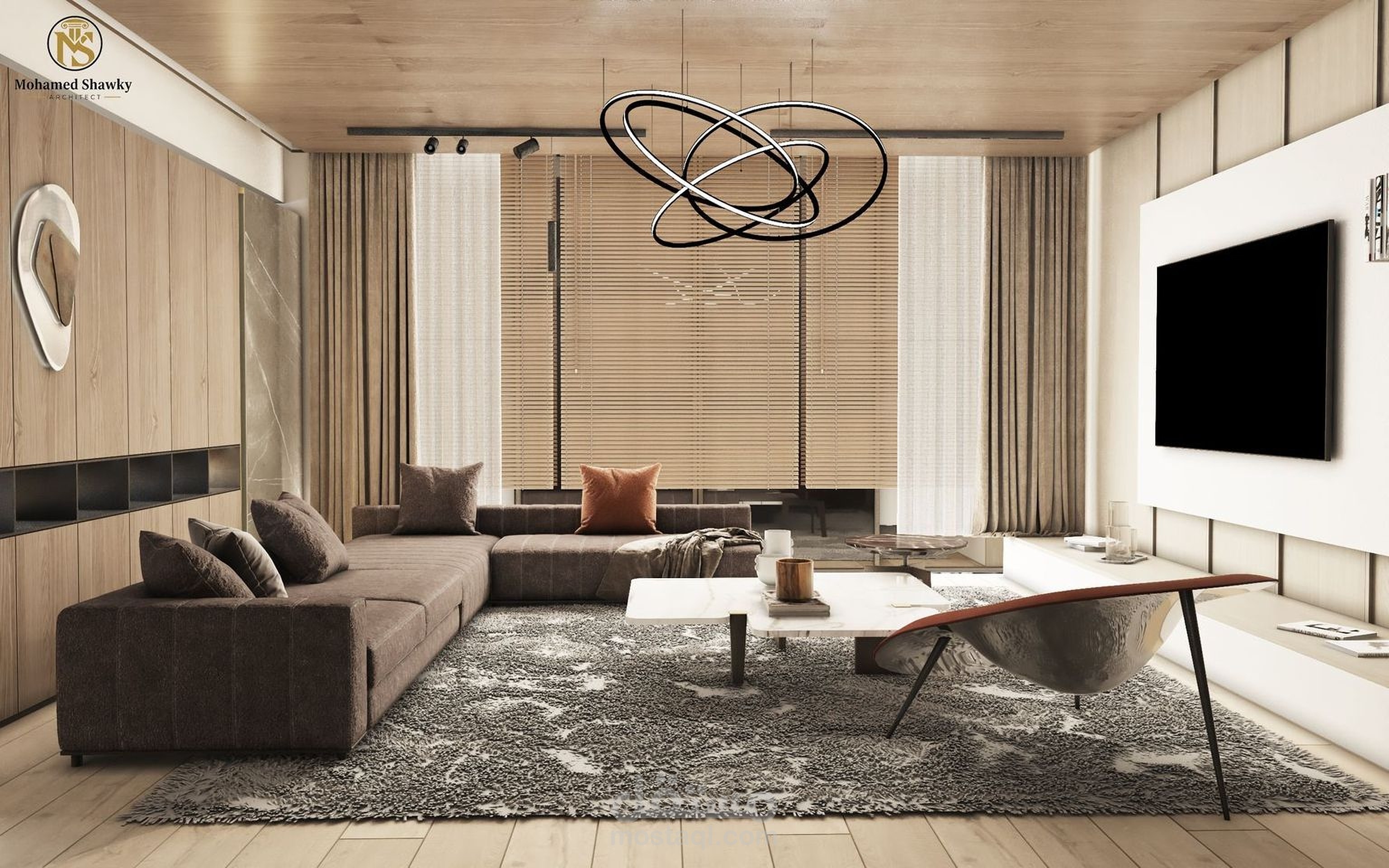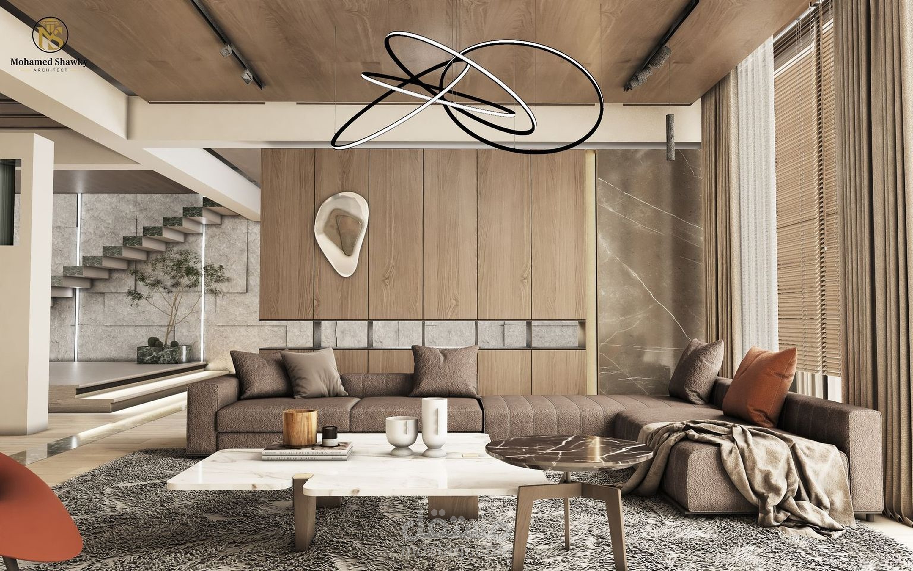 تصميم مساحة معيشة عصرية يركز على تحقيق توازن بين الألوان الدافئة والخامات الطبيعية، مع إبراز التفاصيل الخشبية والإضاءة الهادئة لخلق أجواء مريحة وأنيقة. تم التركيز على الانسجام بين الأثاث، الإضاءة، والمواد لتحقيق فراغ عملي بلمسة فاخرة.