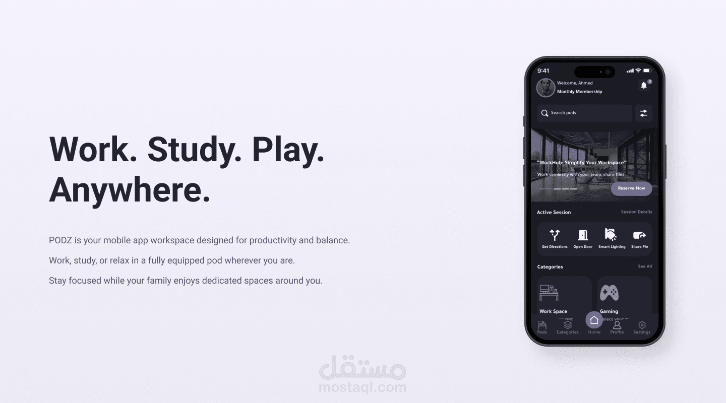 الهدف من تصميم التطبيق هو توفير حل مرن وعملي لمساحات العمل يناسب أسلوب الحياة الحديث، من خلال منصة تتيح للمستخدمين حجز وحدات عمل ذكية ومتنقلة بسهولة.