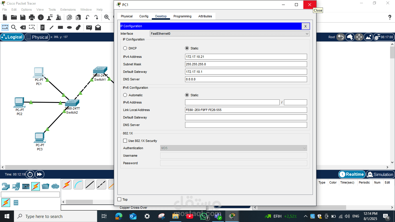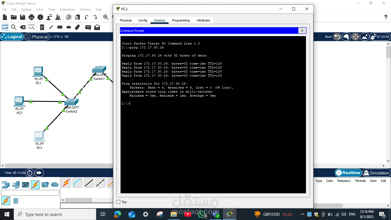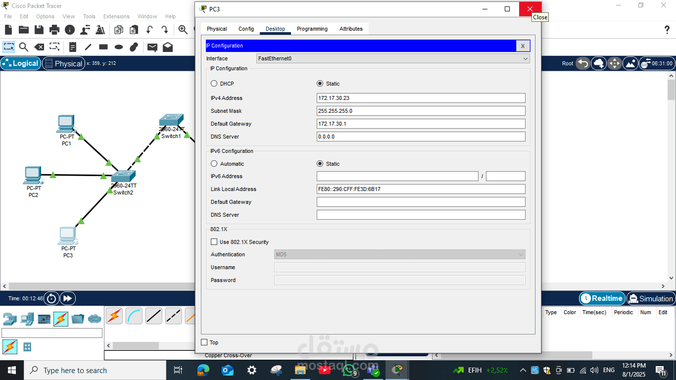 Switch 2: متصل بثلاثة أجهزة كمبيوتر (PC1، PC2، PC3)، حيث تم تكوين عناوين IP لكل جهاز ضمن نفس الشبكة الفرعية لضمان إمكانية الاتصال بينهم وبين الأجهزة الأخرى عبر Switch 1.