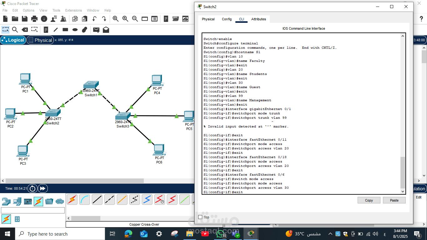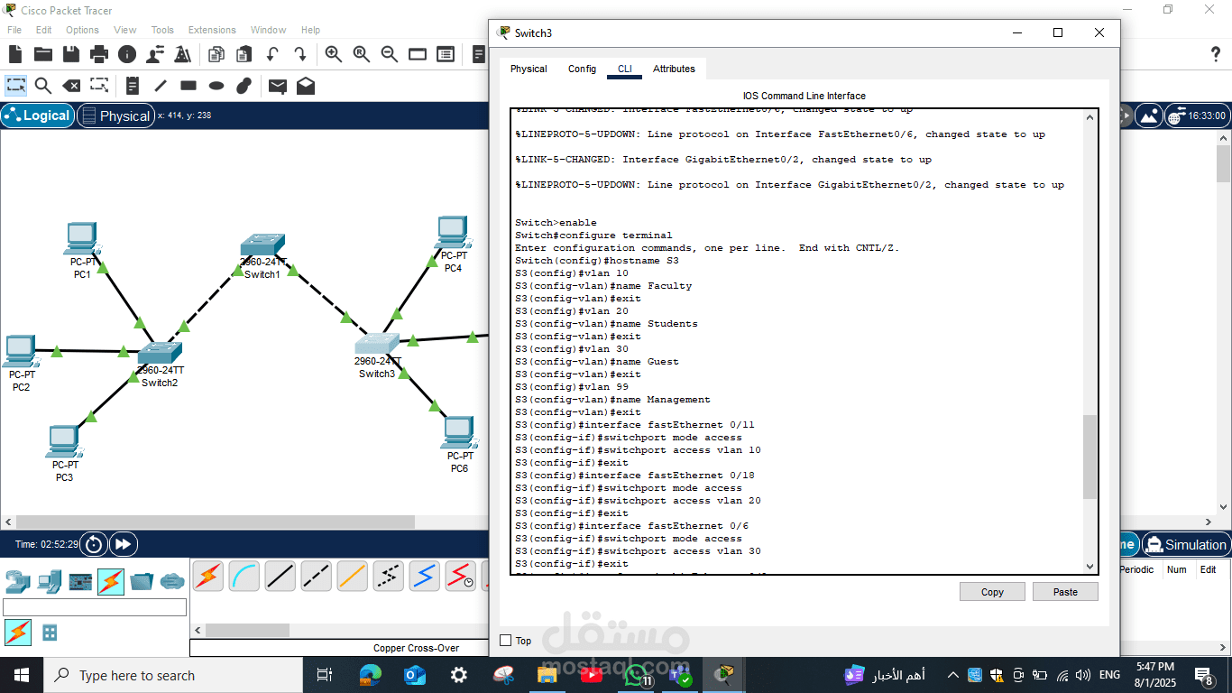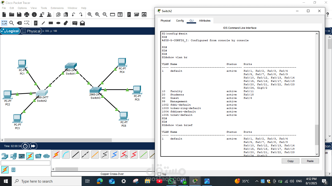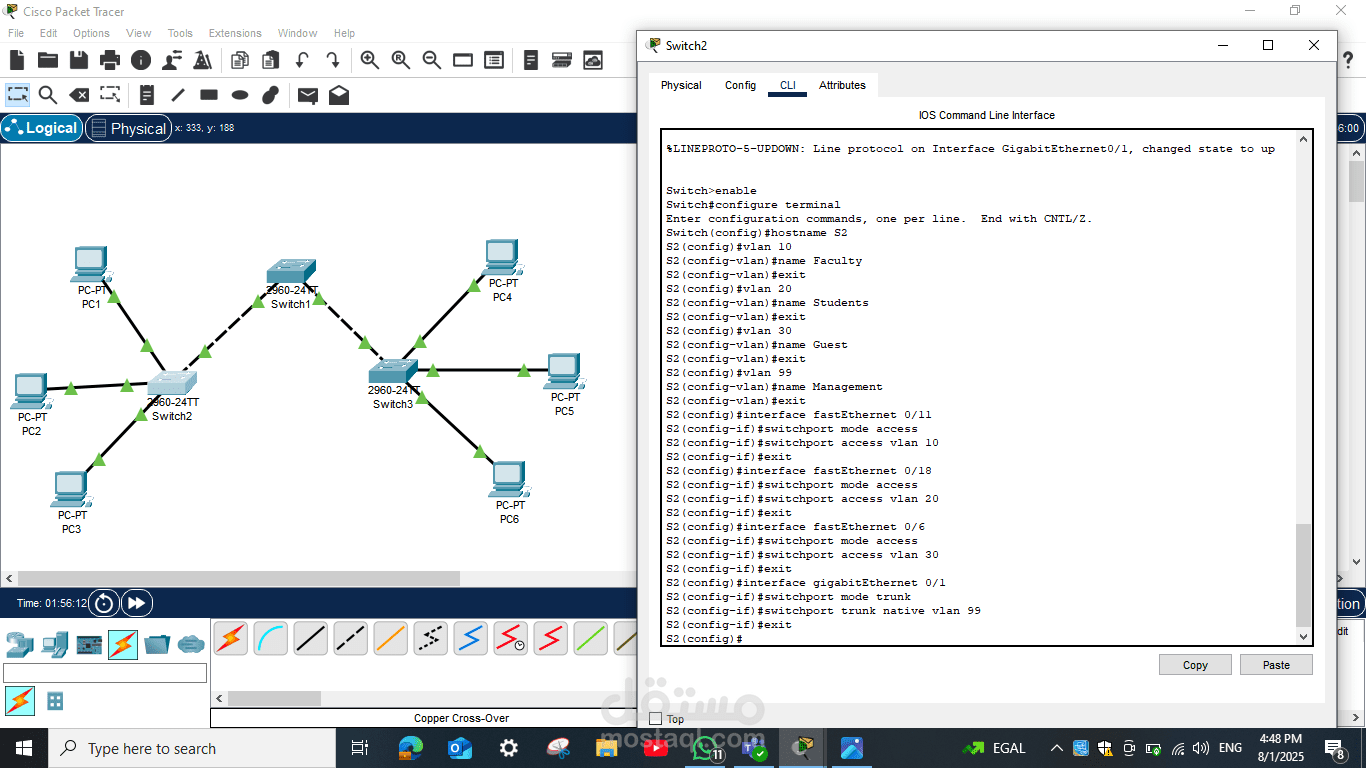 تم تنفيذ Configuration كامل للسويتشات، بما في ذلك تعيين عناوين IP على الأجهزة، إعداد الـ VLAN الافتراضية إذا لزم الأمر، وضبط الإعدادات الأساسية لكل سويتش لضمان التواصل الصحيح بين الأجهزة المختلفة.