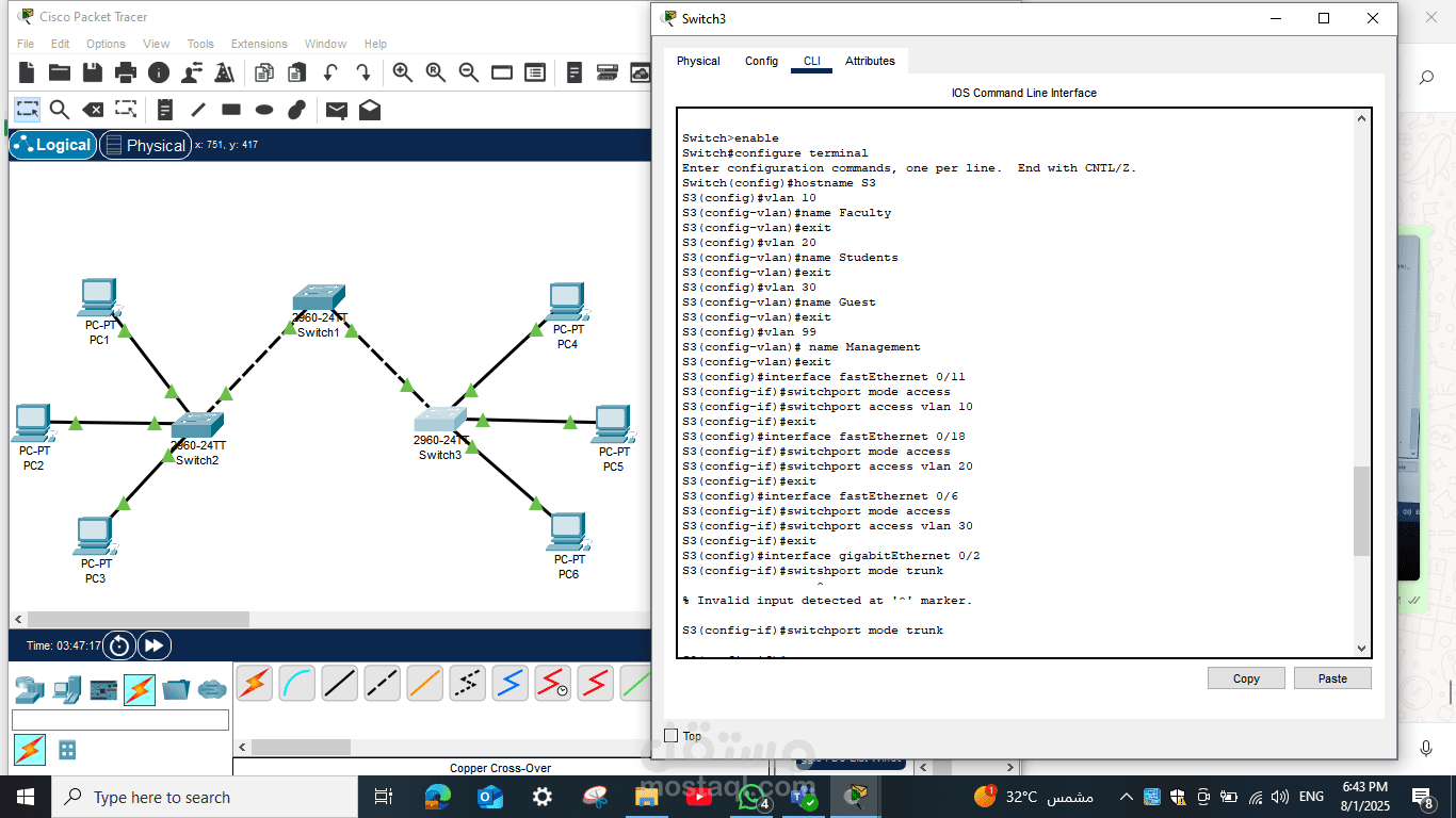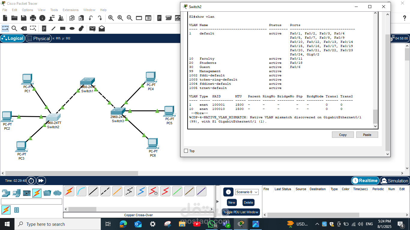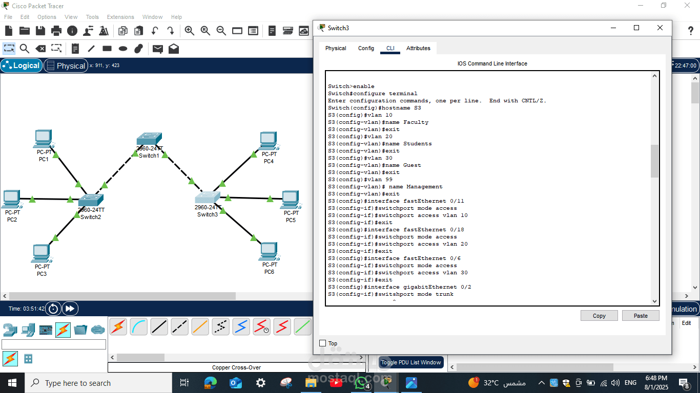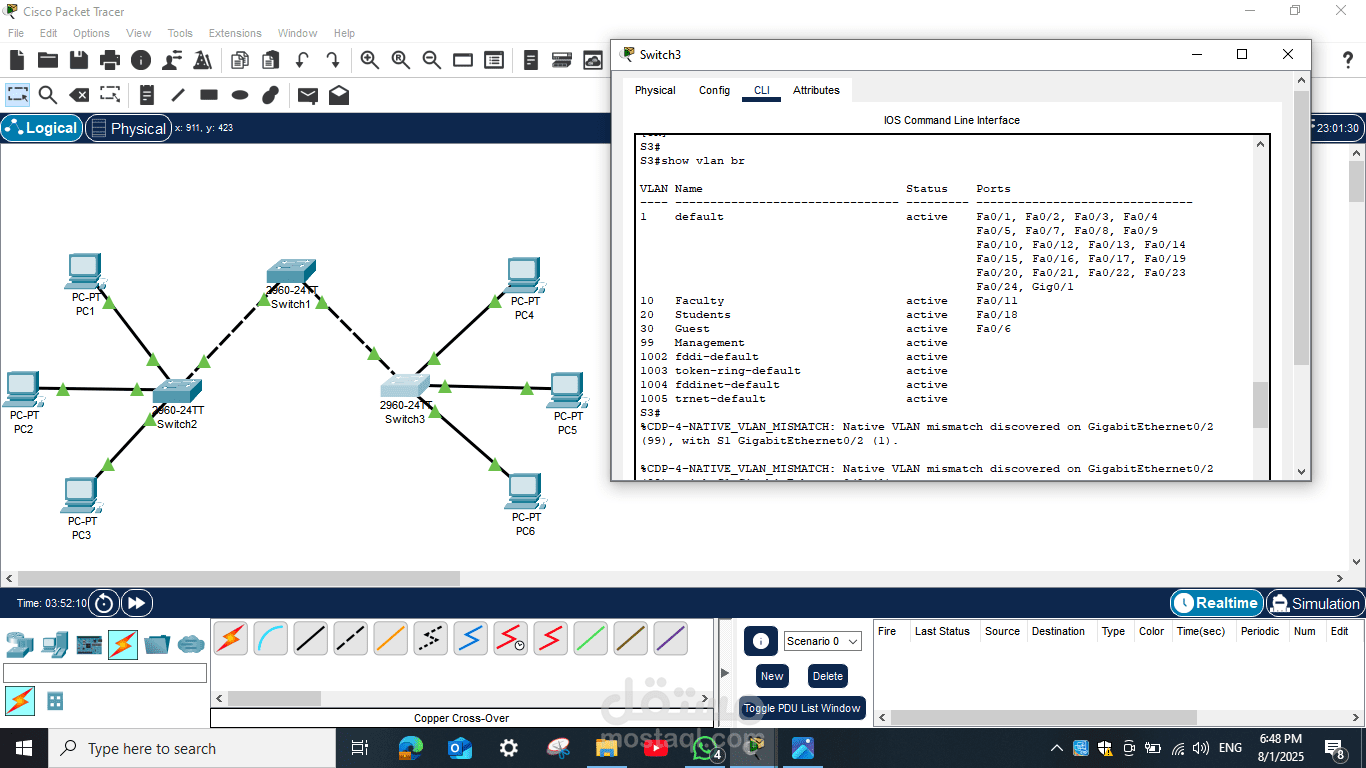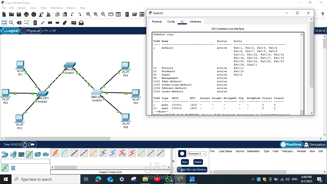 هذا المشروع يمثل مثالًا عمليًا على مهارات تصميم الشبكات، الإعدادات الأساسية للسويتشات، وإجراء اختبارات التحقق لضمان كفاءة الشبكة وسلامة الاتصال بين جميع الأجهزة.