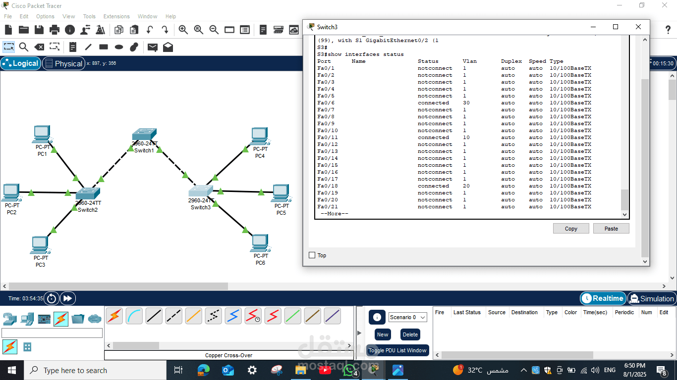 Switch 3: متصل بثلاثة أجهزة كمبيوتر إضافية (PC4، PC5، PC6) بنفس الطريقة، مع إعداد IP لكل جهاز لضمان الاتصال الكامل بين جميع الأجهزة.