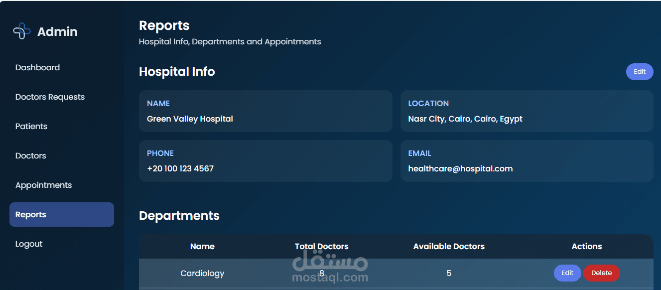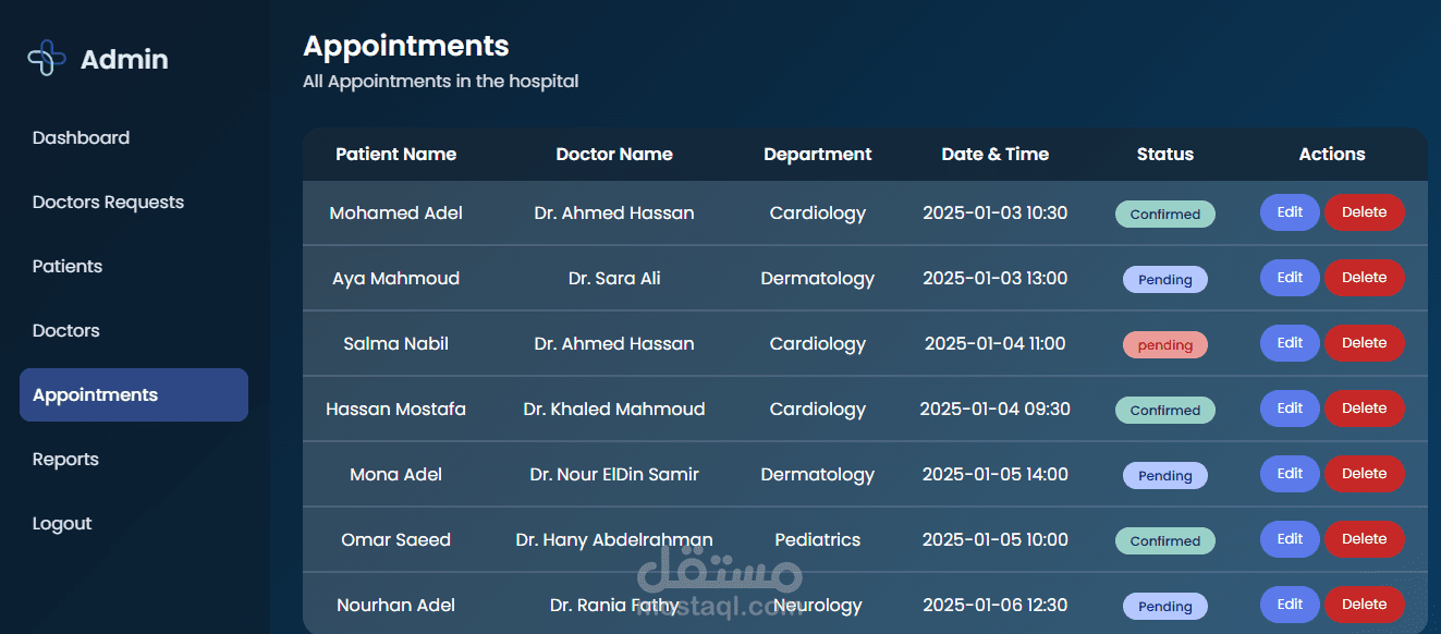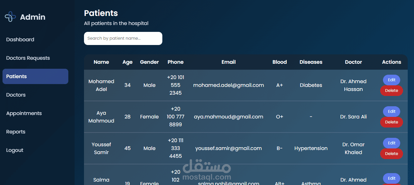 إدارة المرضى: إضافة، تعديل، حذف، وعرض بيانات المرضى