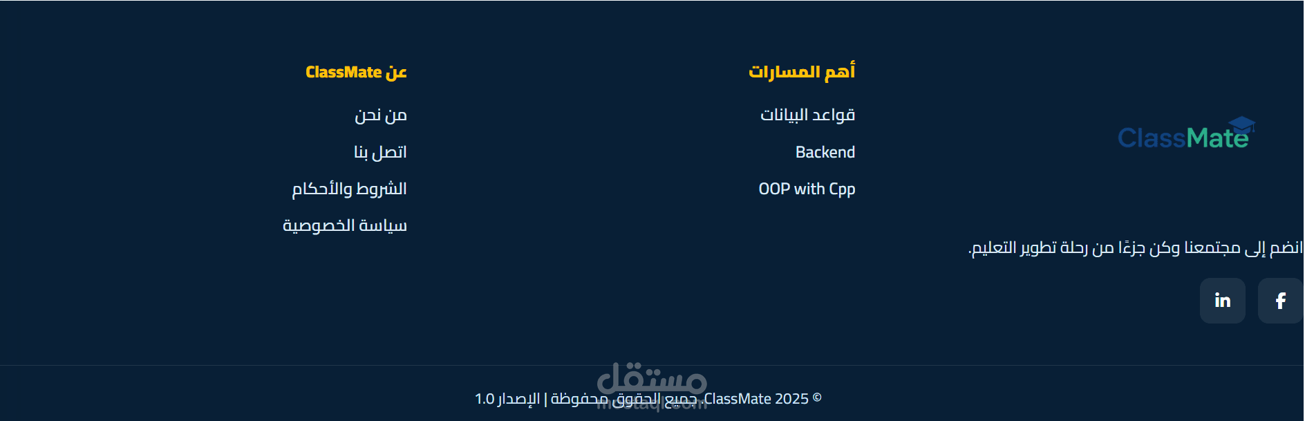 ClassMate هو منصة تعليمية متكاملة موجهة لطلاب كلية الحاسبات والمعلومات، تهدف إلى تسهيل الوصول لكل ما يحتاجه الطالب خلال رحلته الدراسية. يوفّر المشروع محتوى تعليمي منظم يشمل المنهج الدراسي، الامتحانات السابقة، الكورسات، والمواد التعليمية في مكان واحد.