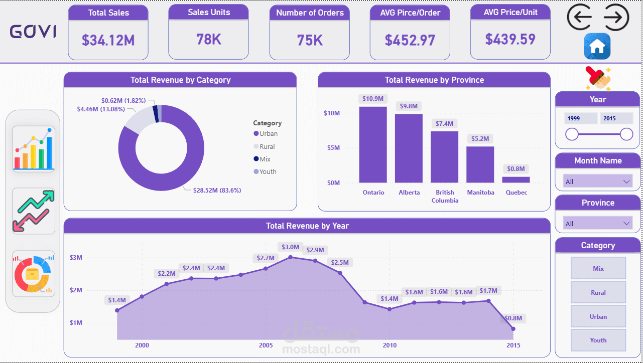 The organization has generated $34.12M in total revenue over the reporting period (1999–2015). The data indicates a business that reached a maturity peak around 2007 but has since entered a significant decline phase. Current Year (CY) performance is trailing Last Year (LY) across major metrics, indicating a need for urgent strategic intervention. The revenue stream is heavily reliant on a single category ("Mix") and two specific provinces (Ontario and Alberta), representing a high concentration risk.