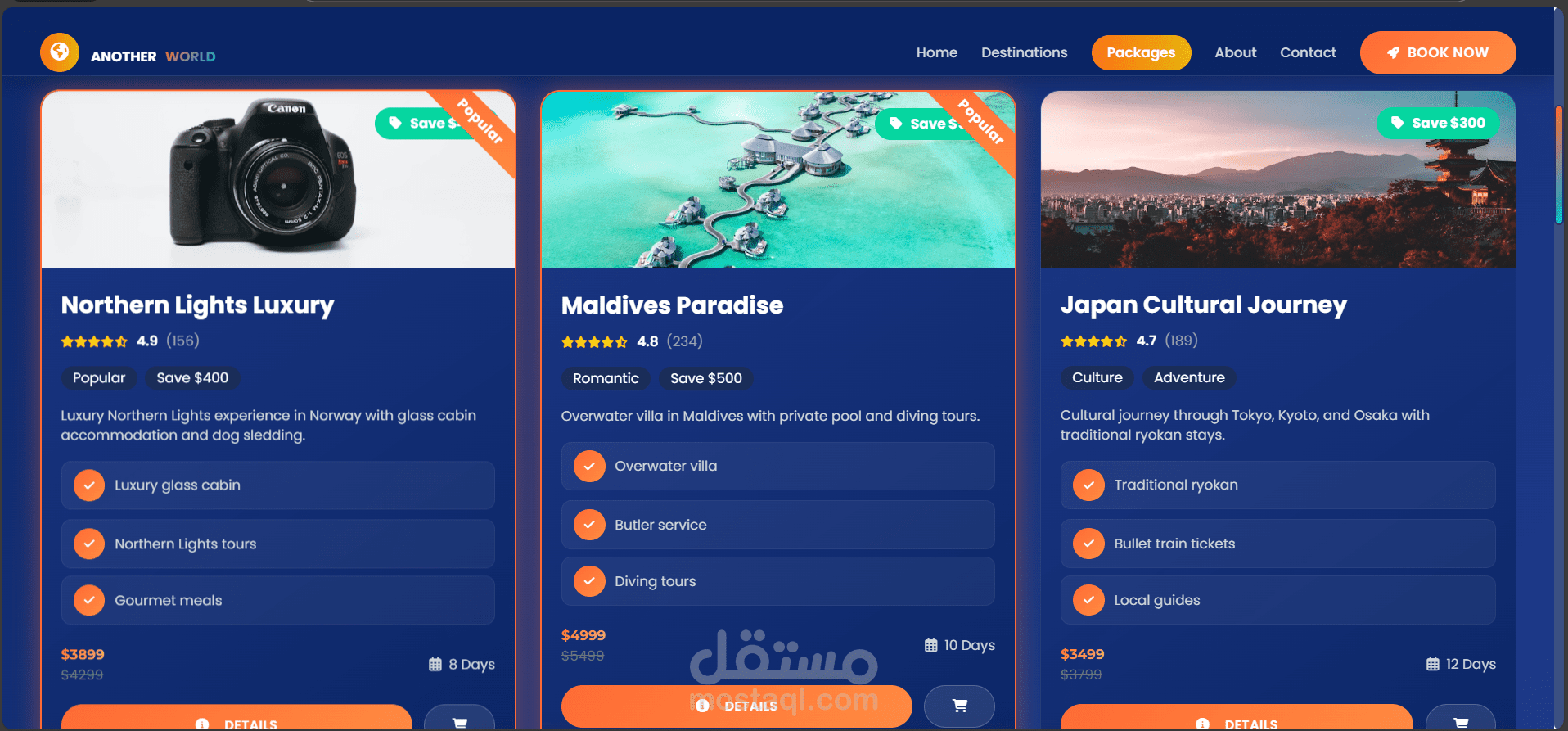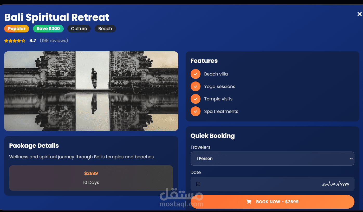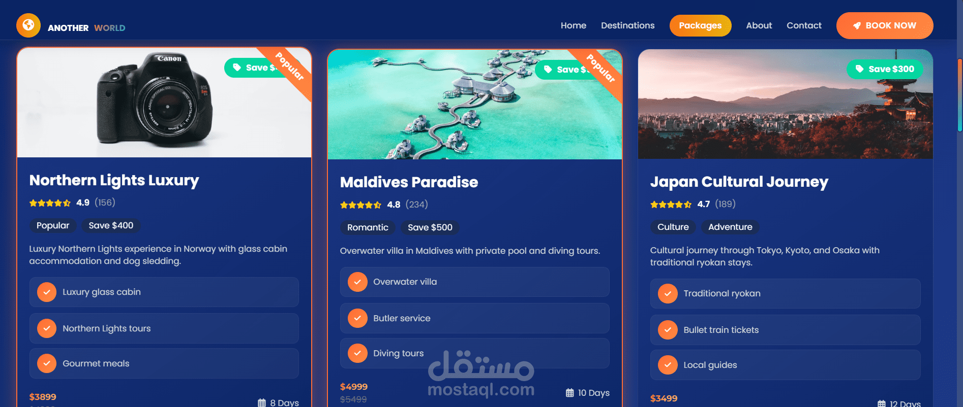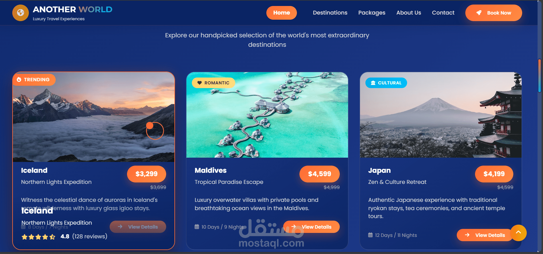 موقع سياحي فاخر وعصري تم تصميمه لتقديم تجربة مستخدم سلسة وغامرة لخدمات السياحة الراقية. تم تنفيذ المشروع باستخدام HTML وCSS وJavaScript، مع التركيز على تصميم واجهة وتجربة مستخدم نظيفة، أداء عالٍ، وتجاوب كامل مع جميع الأجهزة.