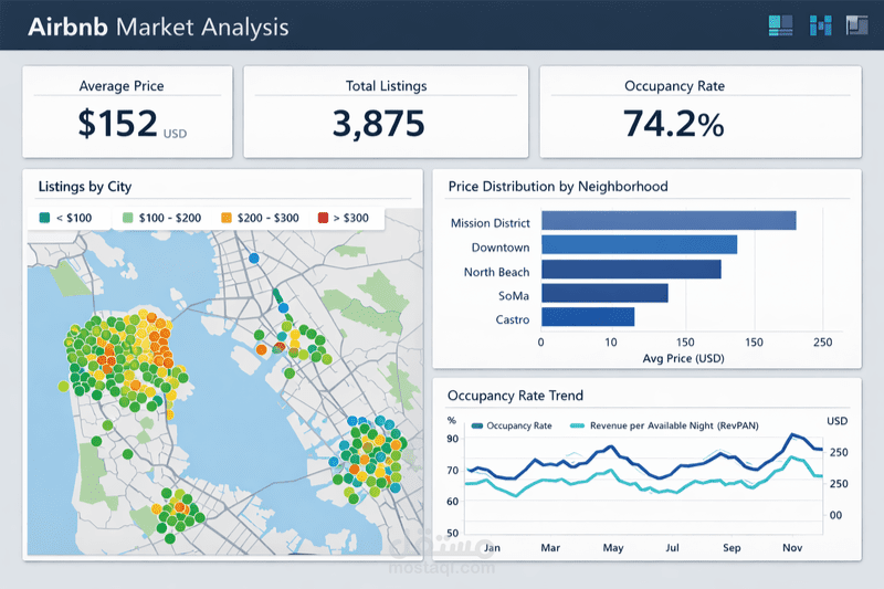 لوحة قياس Power BI شاملة لتحليل قوائم Airbnb، واتجاهات الأسعار، وديناميكيات السوق عبر مدن متعددة.