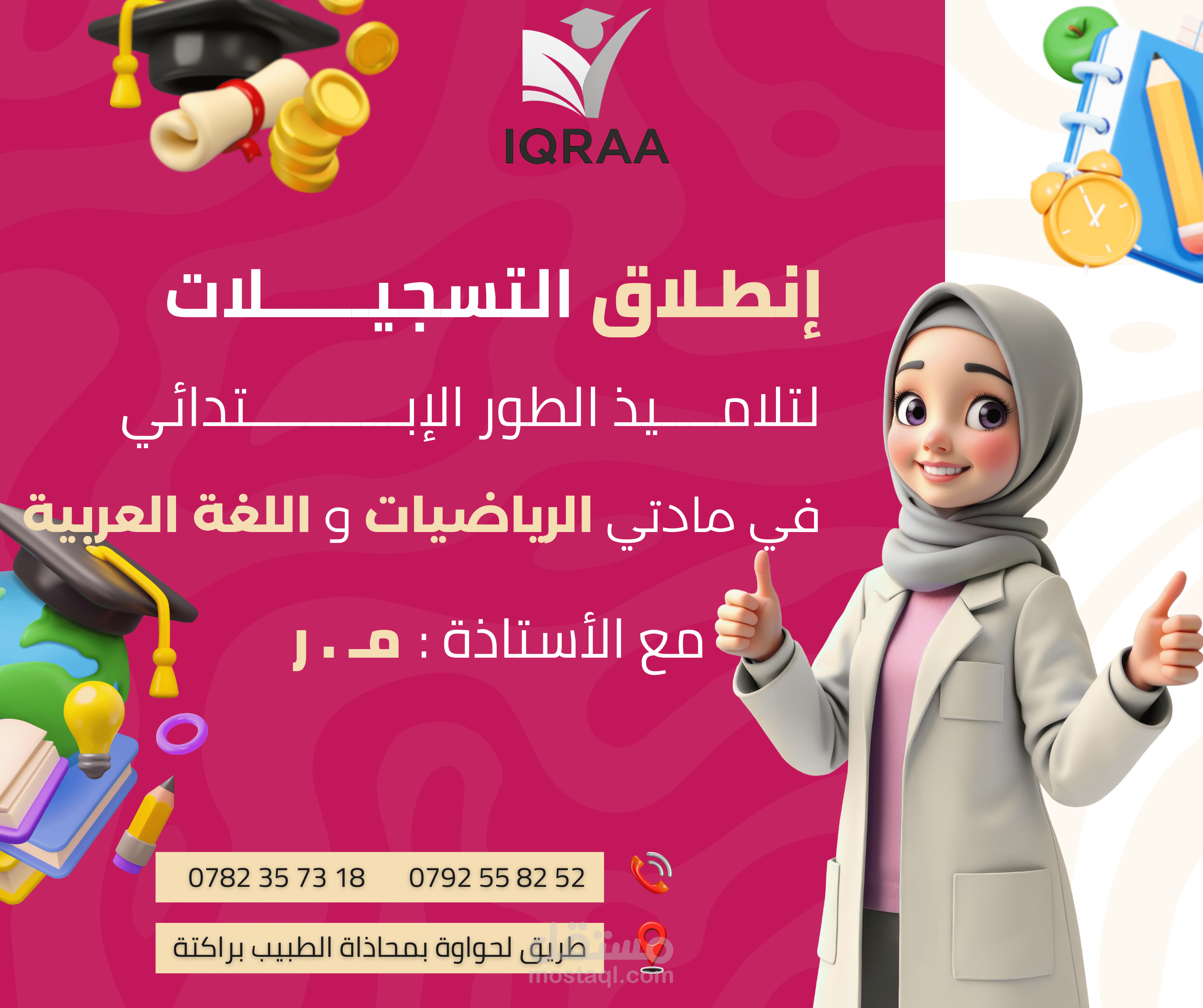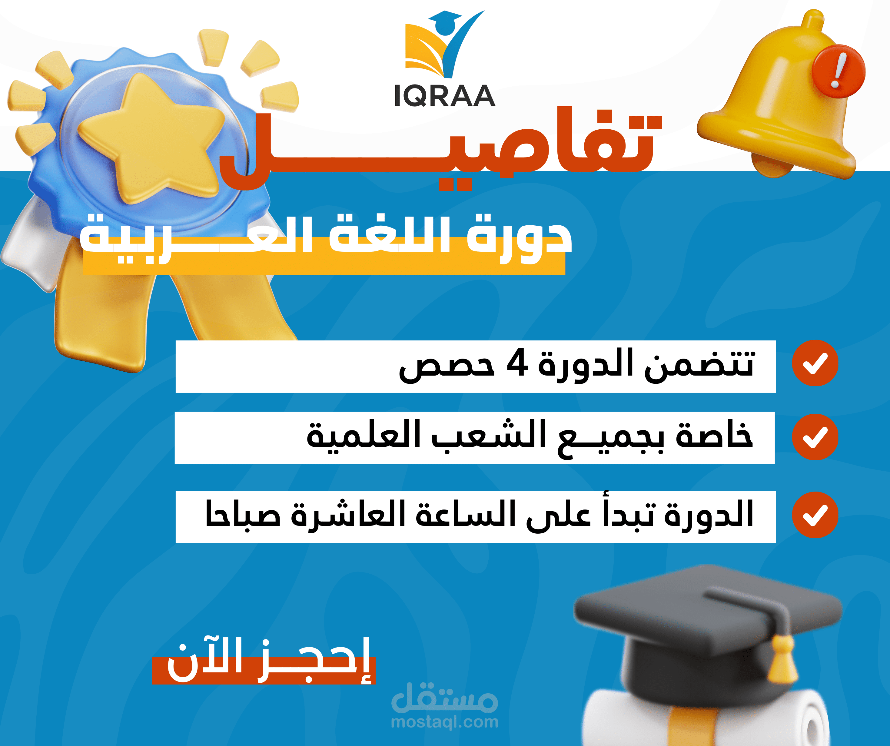 قمت بتصميم إعلان جذاب وبسيط لدورة في اللغة العربية، يبرز أهم مميزات الدورة، مواعيدها، ومعلومات التواصل بشكل منظم وواضح.