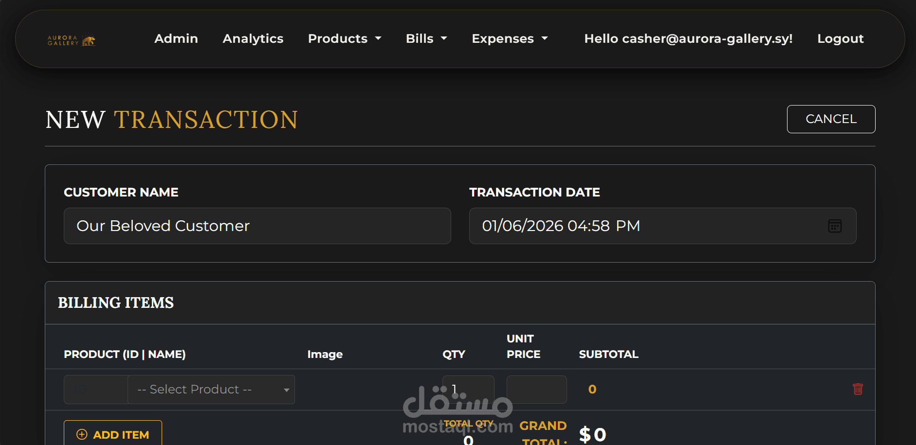 Aurora-Gallery.sy هو نظام متكامل لإدارة التجارة الإلكترونية والتجزئة، يتميز ببنية إدارية متطورة متعددة الأدوار. تدمج المنصة واجهة متجر راقية مع لوحة تحكم قوية على غرار أنظمة تخطيط موارد المؤسسات (ERP)، مما يتيح للمسؤولين الإشراف على المنتجات، وتتبع نفقات العمل، وإجراء تحليلات بيانات معمقة. ومن أبرز ميزاته نظام التحكم في الوصول القائم على الأدوار (RBAC)، الذي يُحسّن سير العمل من خلال تقييد صلاحيات أمناء الصندوق بوظائف المبيعات الأساسية مثل "إنشاء الفواتير"، مع منح المسؤول الرئيسي صلاحيات تحكم كاملة في بنية النظام. كما تتميز المنصة بمحرك فوترة مُخصّص، يُنتج فواتير تحمل العلامة التجارية بشكل أنيق، مصممة خصيصًا لعرضها بشكل احترافي على العملاء. وبفضل الجمع بين التتبع المالي وصلاحيات المستخدمين الدقيقة، تُقدّم Aurora-Gallery نفسها كمعرض تجاري تفاعلي للعملاء، وأداة متكاملة لإدارة عمليات الأعمال.