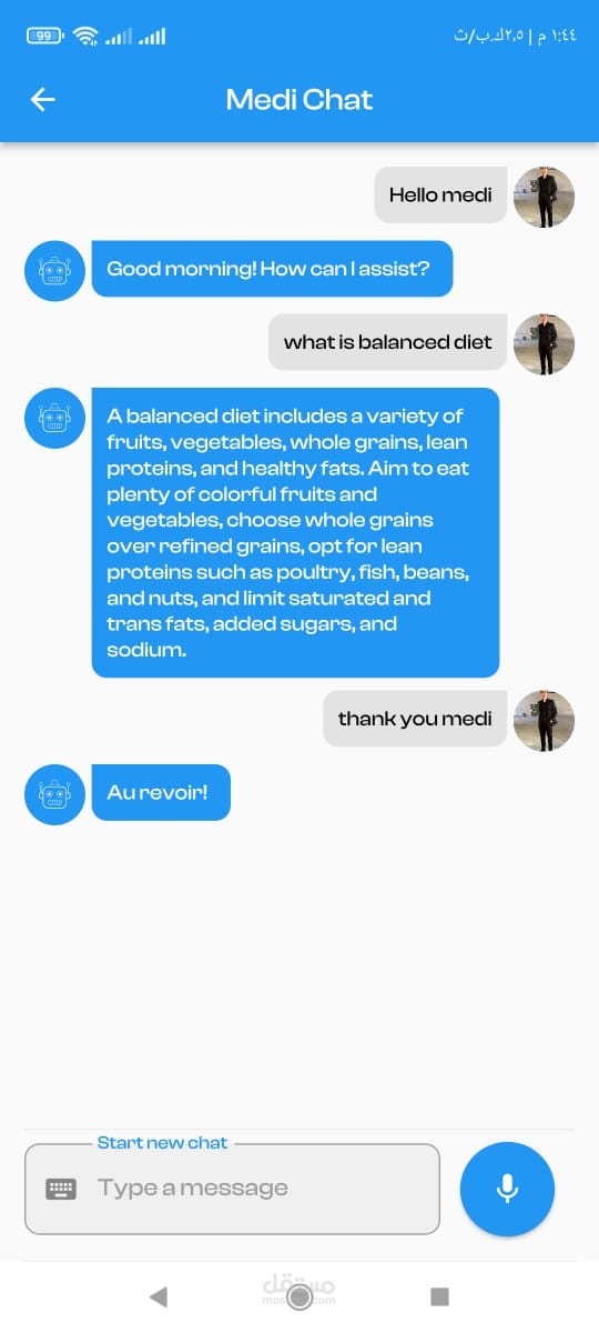2. Chatbot Interface: The heart of the application is the interactive chatbot interface, where users can engage in conversations with Medi. The chatbot utilizes natural language processing (NLP) algorithms to understand user queries and provide accurate responses, the medical chatbot in the Flutter application, offers users the convenience of interacting through both text and voice inputs. Users can engage in conversations with Medi by typing their queries or speaking to the chatbot using voice commands. This versatile interaction capability ensures a seamless and user-friendly experience for individuals seeking medical assistance and information.
