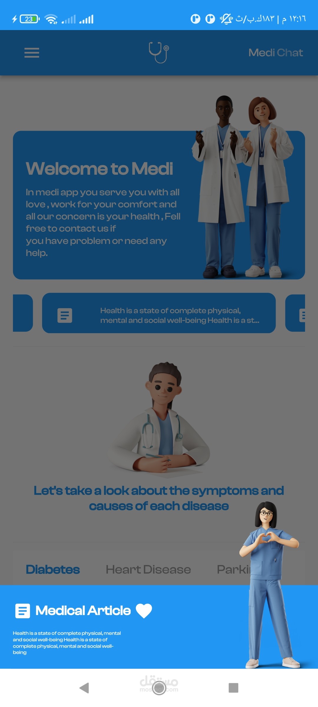 3. Disease Prediction: Medi incorporates machine learning models trained to predict the likelihood of various diseases. Users can input relevant health data, and the application will utilize these inputs to generate predictions for specific conditions.