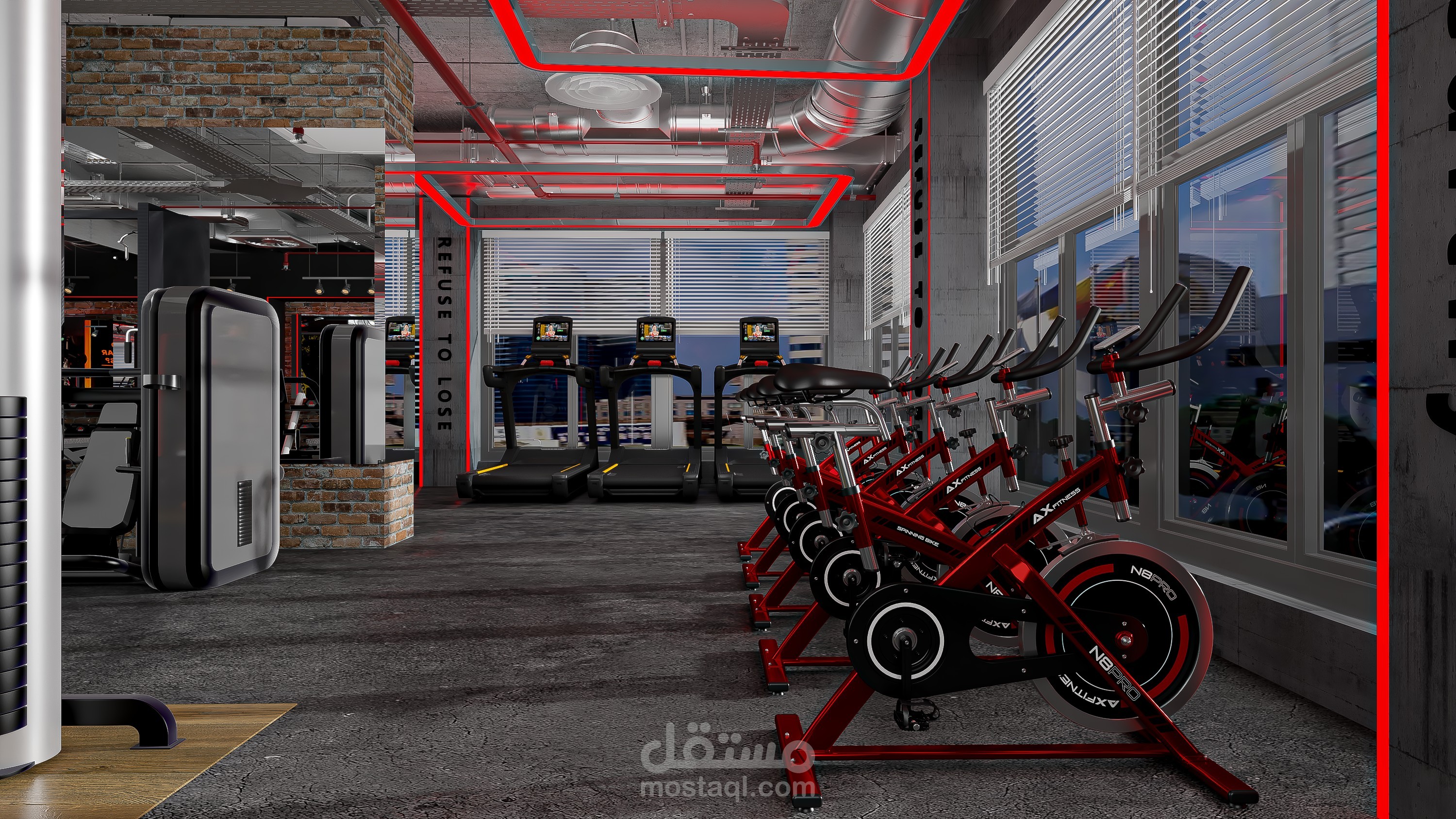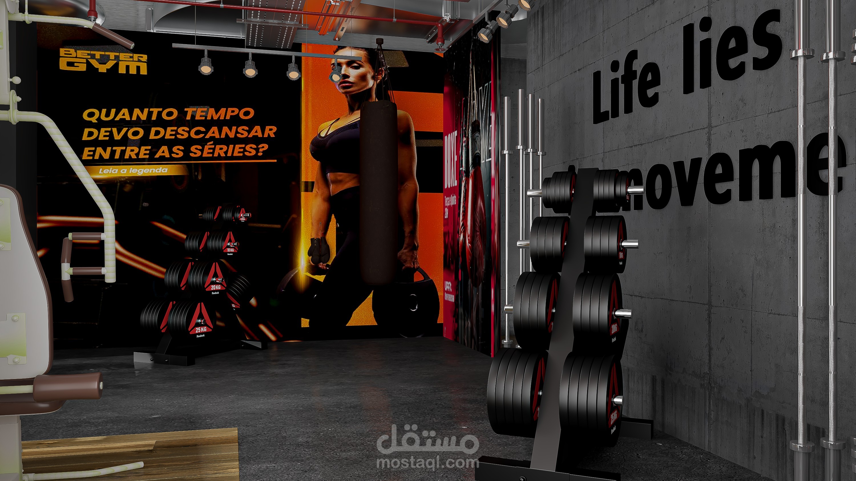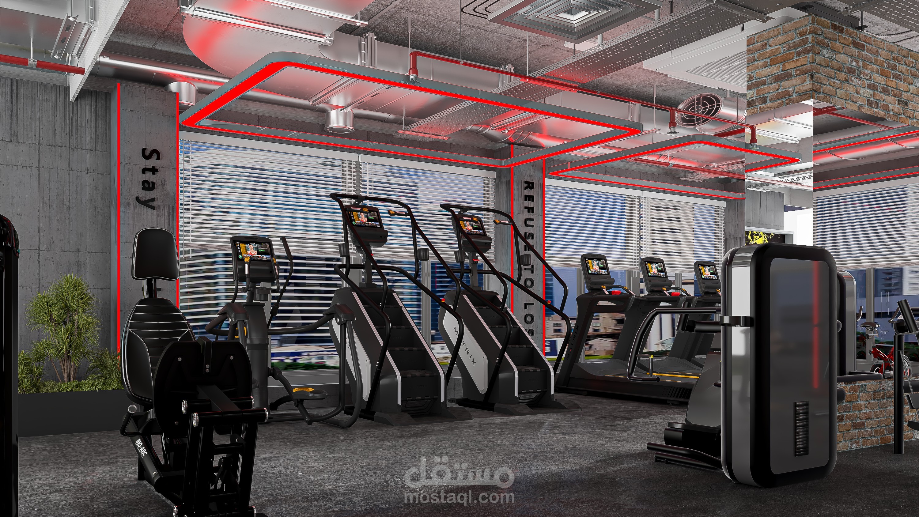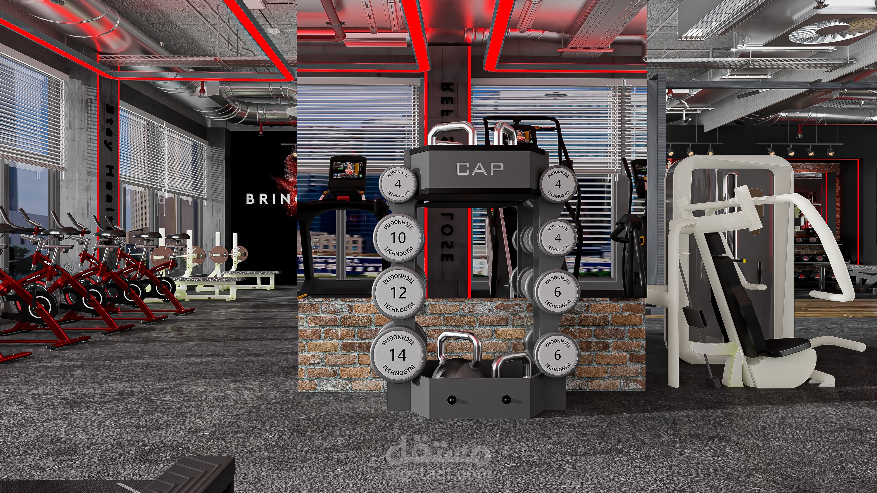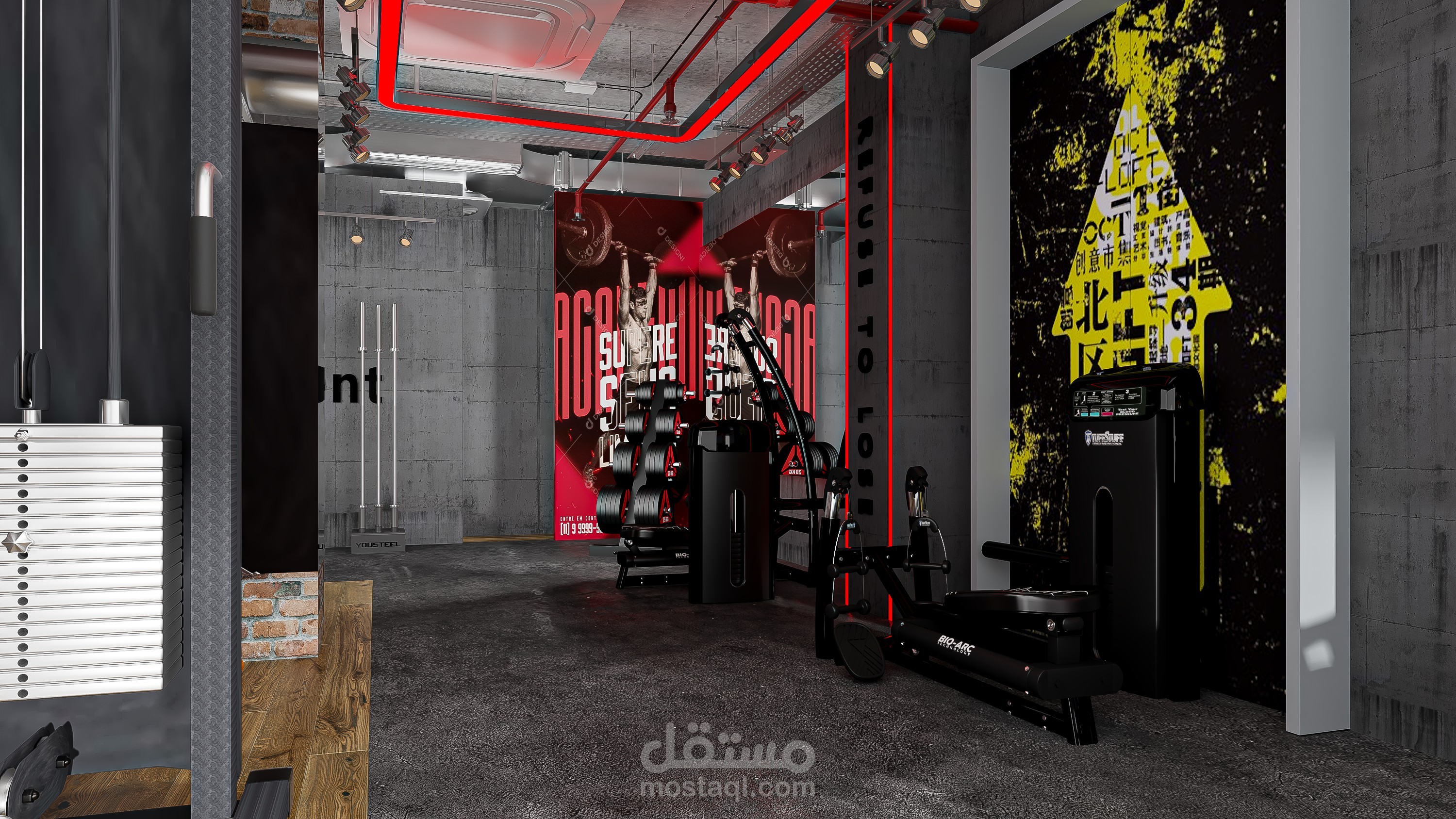 An industrial-style gym scene featuring exposed concrete ceilings, visible metal ductwork, brick accent walls, black steel gym equipment, and rubber flooring with wood-look zones. The space is enhanced with industrial lighting, mirrors, and bold graphic posters for a high-energy atmosphere.