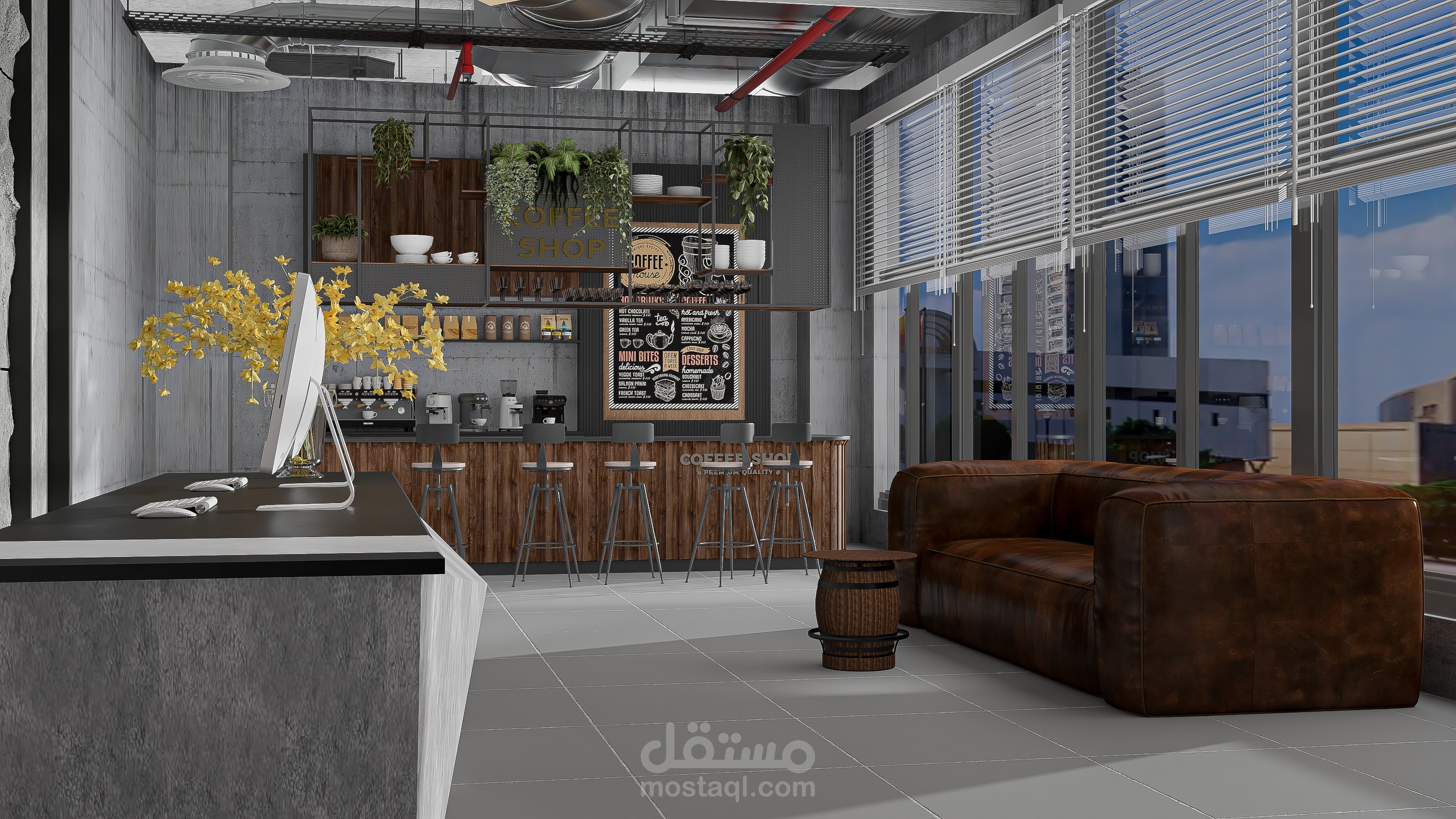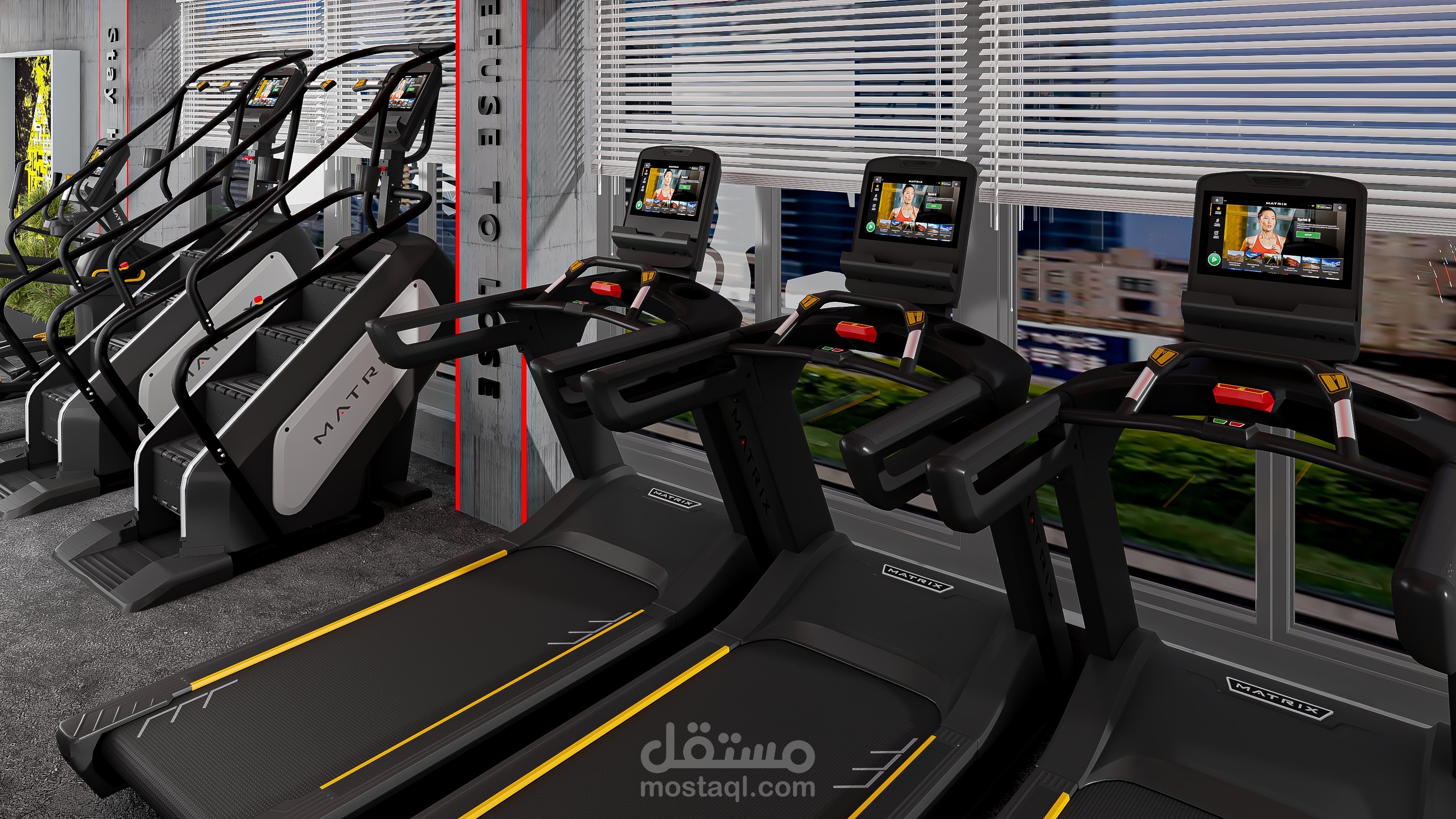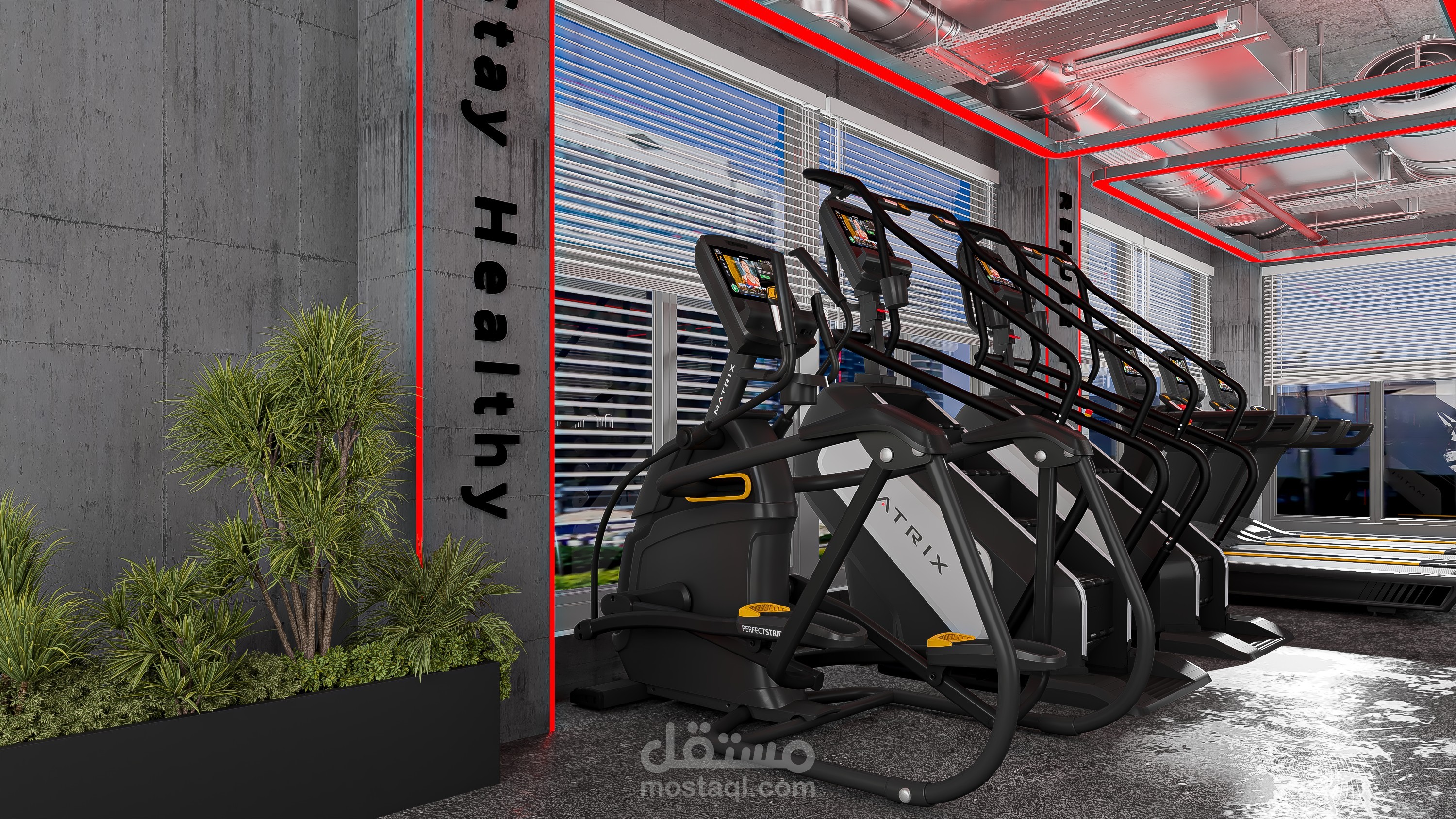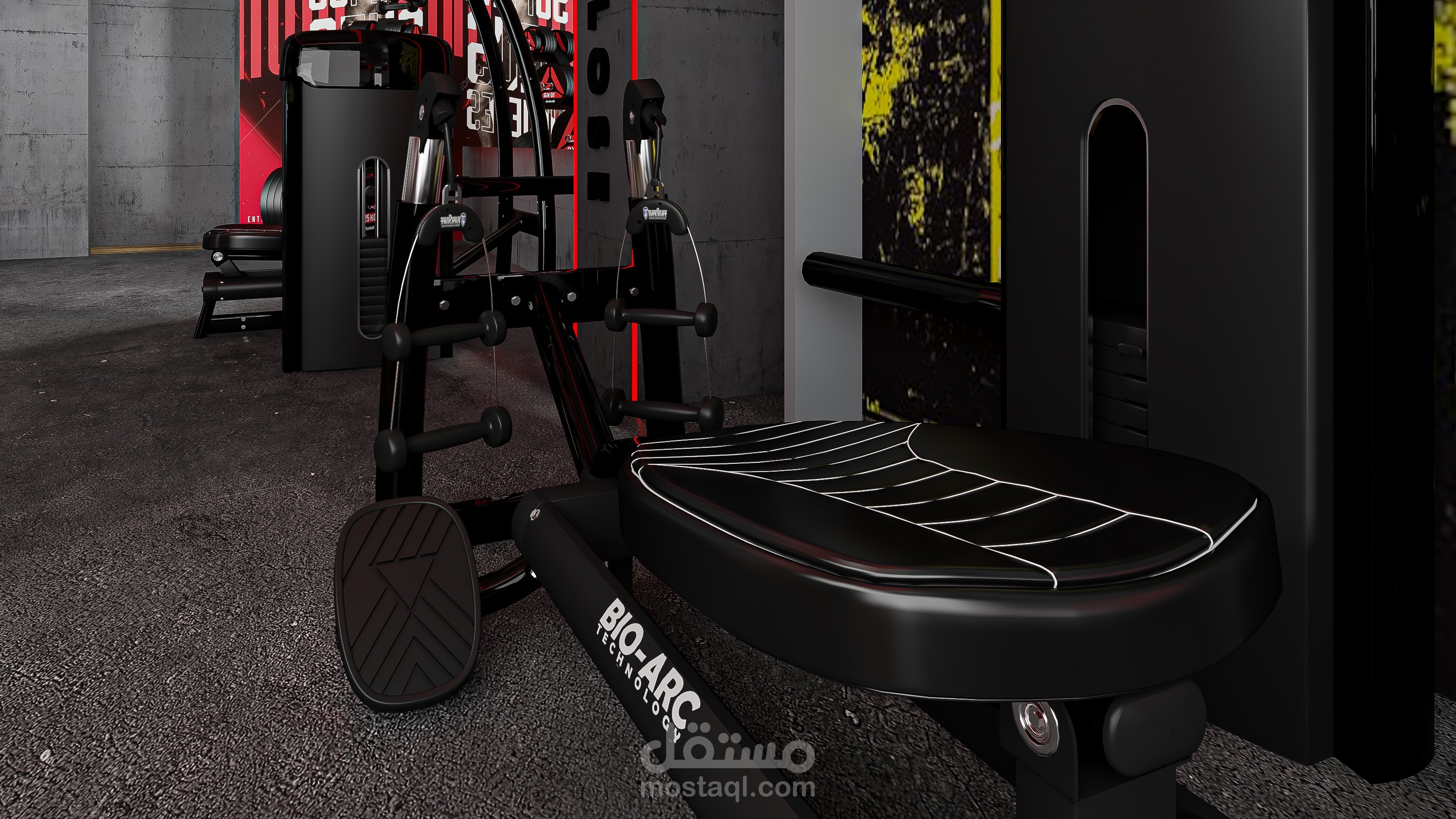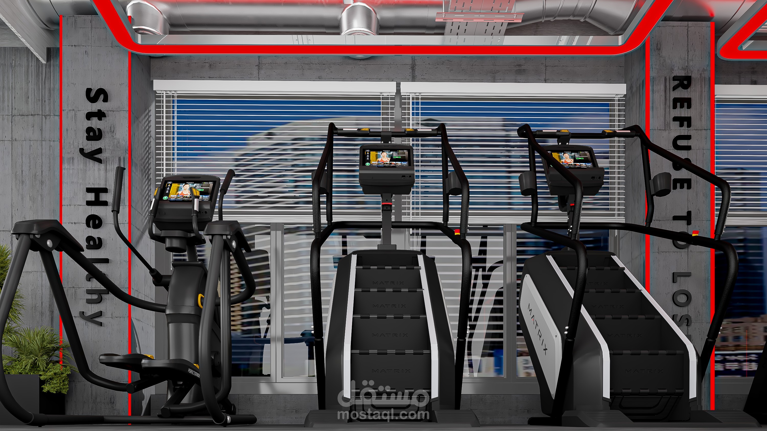 An industrial-style gym scene featuring exposed concrete ceilings, visible metal ductwork, brick accent walls, black steel gym equipment, and rubber flooring with wood-look zones. The space is enhanced with industrial lighting, mirrors, and bold graphic posters for a high-energy atmosphere.
