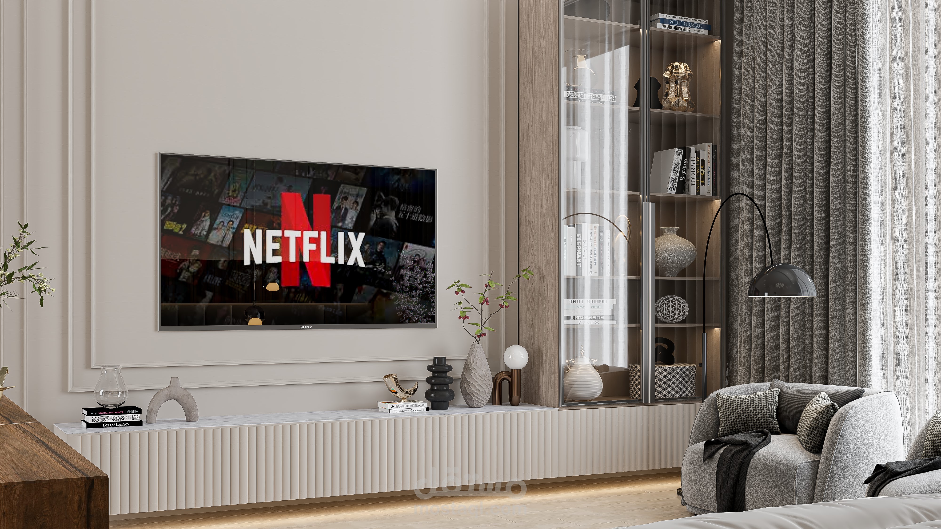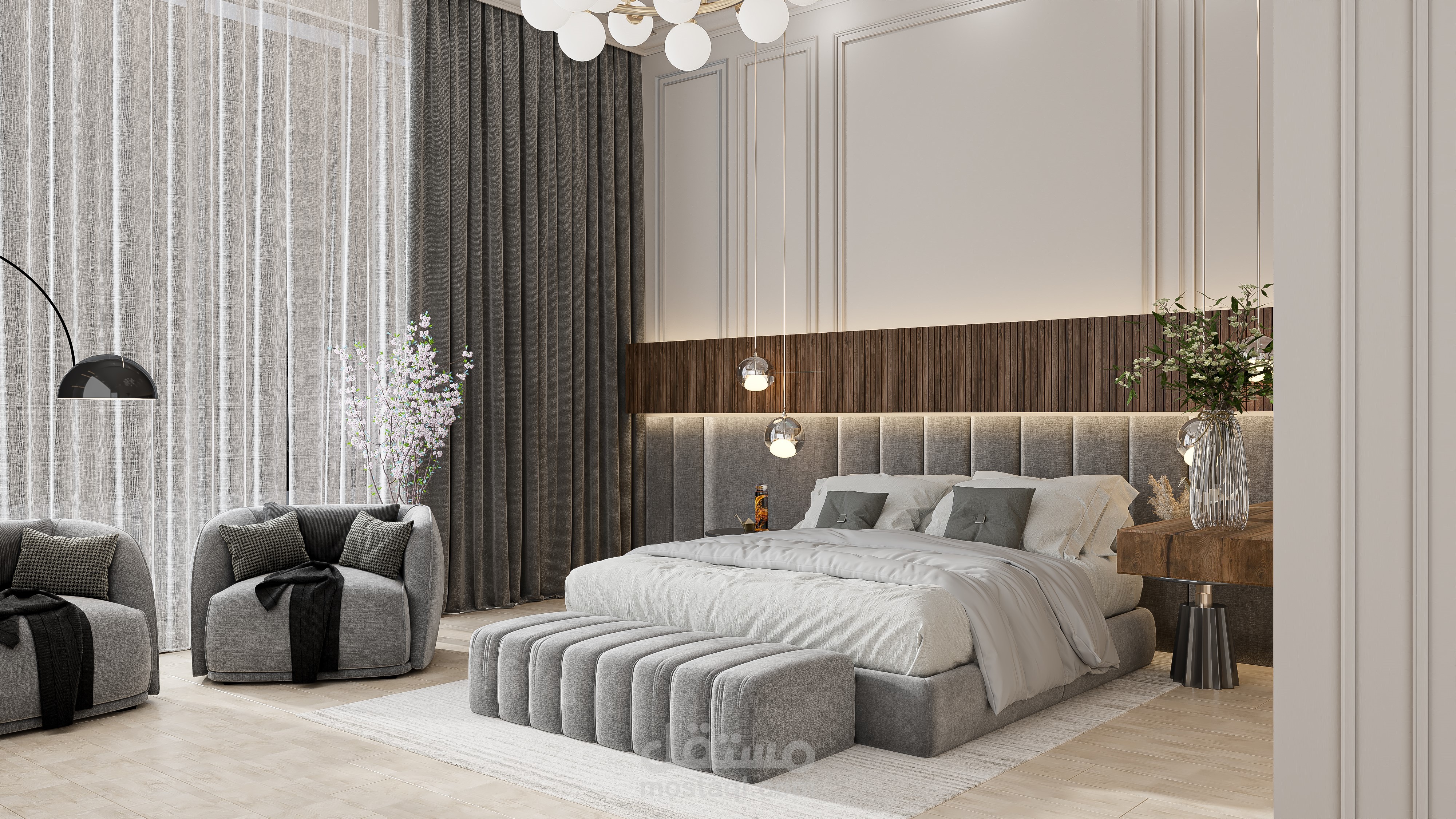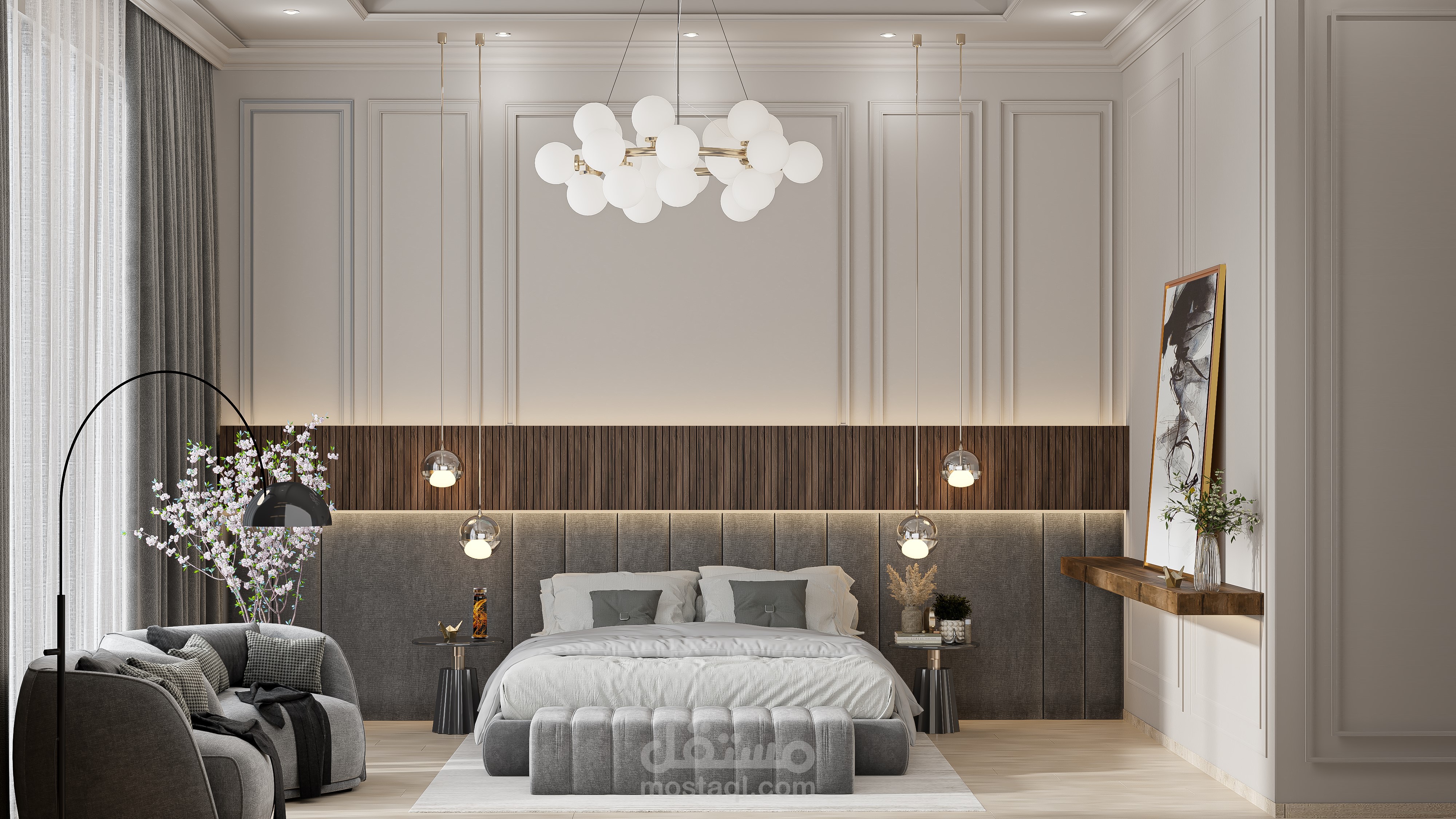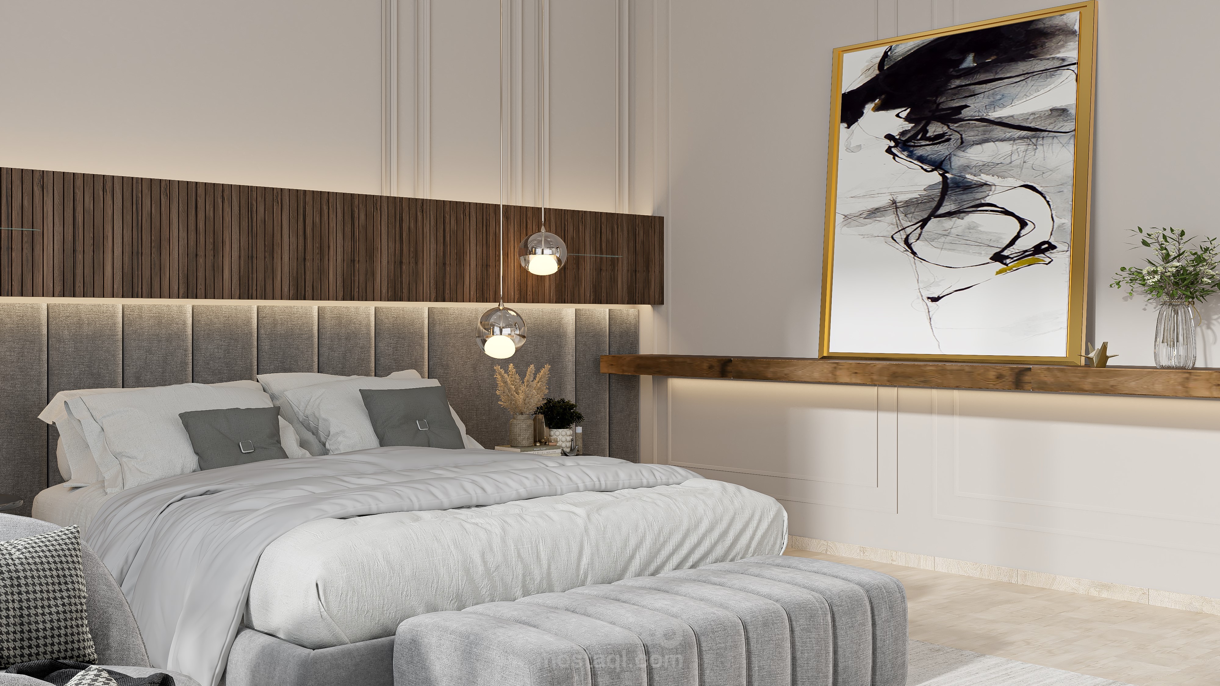 This bedroom design embraces a refined Neo-Classical style, blending timeless elegance with contemporary comfort. The space features classic wall paneling (feutec panels) that add depth and sophistication, complemented by rich wood cladding behind the bed for a sense of warmth and contrast. The bed wall combines vertical upholstered panels and integrated lighting to enhance the ambiance. A minimal wooden shelf holds a modern art piece and accessories, adding a personal touch. The soft grey and beige palette, along with carefully selected textures, brings balance between traditional charm and modern simplicity. Decorative lighting fixtures and luxurious fabrics complete the look, creating a calm and stylish retreat.
