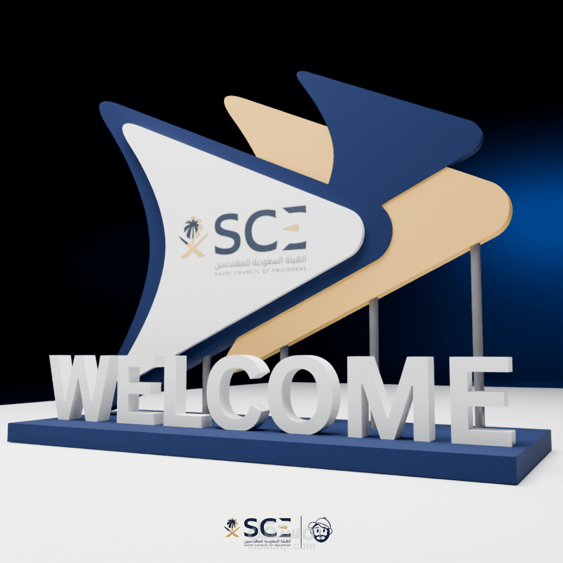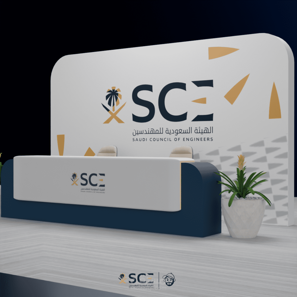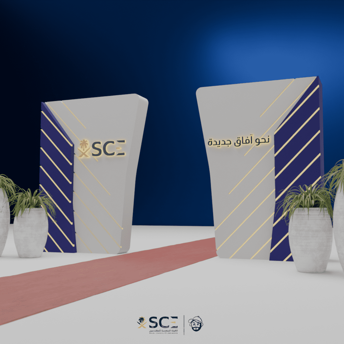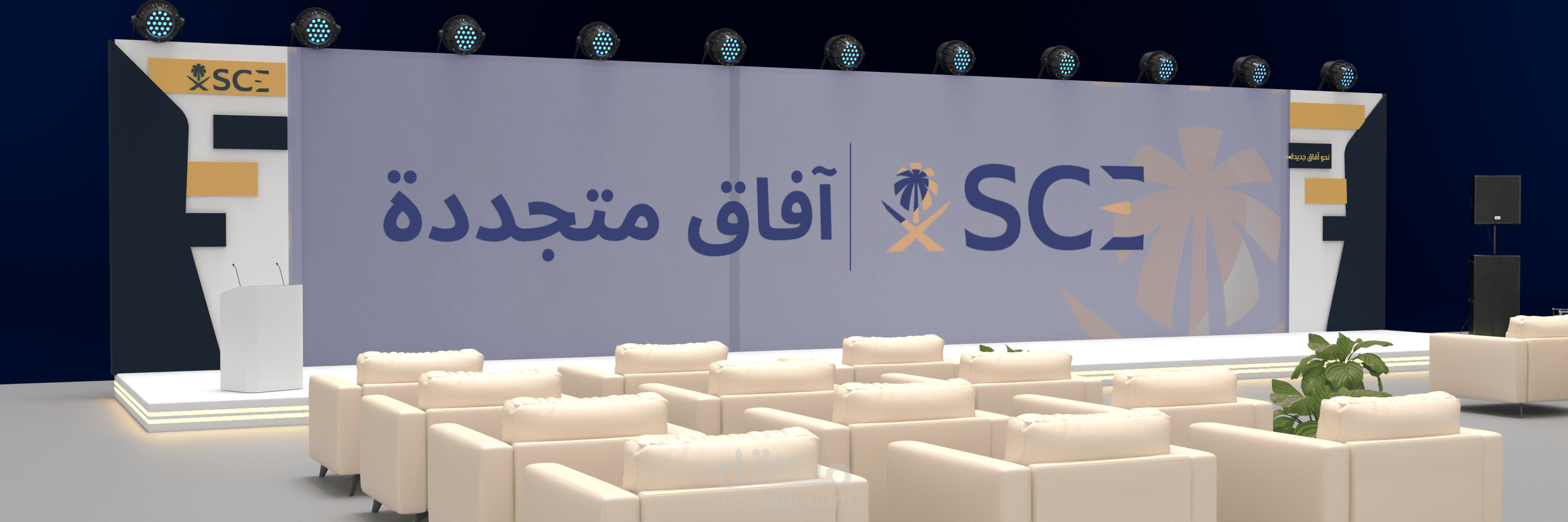 تصور ثلاثي الأبعاد لفعالية احترافية يشمل تصميم المسرح، مناطق الضيافة، أماكن الراحة، وعناصر الإرشاد، مع تخطيط ذكي للمساحات يضمن تجربة سلسة وواضحة للزوار.