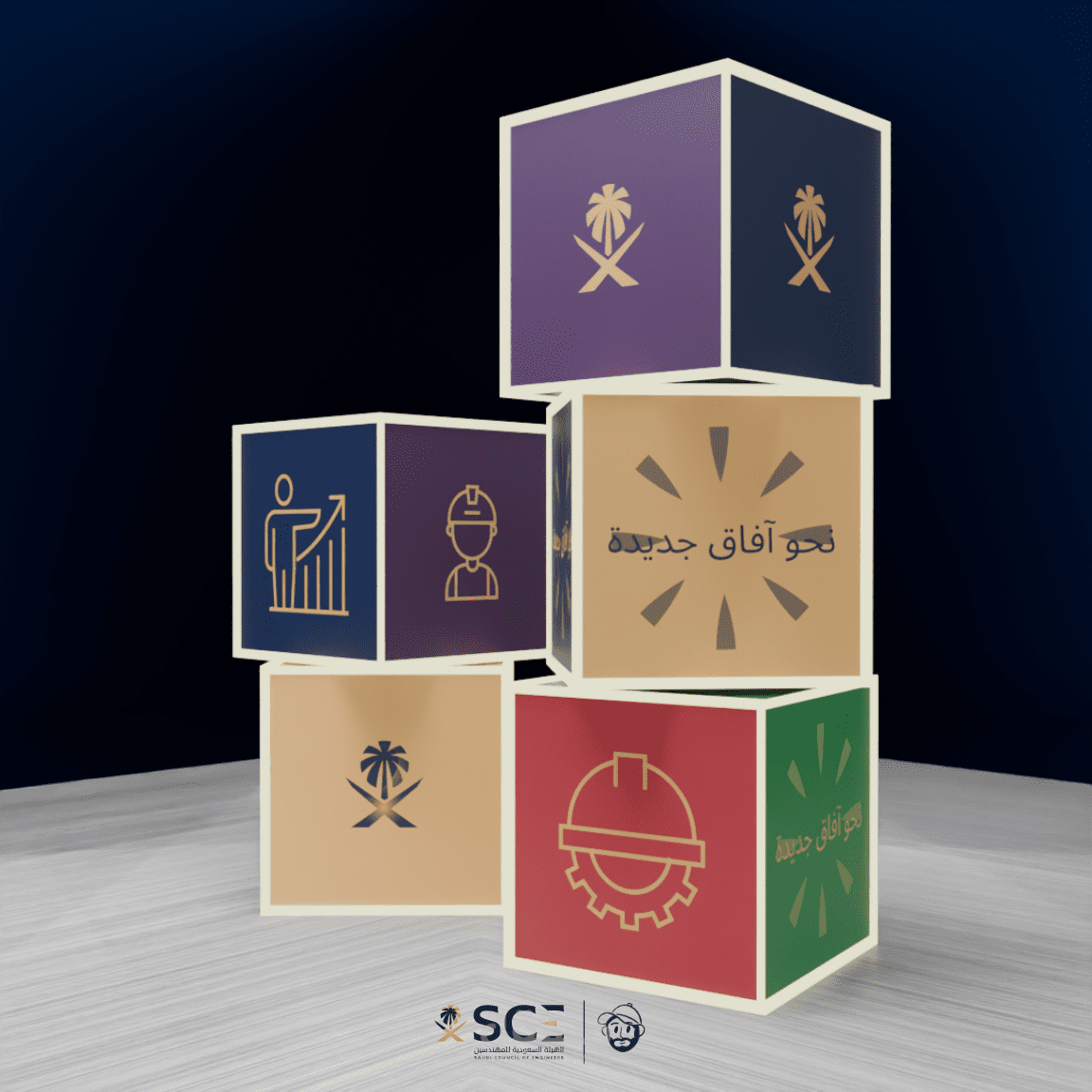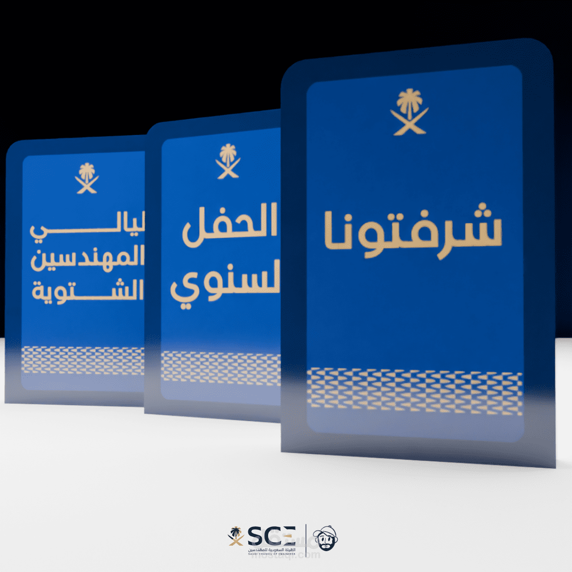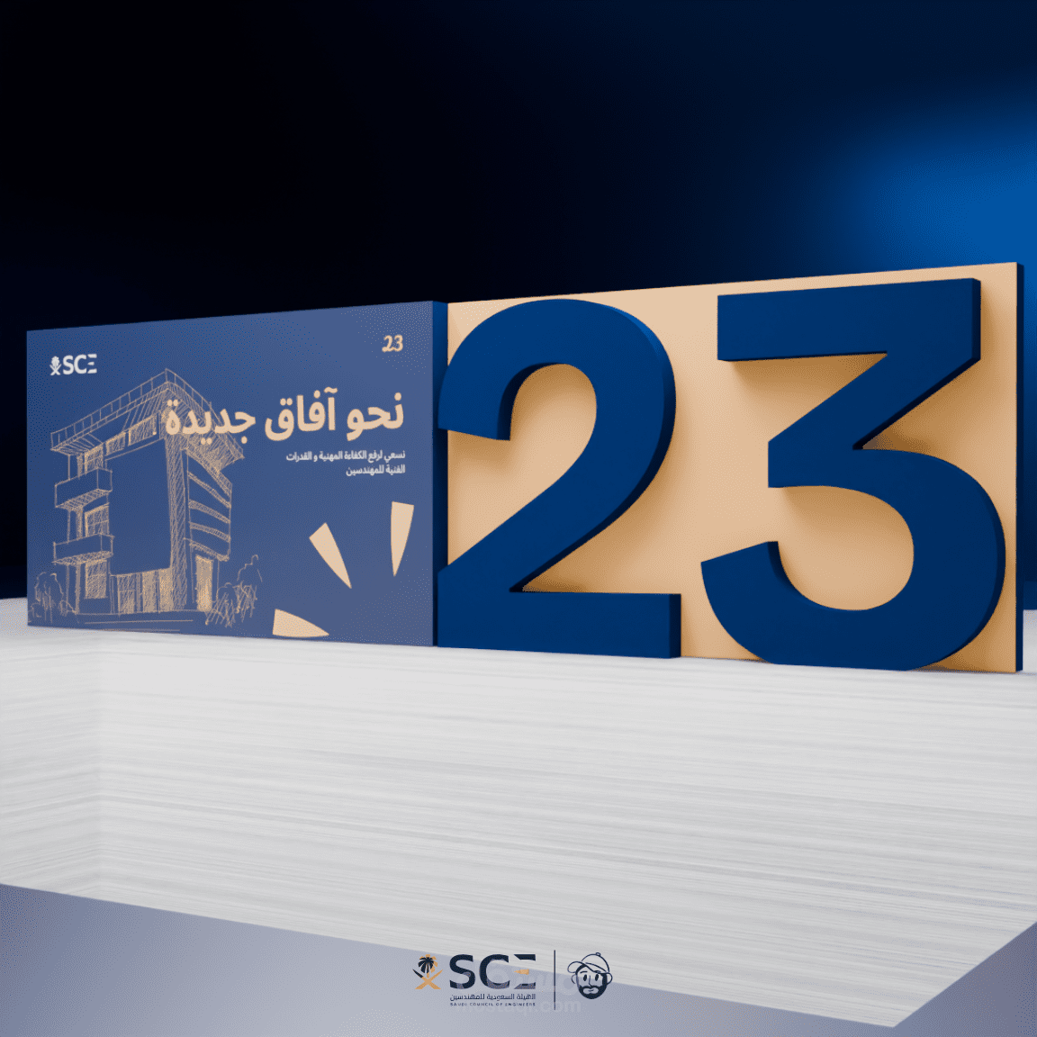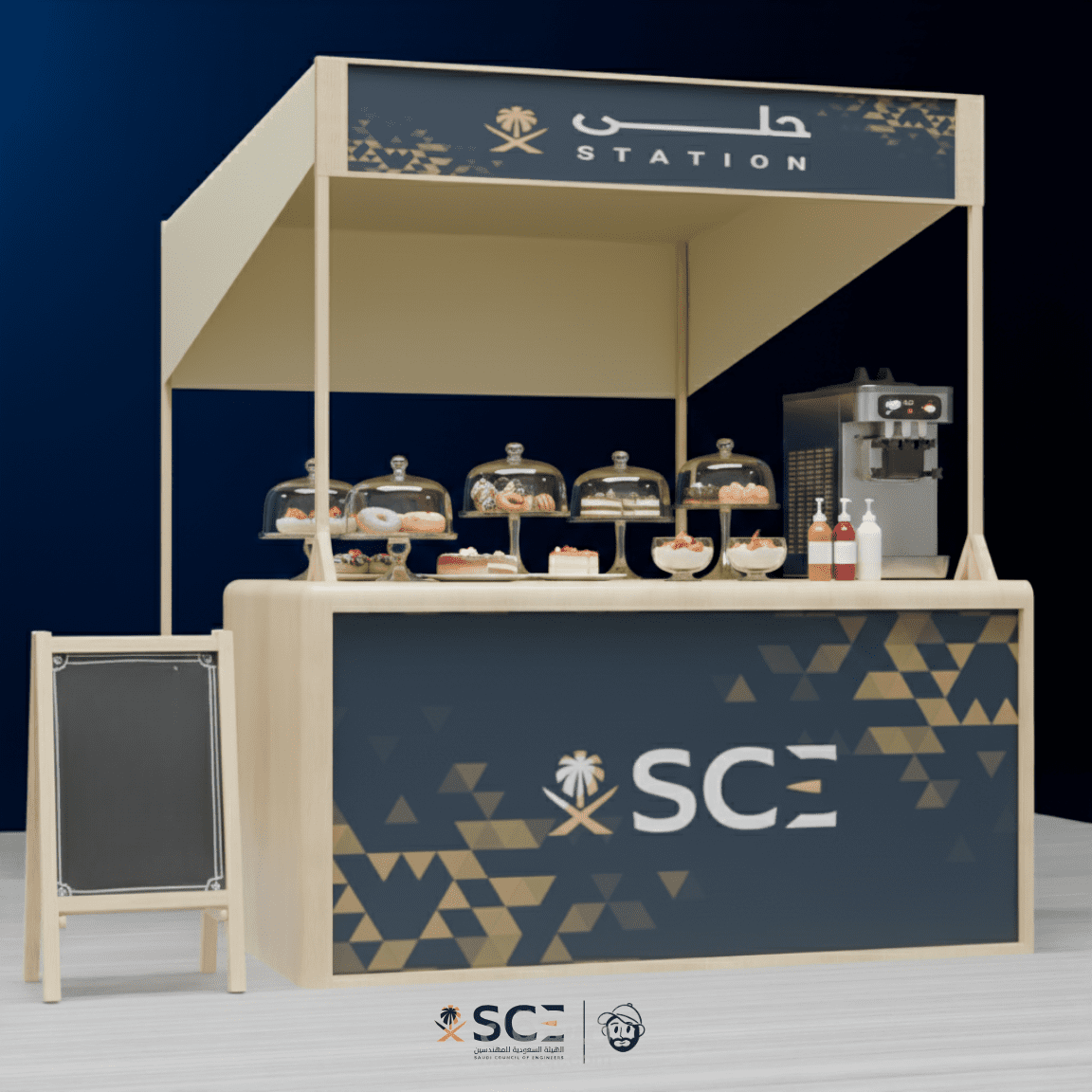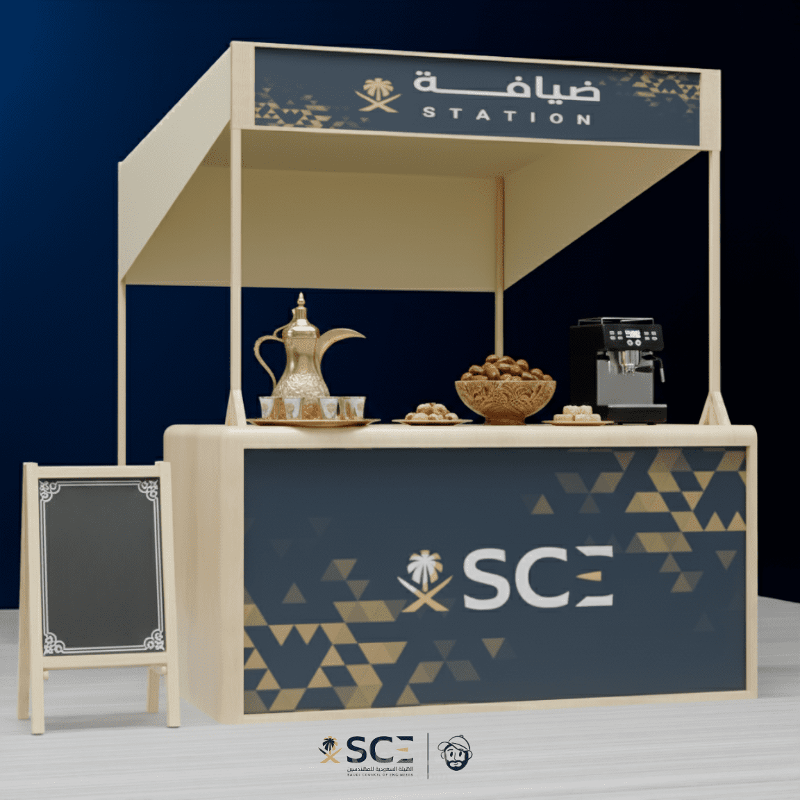 تصور ثلاثي الأبعاد لفعالية احترافية يشمل تصميم المسرح، مناطق الضيافة، أماكن الراحة، وعناصر الإرشاد، مع تخطيط ذكي للمساحات يضمن تجربة سلسة وواضحة للزوار.