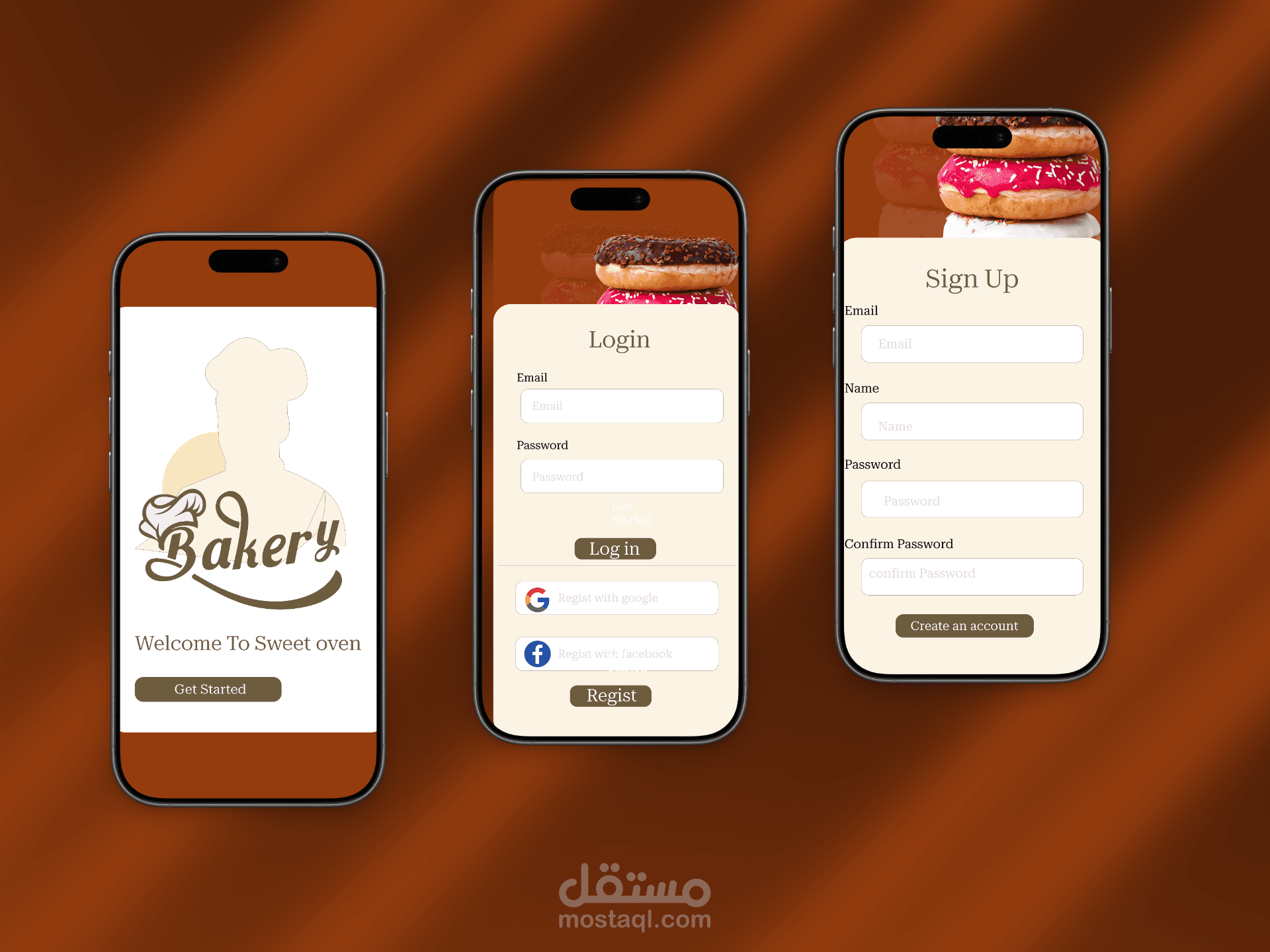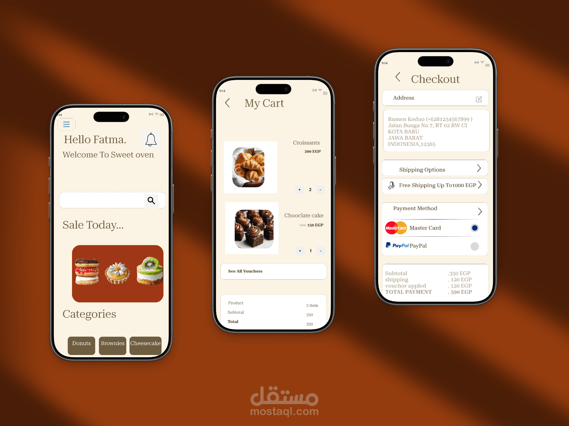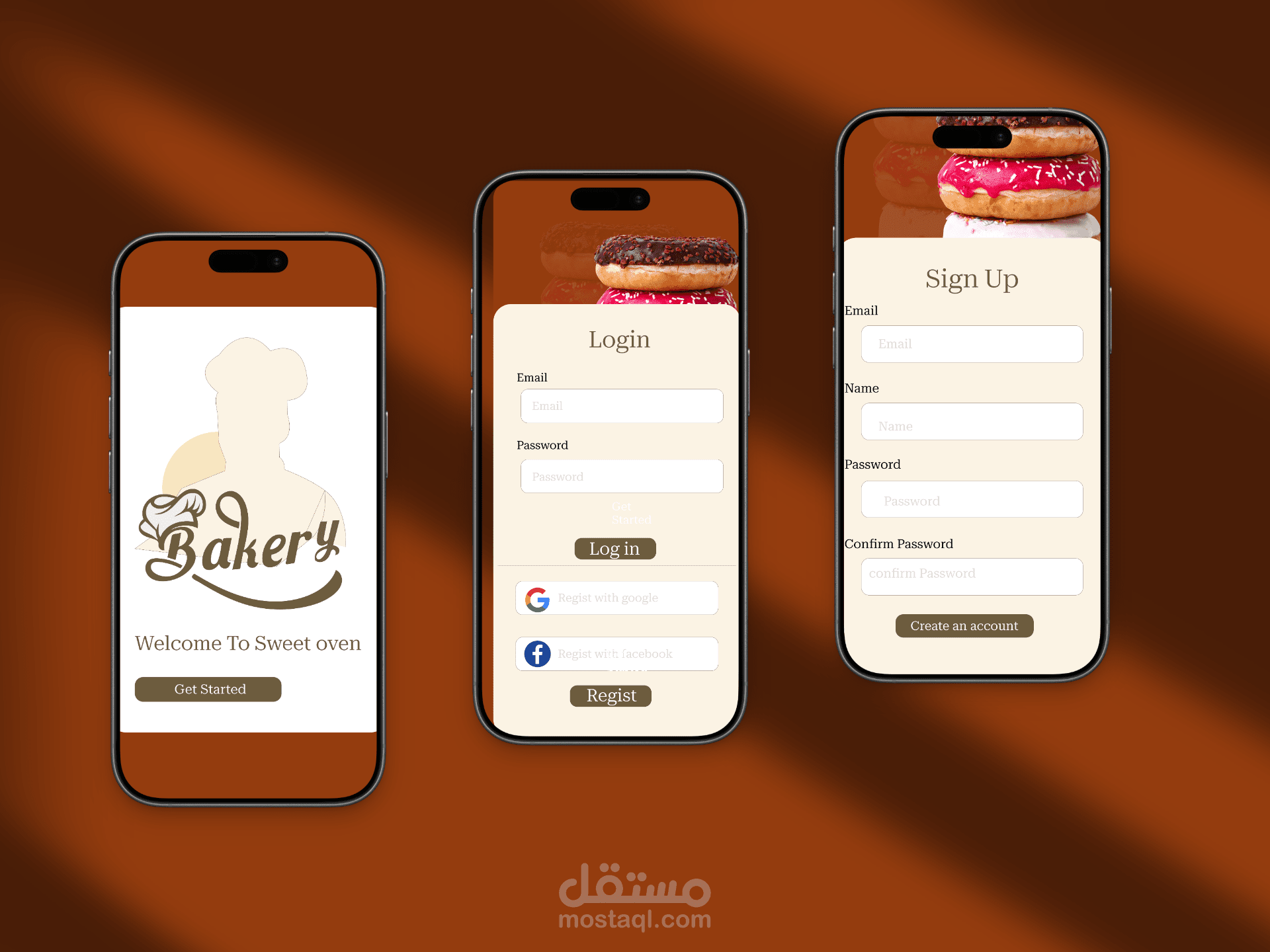 اجهات مستخدم (UI Design) لتطبيق مخبوزات باسم Sweet Oven، يهدف إلى عرض المنتجات بطريقة جذابة وسهلة الاستخدام.