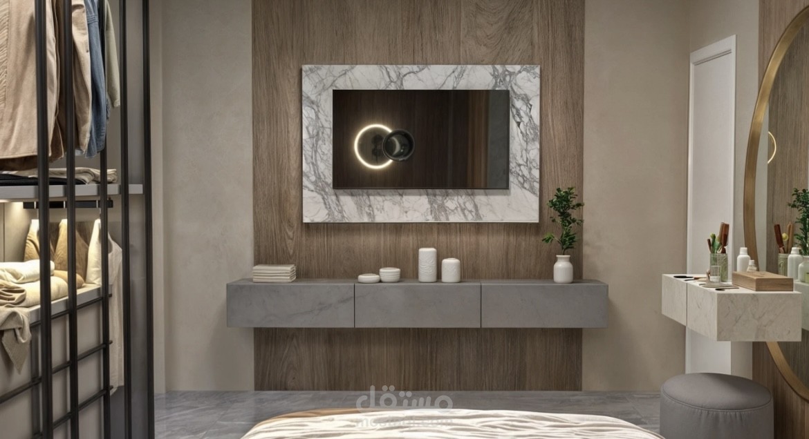 This project features a modern bedroom interior design with a warm and elegant atmosphere. Natural wood panels, soft lighting, and neutral colors were used to create a balanced and comfortable space.