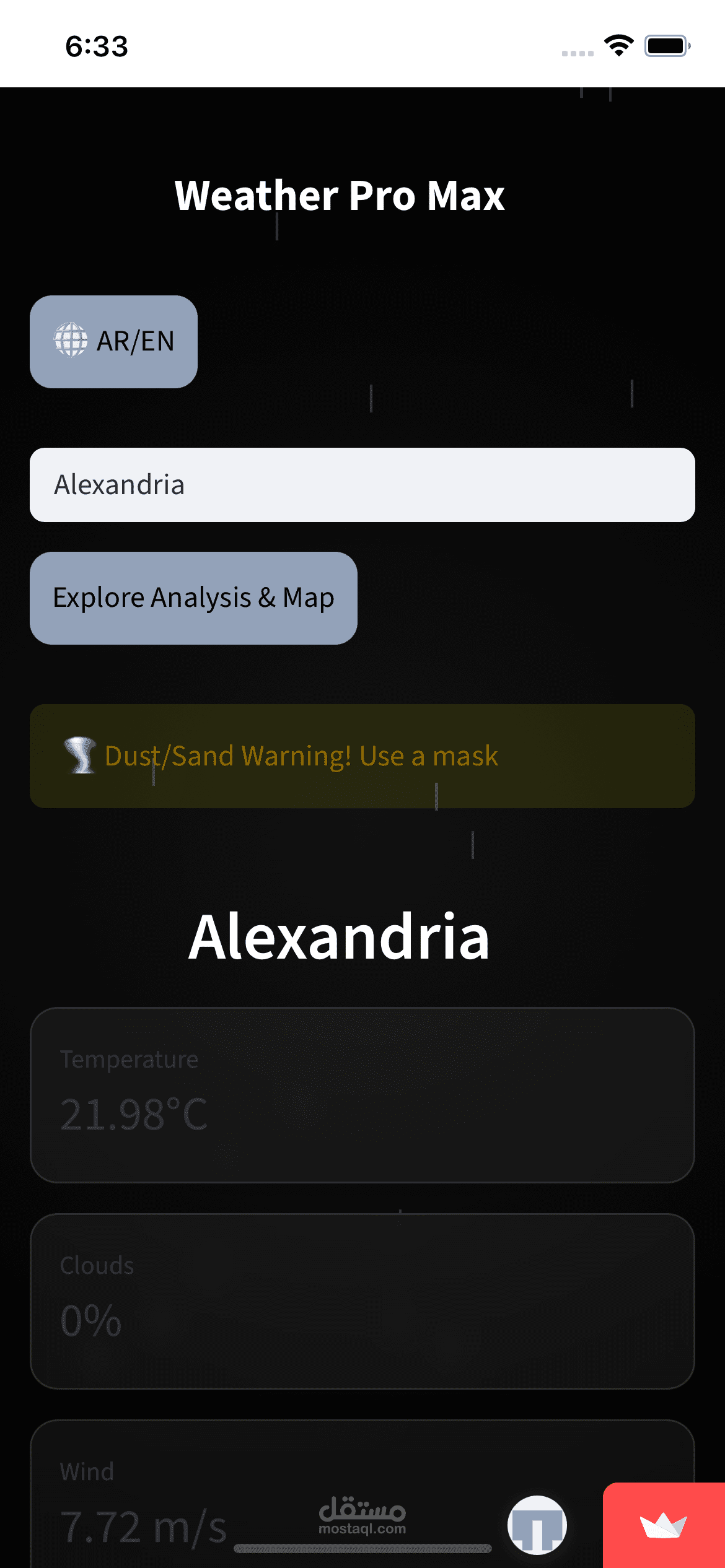 I developed "Weather Pro MAX," a professional Android app that bridges the gap between web data and mobile experience. The project focused on providing real-time weather analytics for specific zones (Alexandria & New Borg El Arab) while integrating a smart notification system for safety.