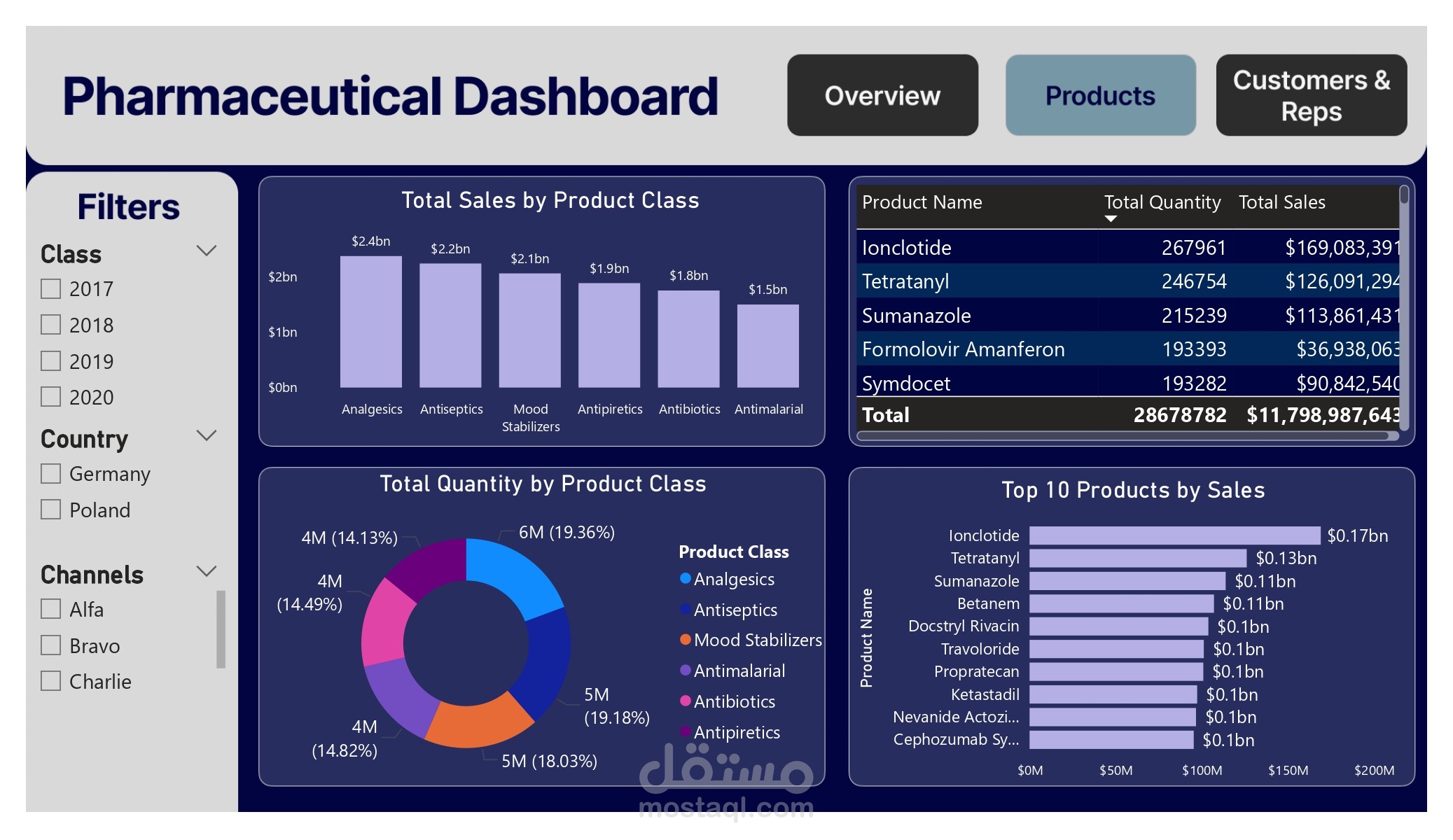 Dashboard احترافي لتحليل بيانات قطاع الأدوية (Pharmaceutical Industry) تم تنفيذه باستخدام Power BI، يهدف إلى دعم متخذي القرار في فهم المبيعات، المنتجات، العملاء، وأداء فرق المبيعات بشكل شامل وتفاعلي.
