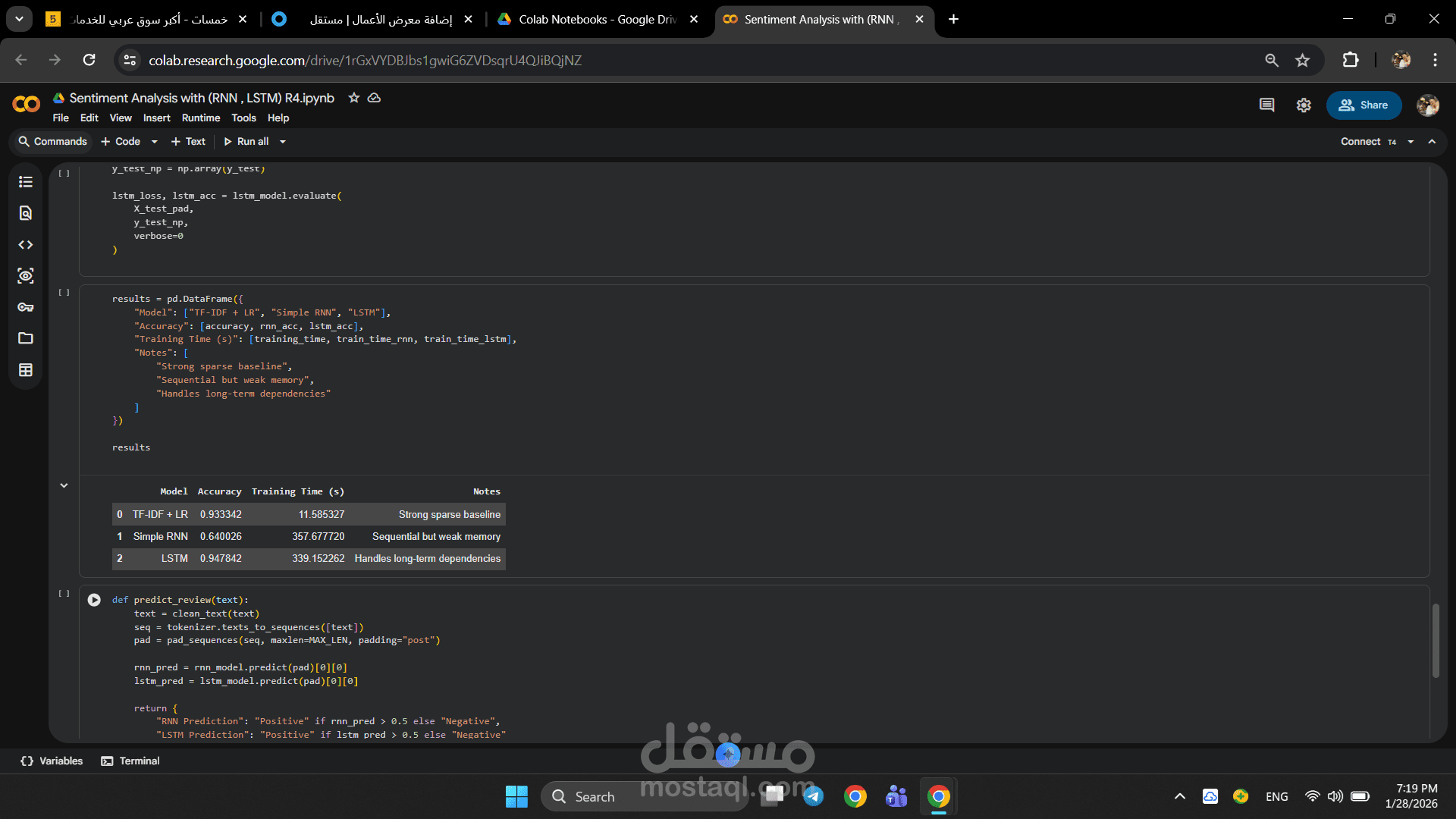 مشروع تحليل مشاعر النصوص يهدف إلى تصنيف آراء العملاء إلى إيجابية أو سلبية باستخدام تقنيات التعلم العميق ومعالجة اللغة الطبيعية. تم بناء النموذج بالاعتماد على شبكات RNN و LSTM وتدريبه على بيانات تقييمات حقيقية من Yelp للوصول إلى نتائج دقيقة قابلة للتطبيق العملي.