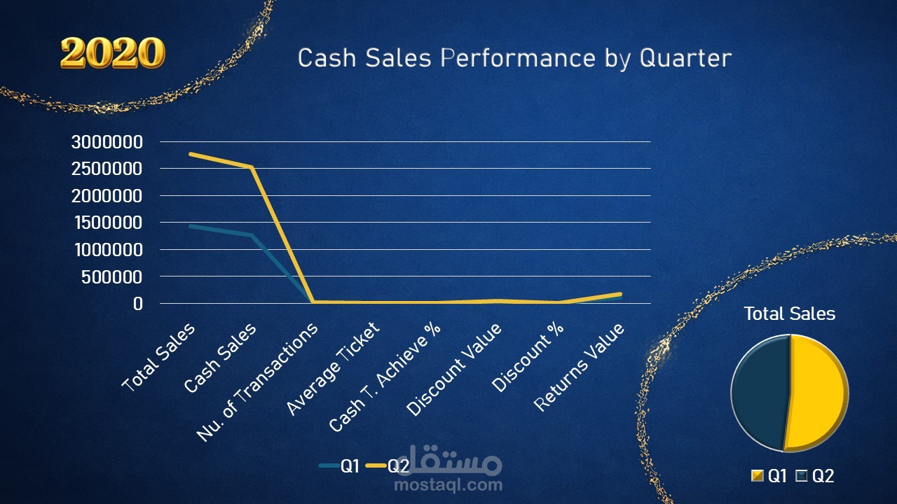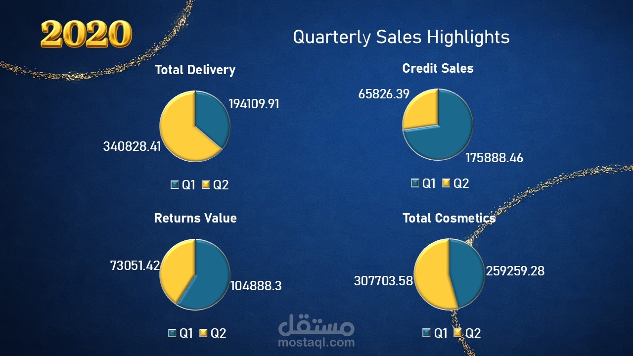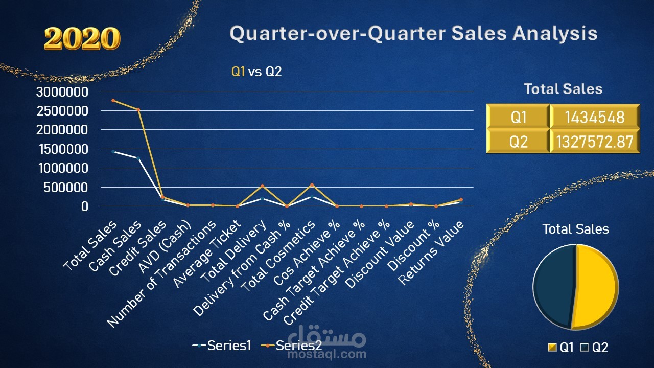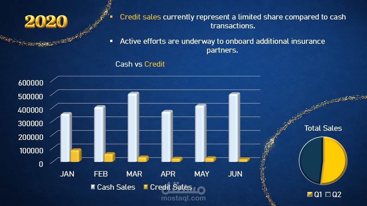 تحليل أداء المبيعات ربع السنوي لتحديد مصادر النمو، مقارنة المبيعات النقدية والائتمانية، ودعم اتخاذ القرار من خلال الرؤى المستخلصة وبناء شراكات استراتيجية لتحسين الأداء المستقبلي.