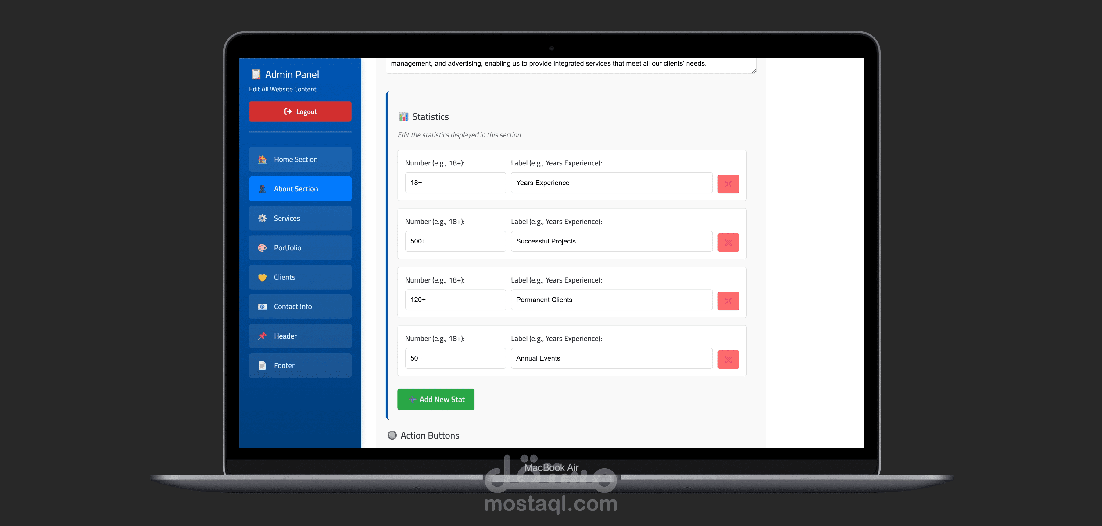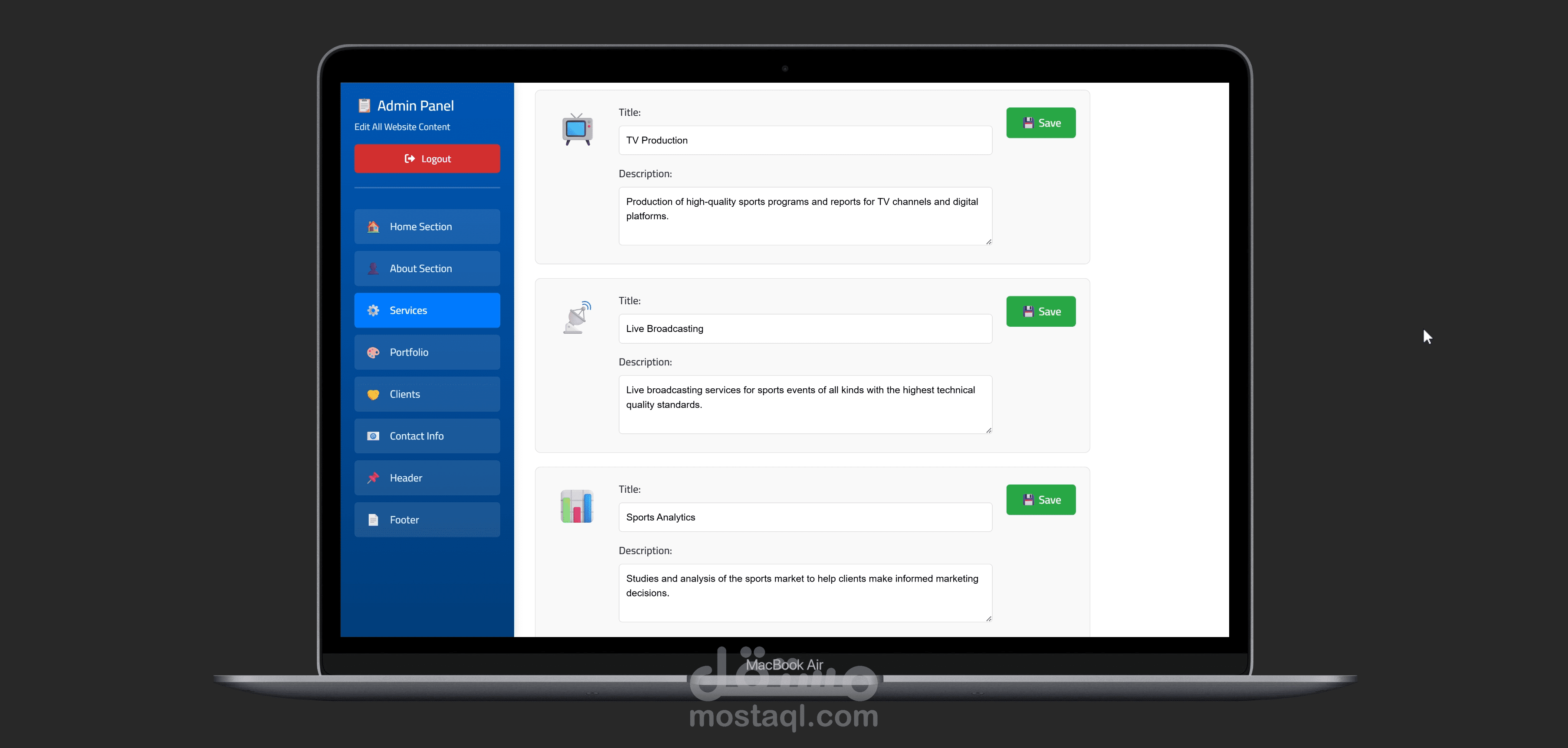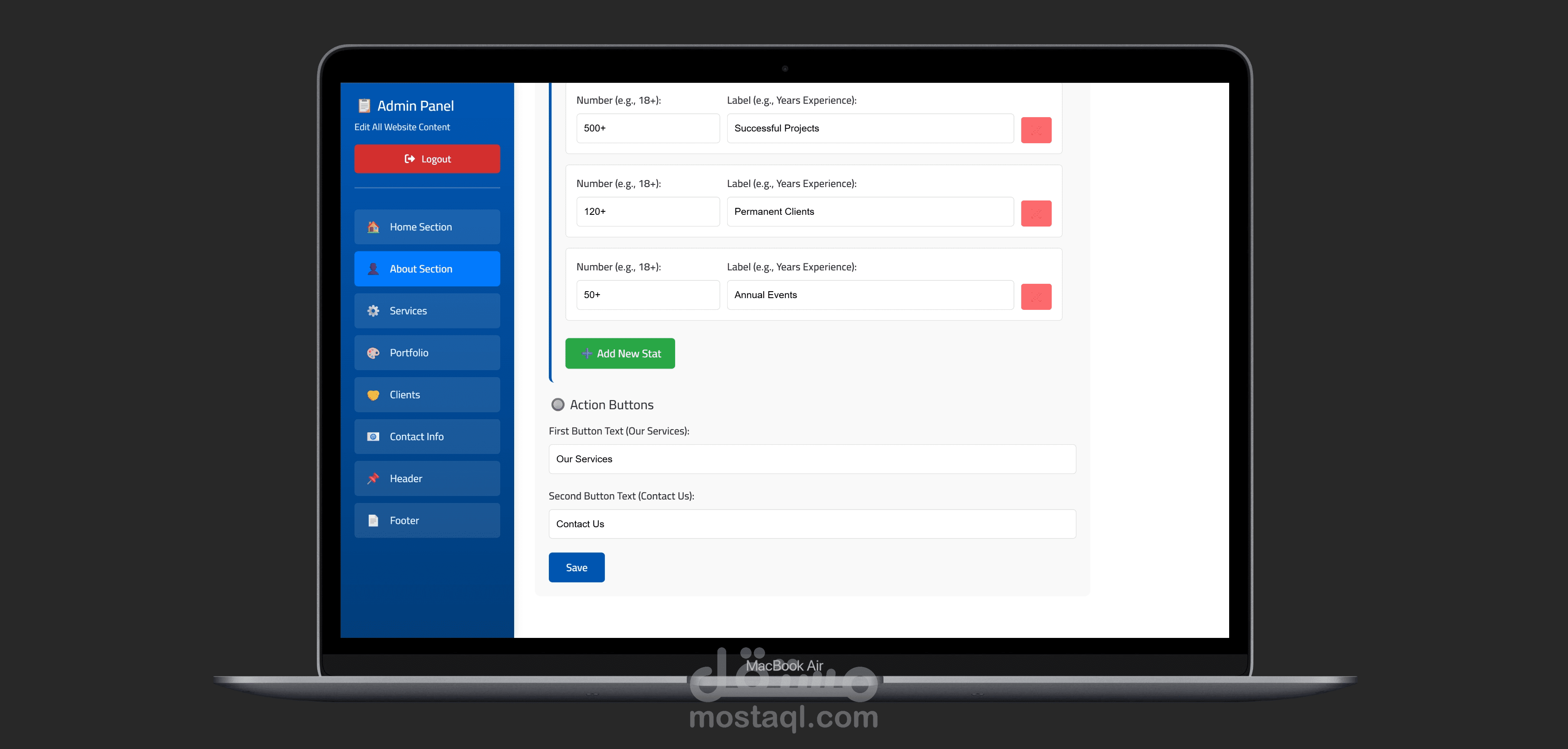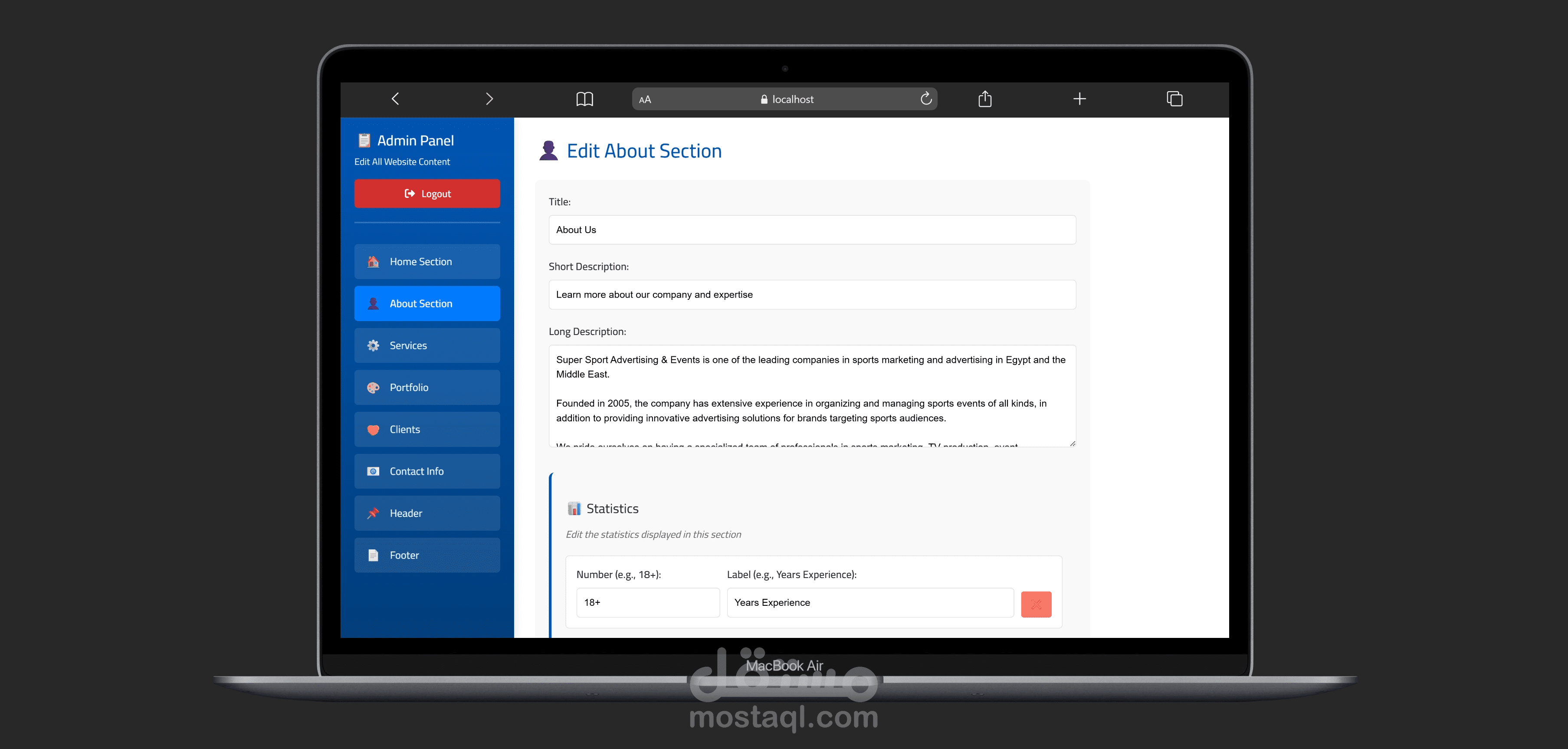 الموقع بيجمع بين واجهة مستخدم جذابة للزوار ولوحة تحكم قوية وسهلة الاستخدام تُمكّن الشركة من إدارة المحتوى بالكامل بدون أي تدخل تقني.