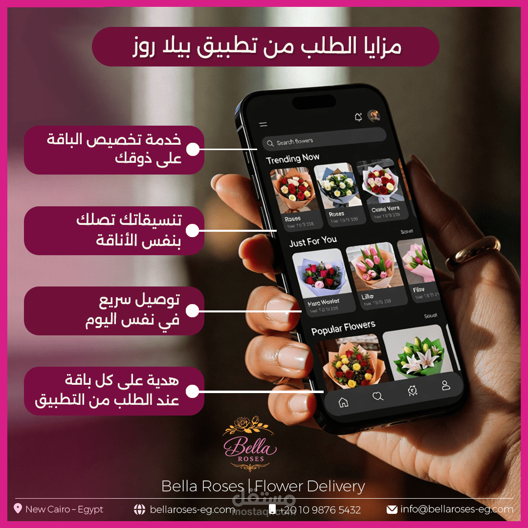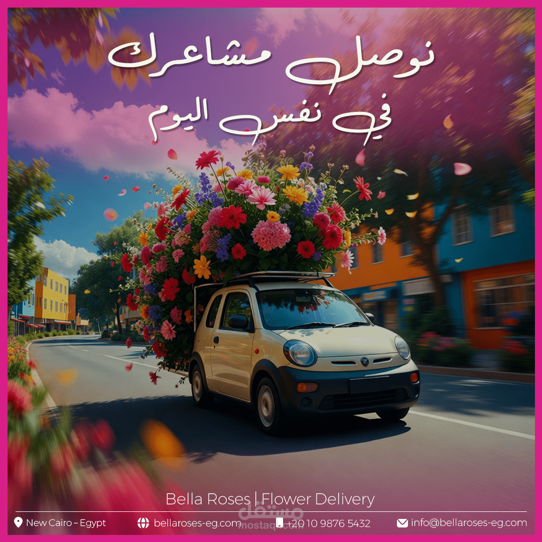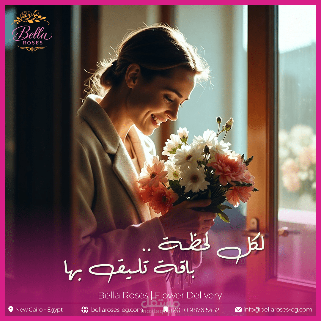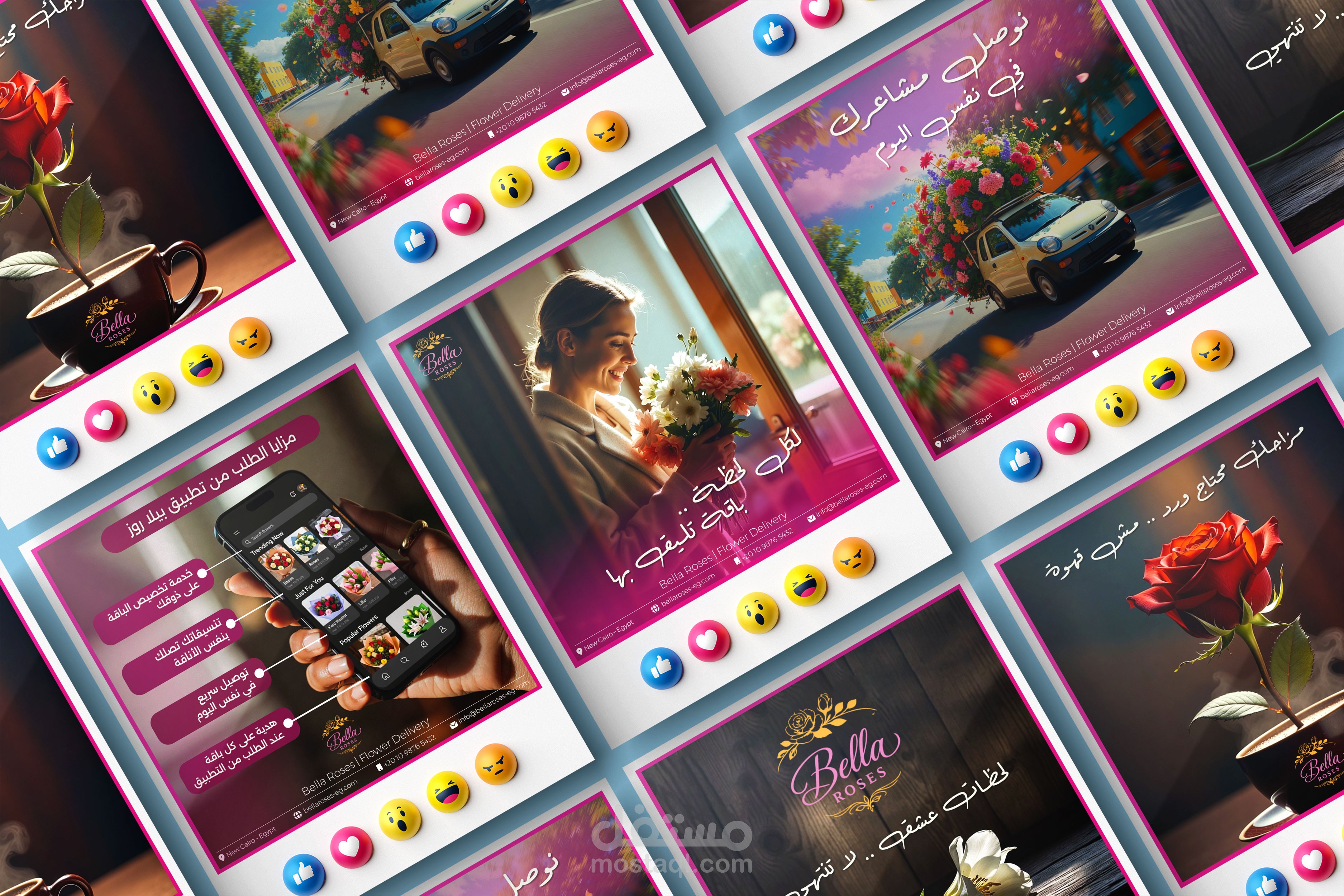 عمل 5 تصميمات سوشيال ميديا لاستور بيع الورود وتم تجهيز أفكار جديدة وتوليد صور بواسطة الذكاء الاصطناعي وتنسيقها لكي تخرج بهذا الشكل