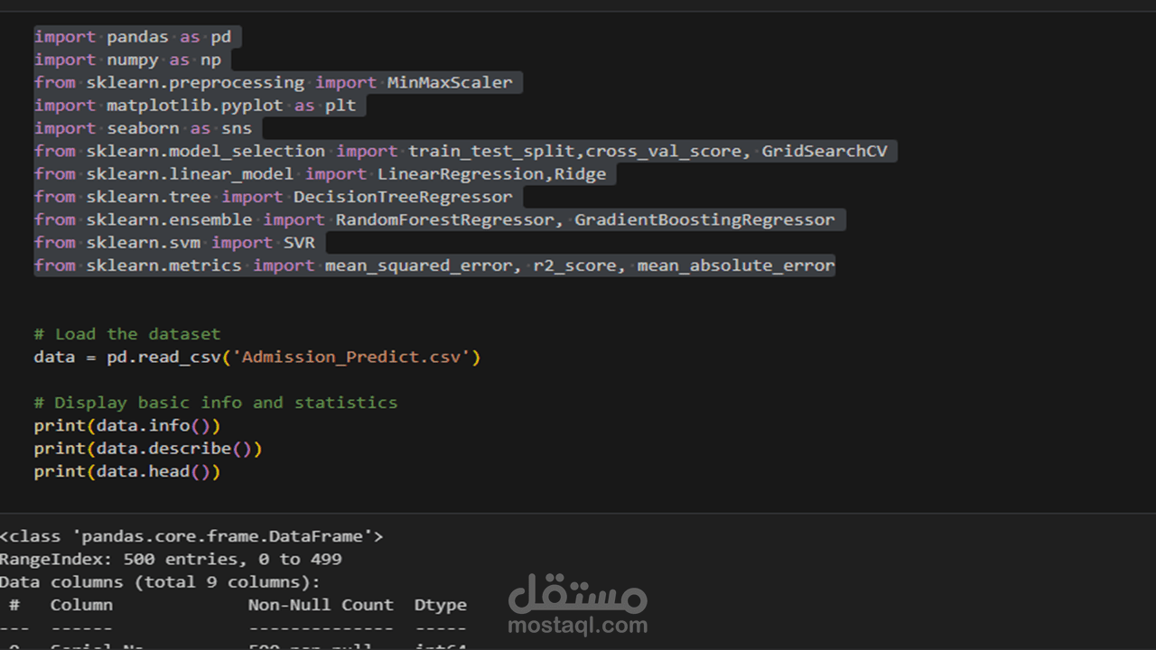 2 . معالجة البيانات (Data Preprocessing): تنظيف البيانات من أي قيم مفقودة، وتنسيق الأعمدة، وعمل Feature Scaling لضمان أن جميع المعايير (مثل درجات الـ GRE العالية ومعدل الـ GPA الصغير) لها تأثير متوازن على النموذج.