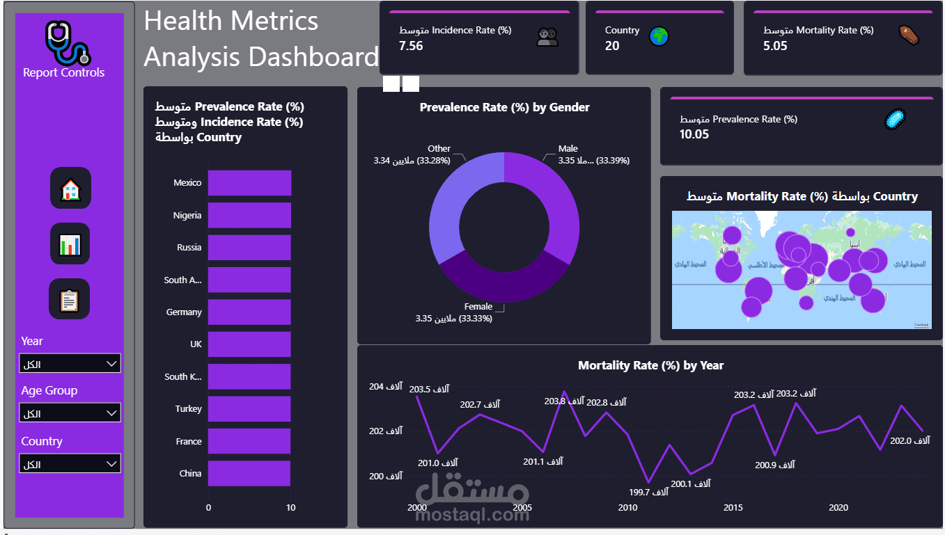 يعرض هذا المشروع لوحة معلومات تفاعلية لتحليل الإحصاءات الصحية العالمية باستخدام Power BI و Excel.