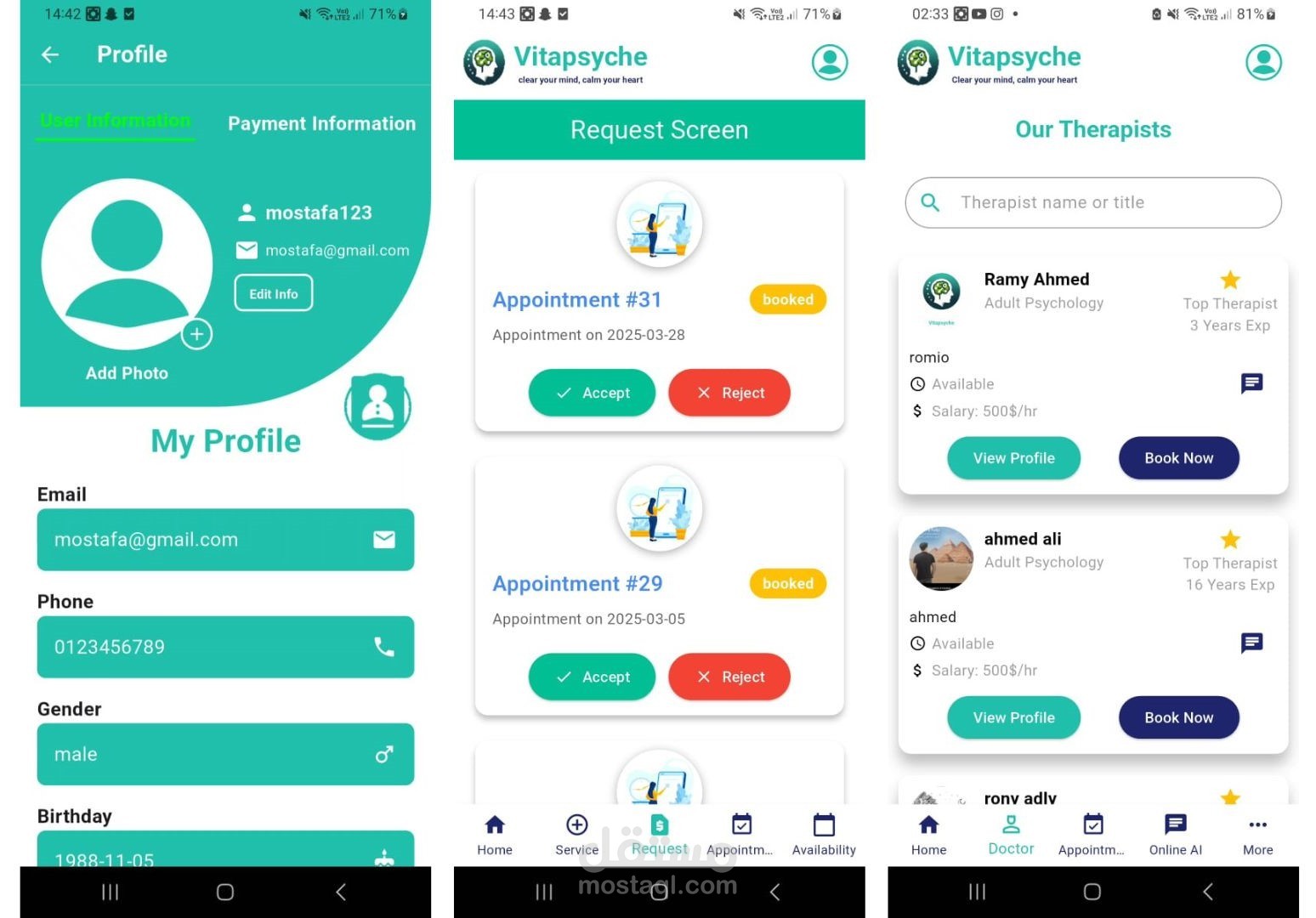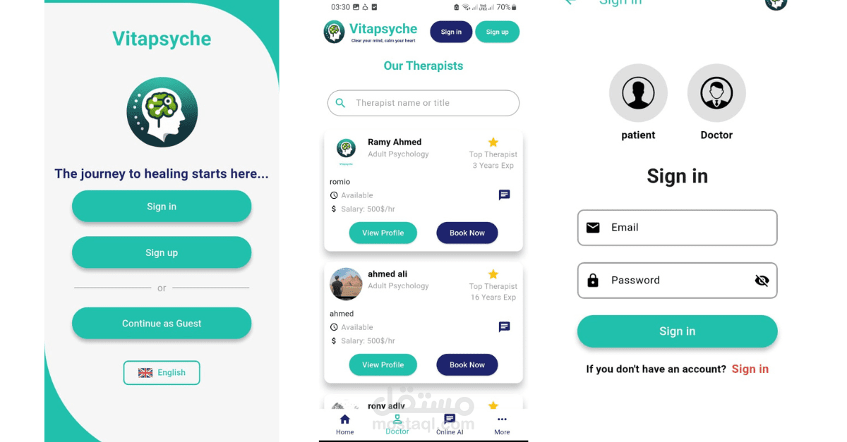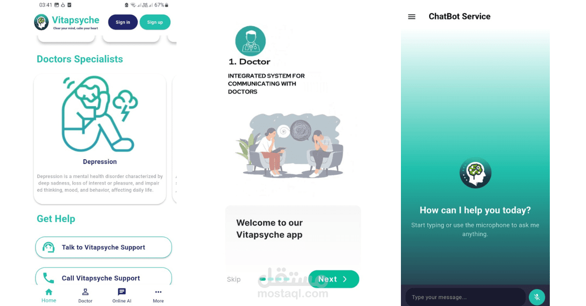 تطوير تطبيق متكامل للصحة النفسية والعلاج السلوكي، يجمع بين الحلول الطبية وتقنيات الذكاء الاصطناعي، ويستهدف المرضى والأطباء النفسيين، ويتضمن: