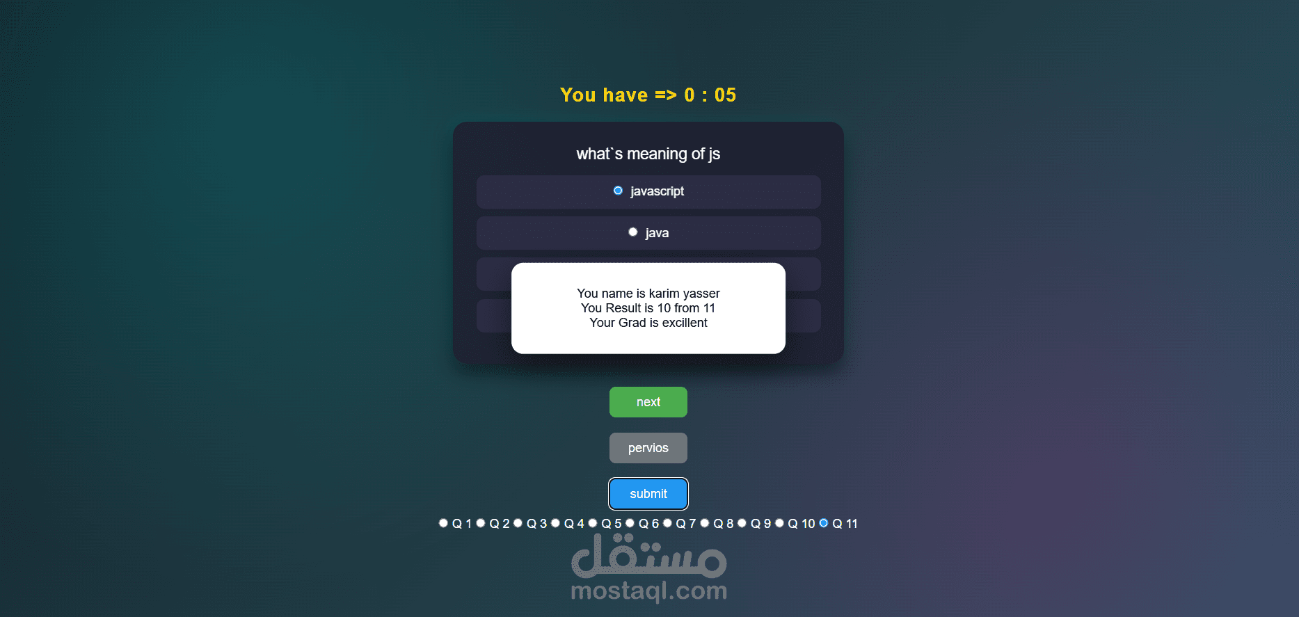 يتضمن النظام مؤقتًا للامتحان، والتنقل بين الأسئلة، واختيار الإجابات، ثم حساب النتيجة النهائية وعرض التقدير بشكل تلقائي بعد انتهاء الاختبار أو إرسال الإجابات.