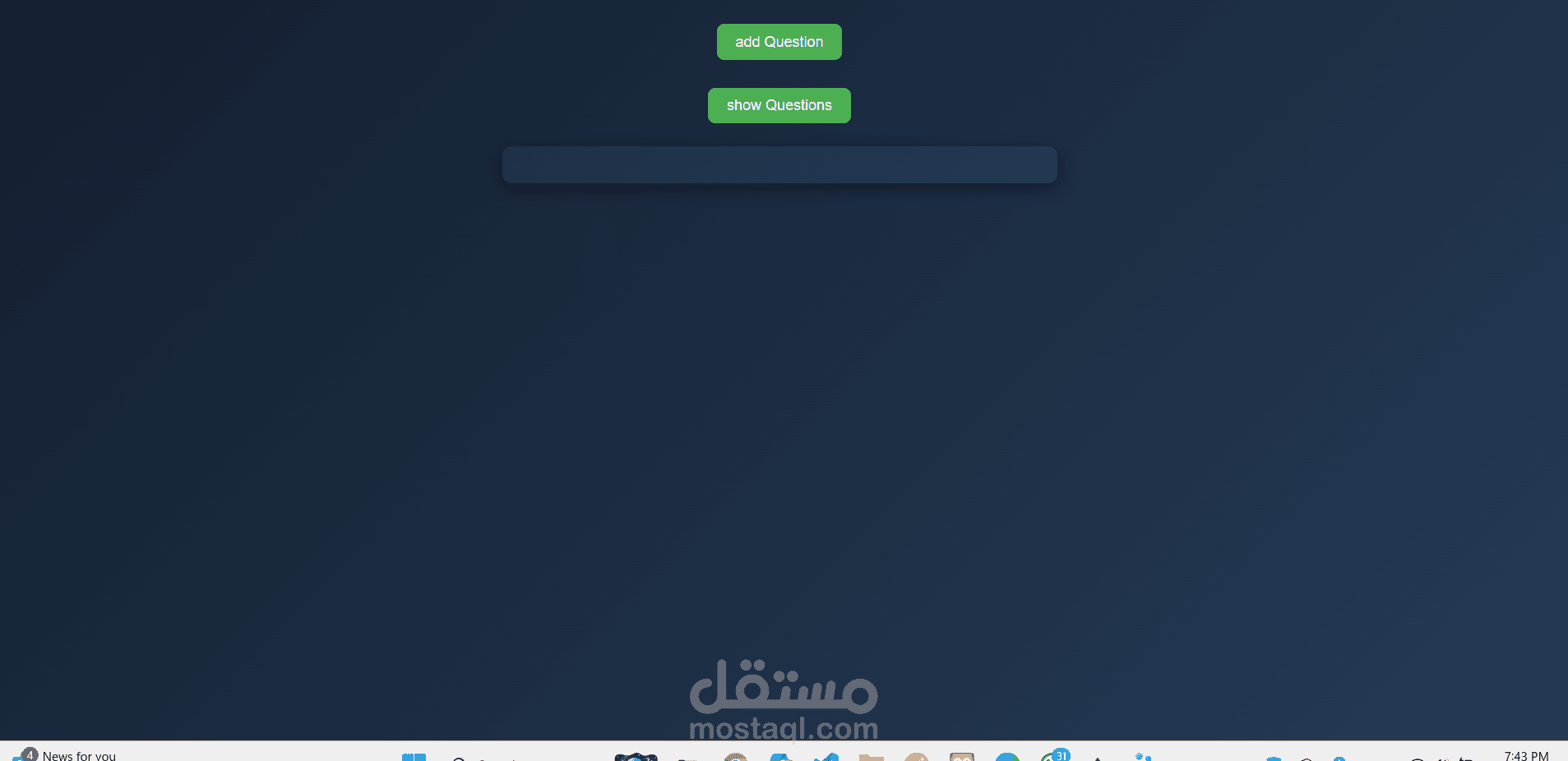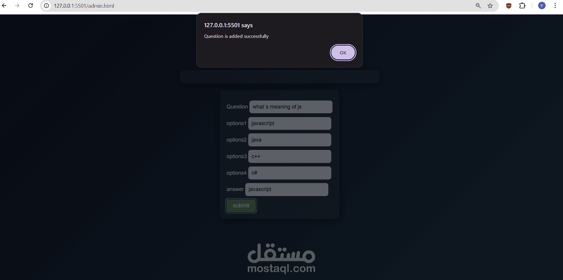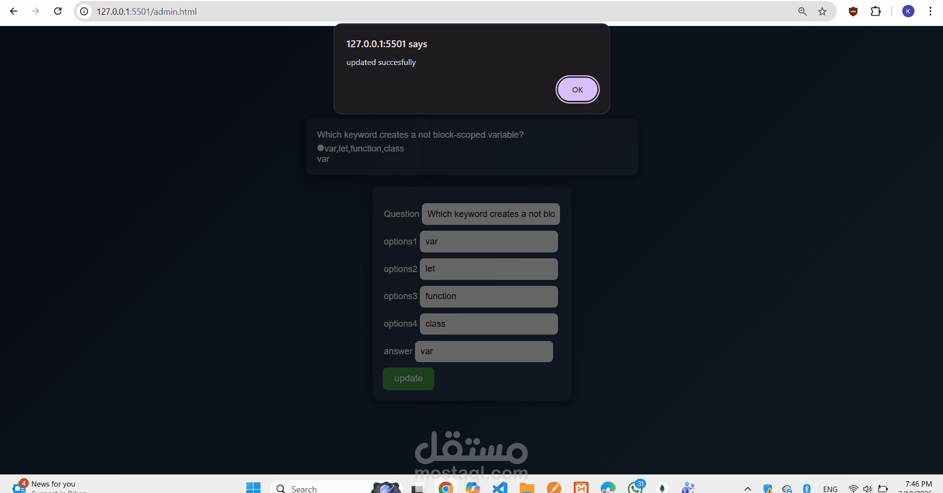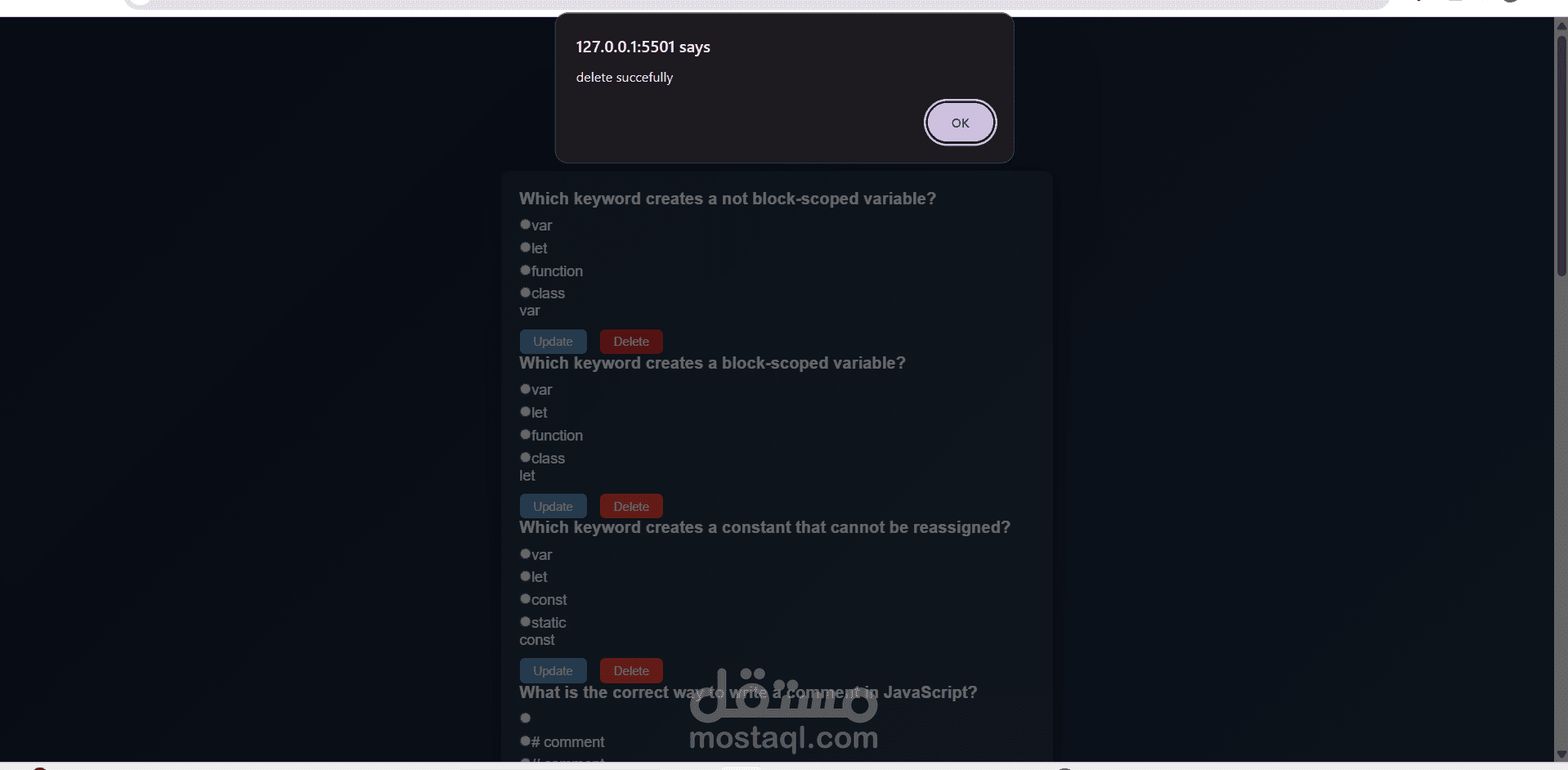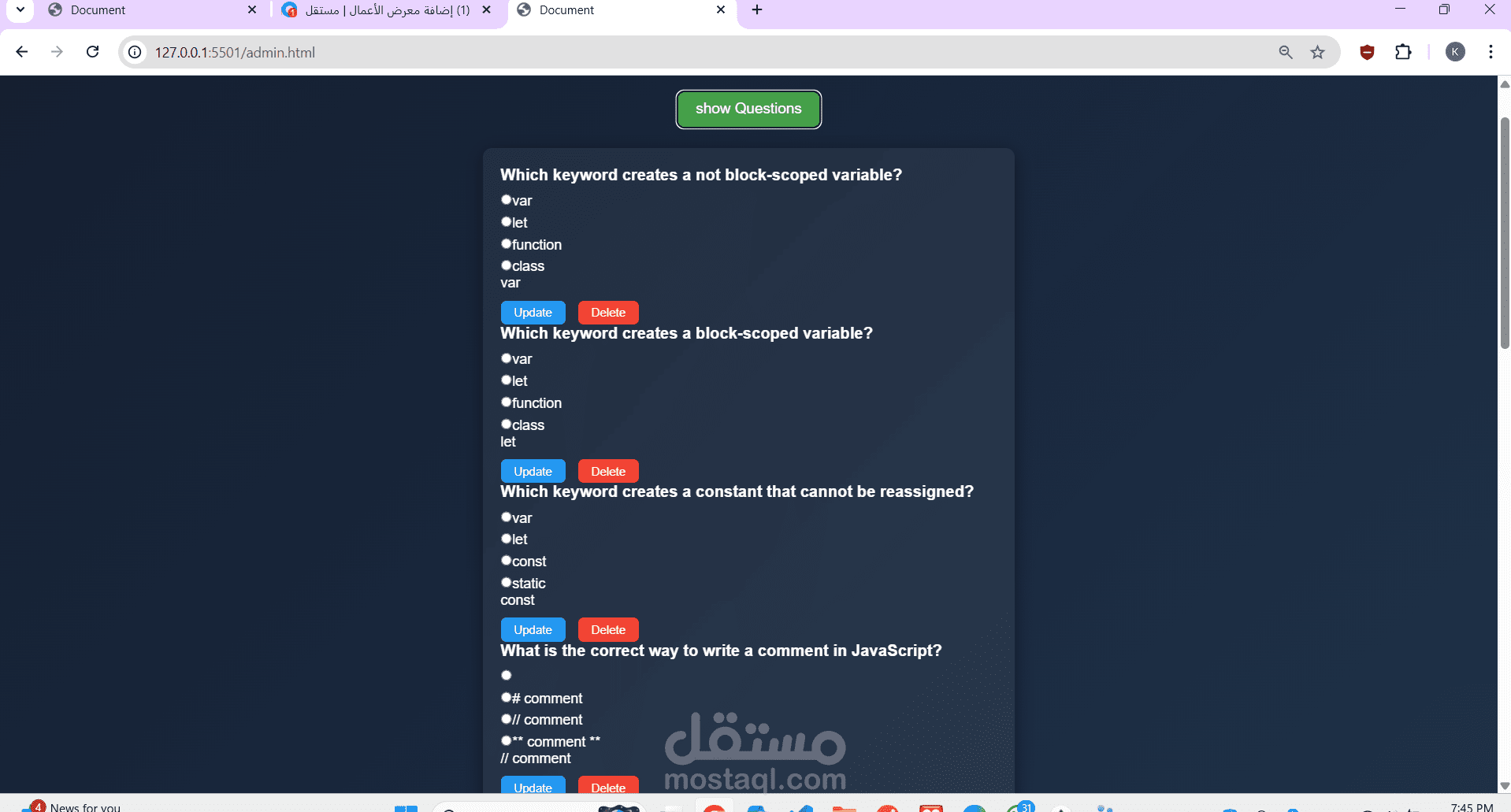 كما قمت بتنفيذ لوحة تحكم للإدارة تتيح إضافة الأسئلة، وعرضها، وتعديلها، وحذفها بسهولة، مما يجعل النظام مرنًا وقابلًا لإدارة محتوى الامتحان بشكل عملي.