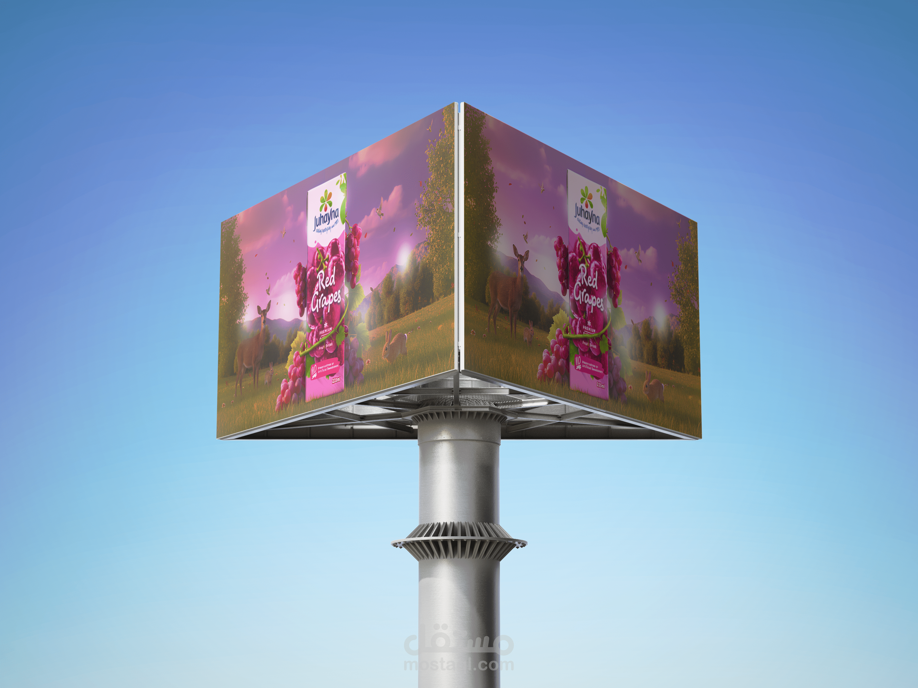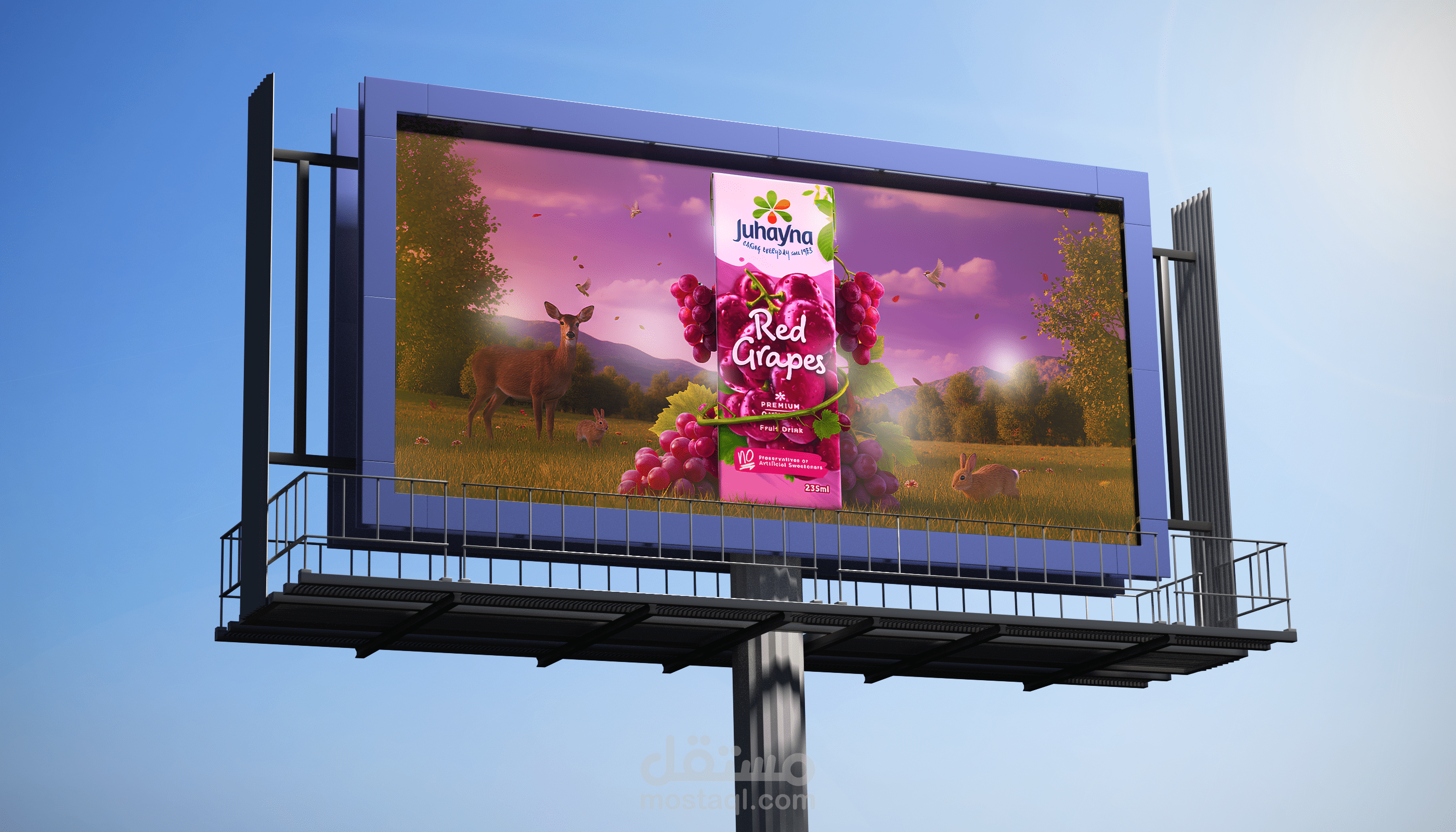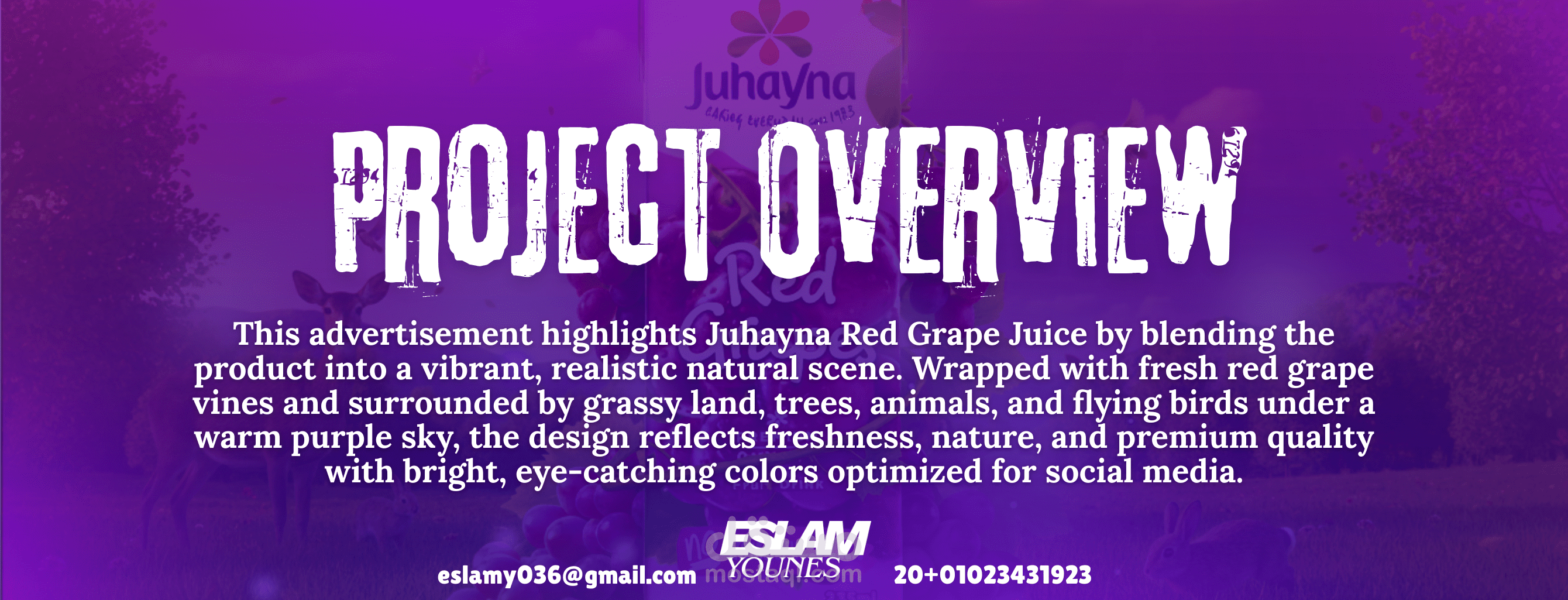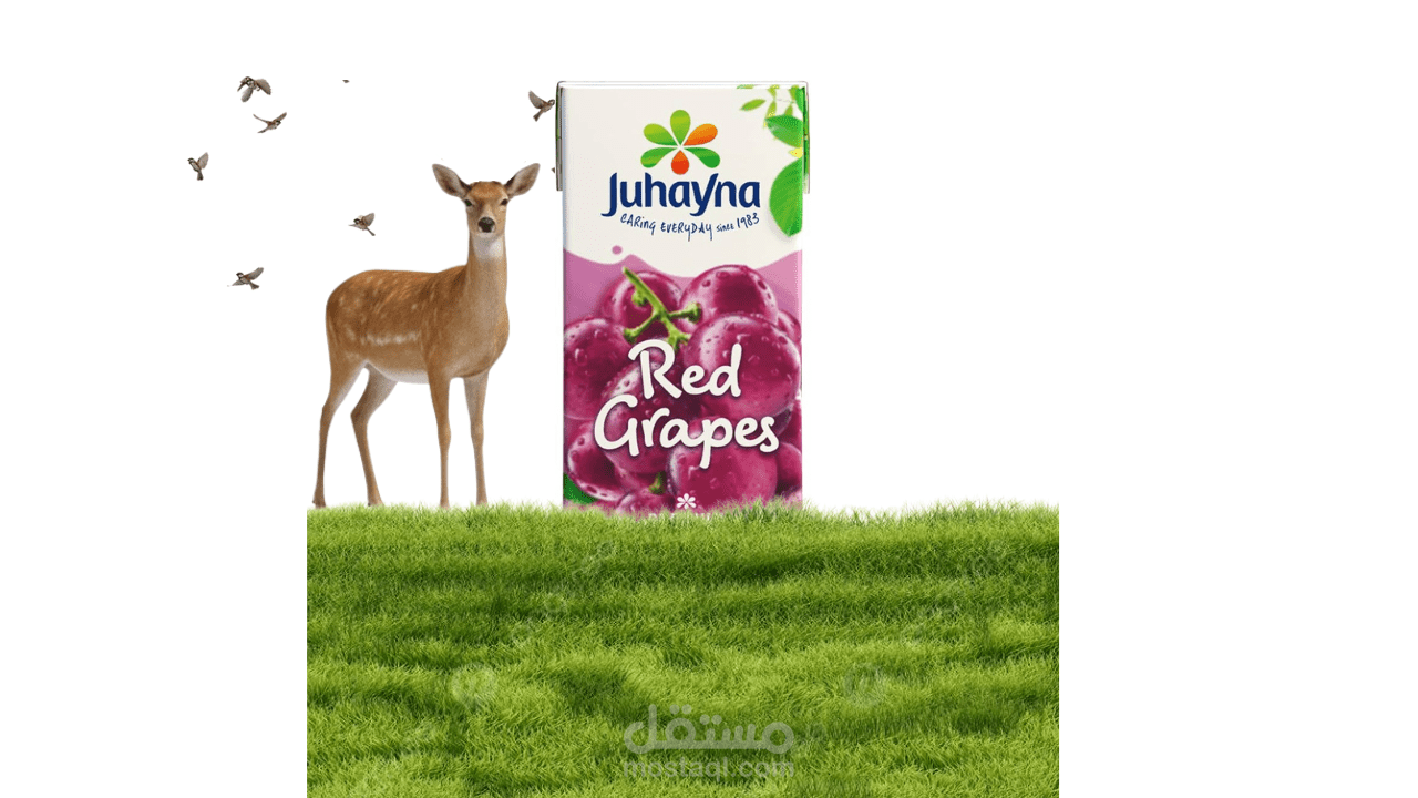 في التصميم ده، عملت عصير جهينة عنب أحمر كأنه موجود في قلب الطبيعة. المنتج مدمج بطريقة طبيعية مع العشب، عنقود العنب الملفوف حواليه، أشجار بأوراق متطايرة، غزالة وأرانب حوالين المشهد، وطيور صغيرة في السماء البنفسجية الدافئة. الألوان ساطعة وحيوية، والإضاءة طبيعية، عشان يدي إحساس بالانتعاش والجودة.