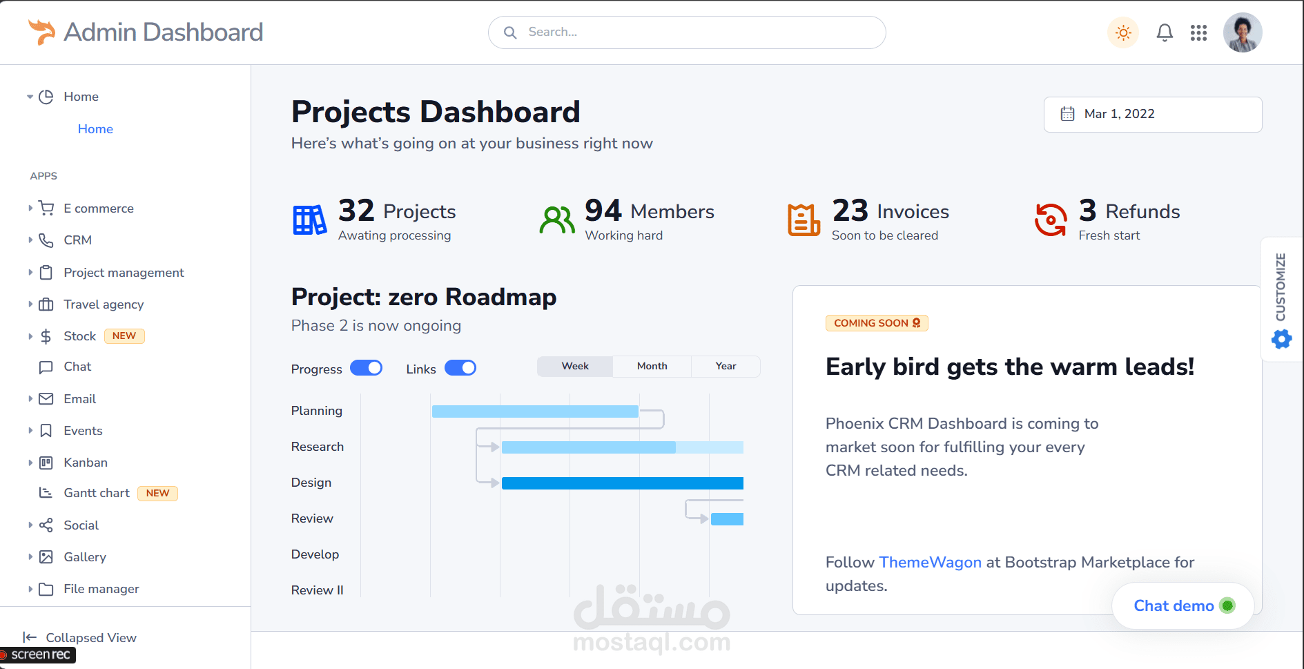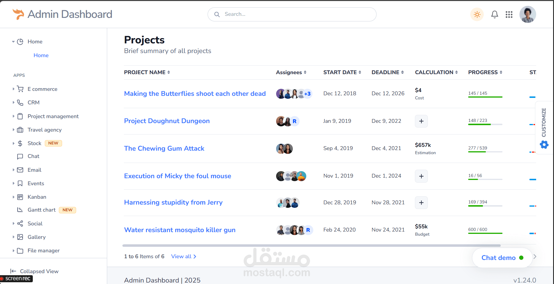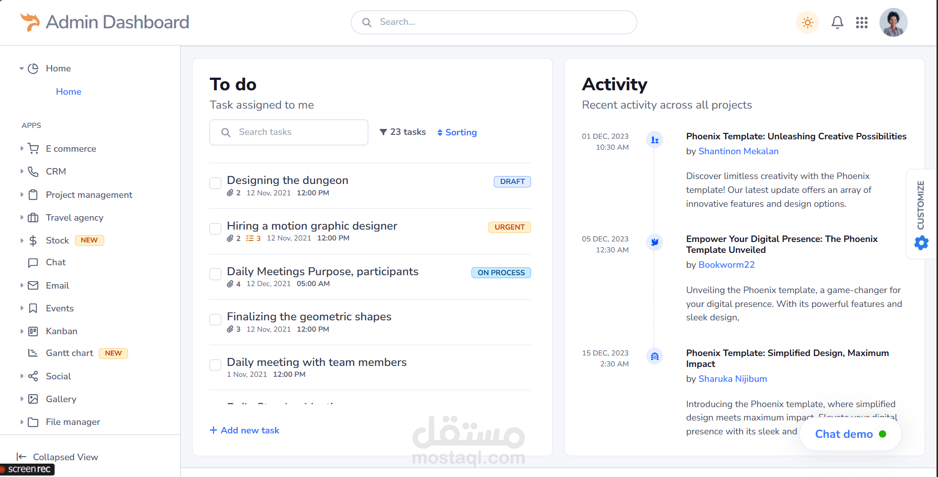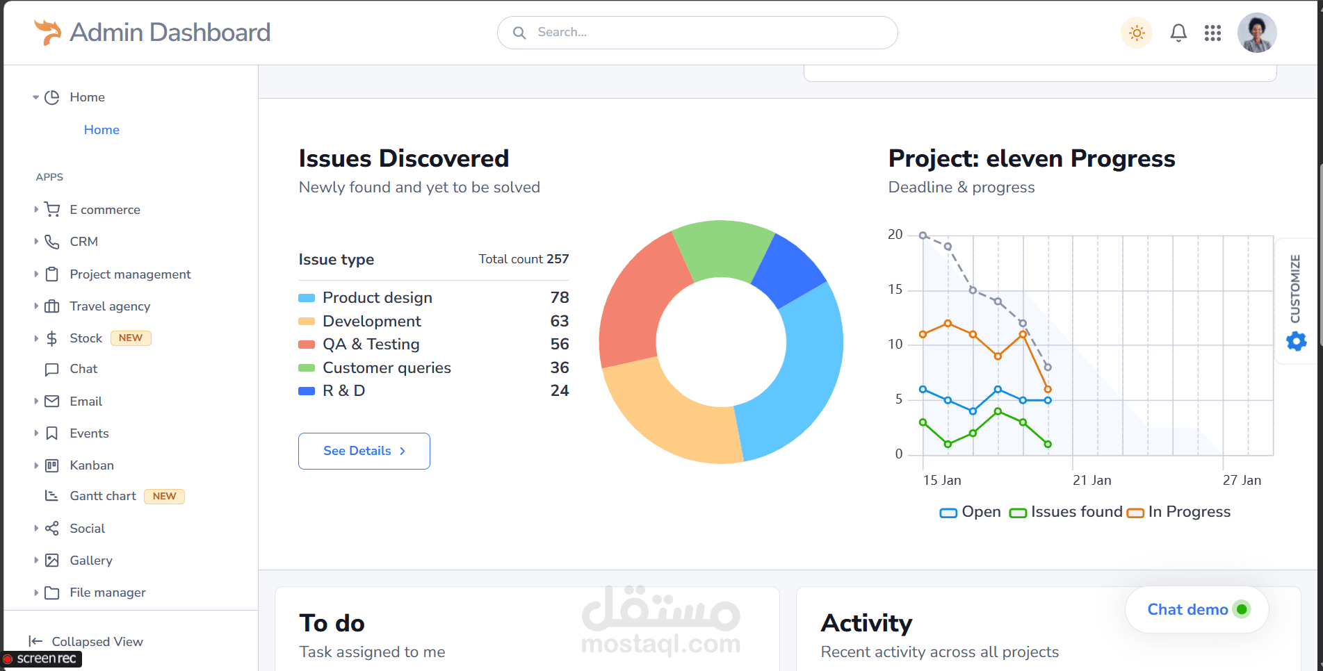 قمت بتصميم وتطوير Admin Dashboard احترافية ومتقدمة مخصصة لإدارة المشاريع والفرق والبيانات داخل الشركات أو أنظمة SaaS، مع التركيز على عرض كم كبير من المعلومات بطريقة منظمة وسهلة الاستخدام بدون تعقيد على المستخدم.