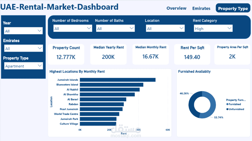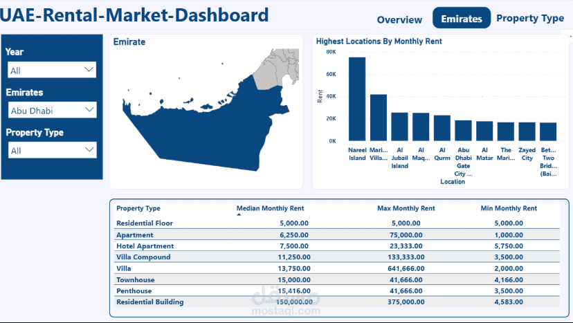 The UAE Rental Market Dashboard provides a comprehensive analysis of rental trends across the United Arab Emirates.