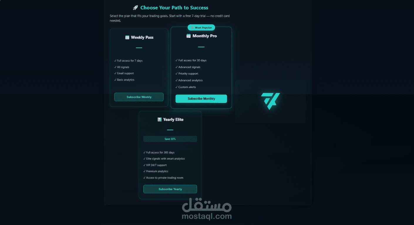 النتيجة: موقع تسويقي جذاب يساعد في بناء الثقة، يبرز قيمة النظام الذكي، ويزيد من معدلات الاشتراك والانضمام للقناة، مع الحفاظ على هوية احترافية تناسب مجال التداول والـ FinTech.