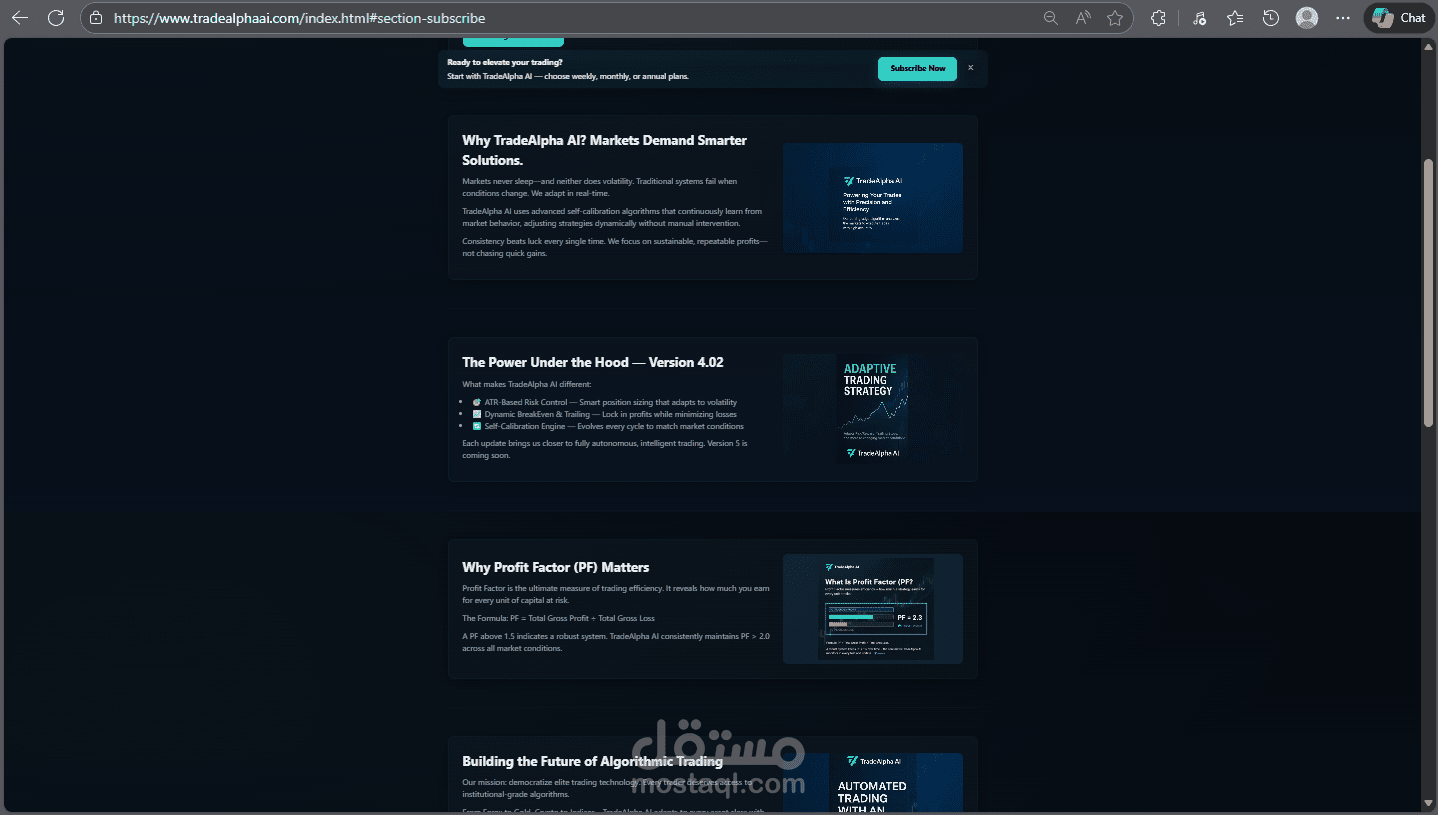- أقسام منظمة: Hero section قوي، لماذا TradeAlpha AI، المزايا الرئيسية، الباقات والأسعار، شهادات/قصص نجاح (إن وجدت)، FAQ، Call-to-Action واضح للاشتراك