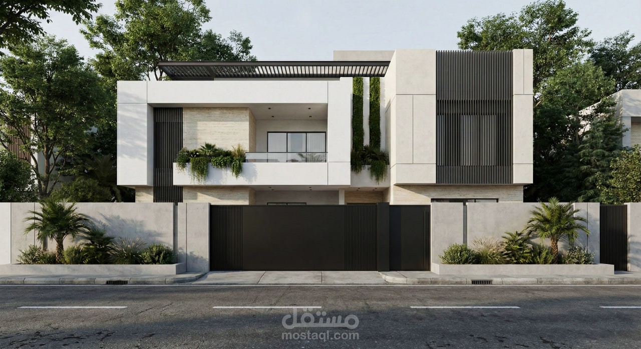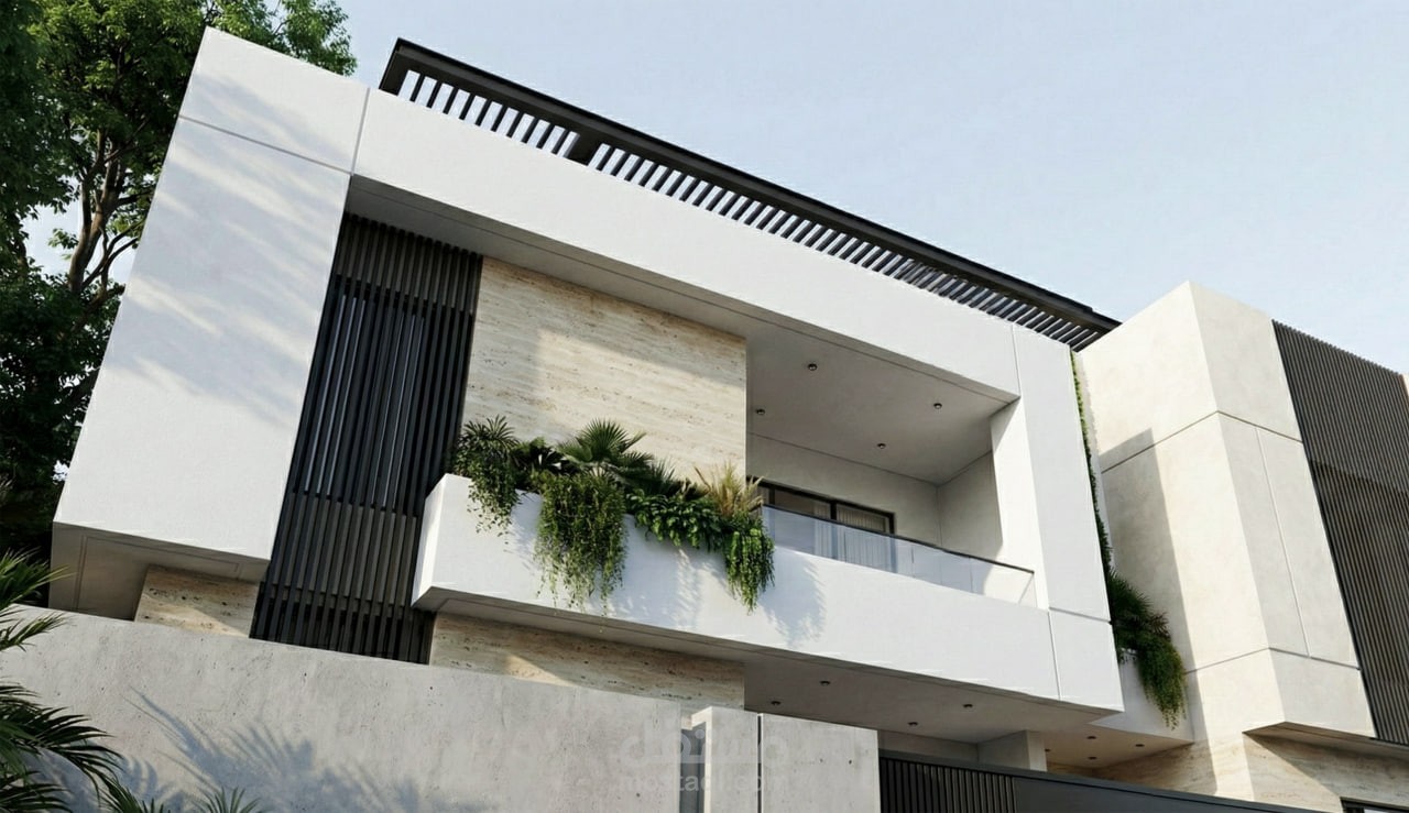 White Line is a modern minimal villa exterior design that focuses on purity of form, clarity of geometry, and a strong relationship with greenery. The project is defined by clean white volumes, sharp linear edges, and a calm architectural composition that avoids visual noise. Integrated green elements are carefully placed to soften the solid masses and create a balanced dialogue between architecture and nature. The result is a contemporary residential facade that expresses simplicity, elegance, and a refined sense of modern living.
