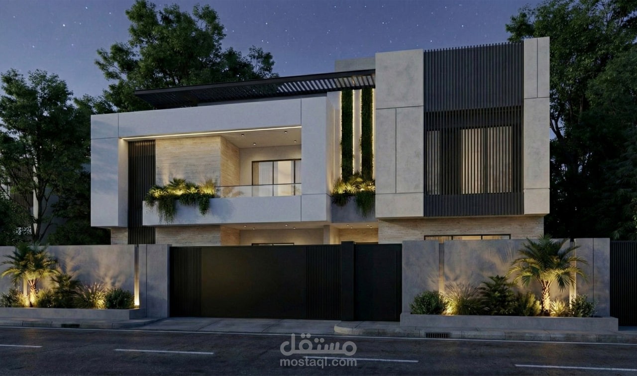 Highlights: Modern minimal architectural language defined by clean white volumes, sharp linear geometry, and integrated greenery. Subtle material contrasts, balanced proportions, calm daylight and night scenes, and a refined relationship between architecture and landscape create a contemporary villa facade that emphasizes clarity, elegance, and visual serenity.