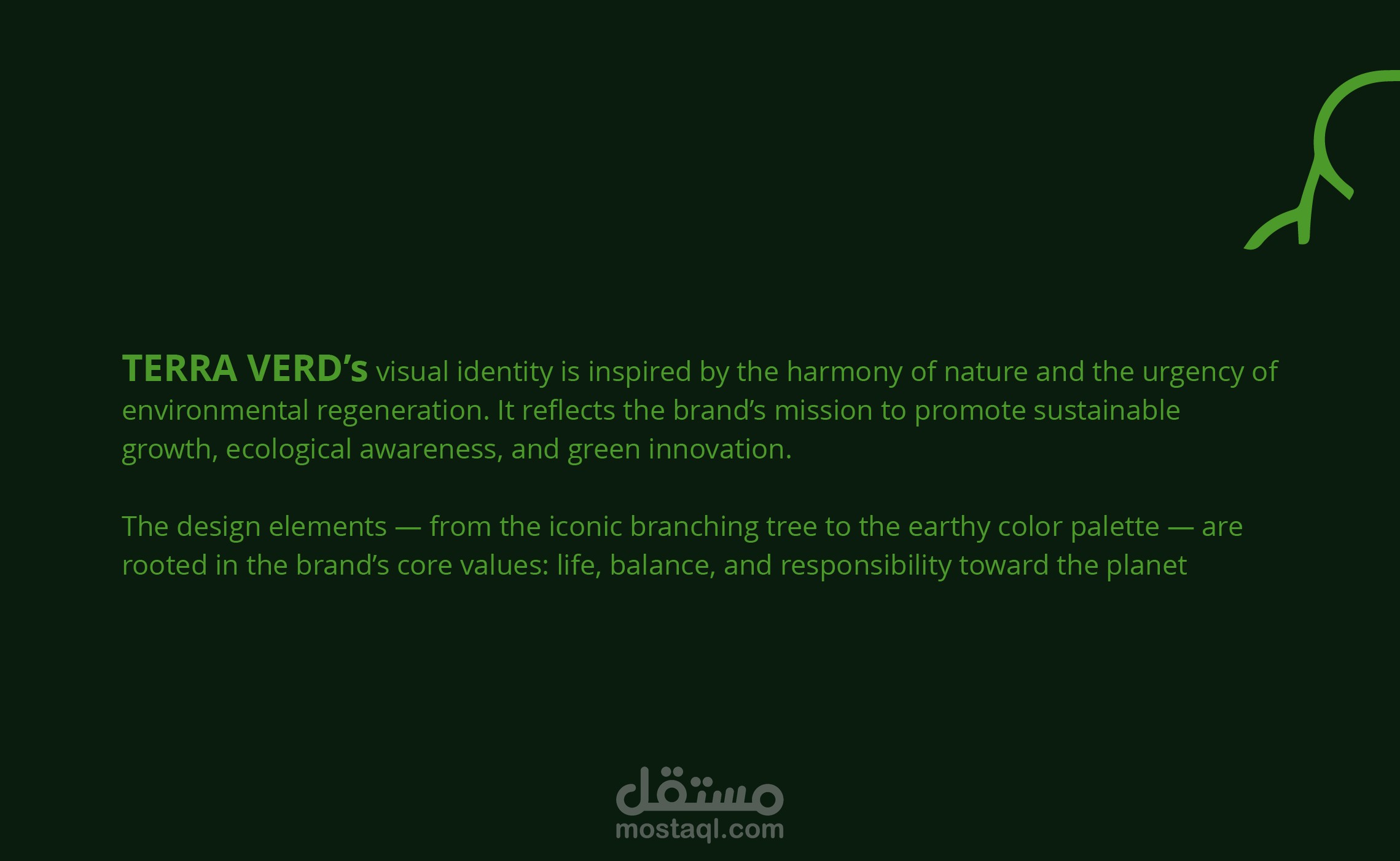 مشروع Terra Verd Branding هو تصميم هوية بصرية متكاملة عكست رؤية علامـة تجارية مستوحاة من الطبيعة والاستدامة. يتضمن المشروع تطوير هوية بصرية قوية ومميزة تشمل اللوغو، لوحة الألوان، اختيار الخطوط، العناصر الرسومية، وتطبيقات الهوية على مواد تسويقية مختلفة مثل البروشورات، الكروت، التغليف، والواجهات الرقمية.