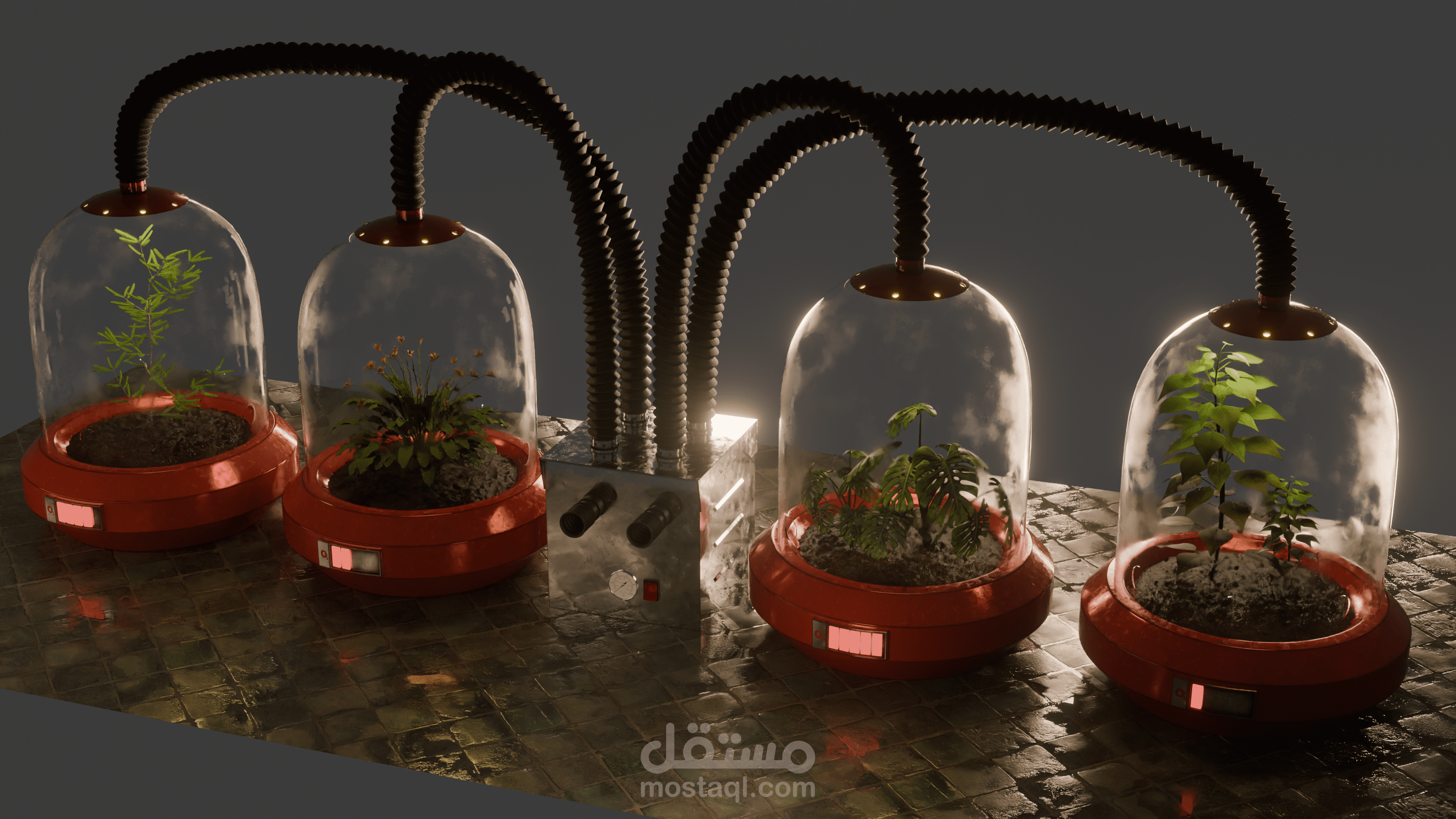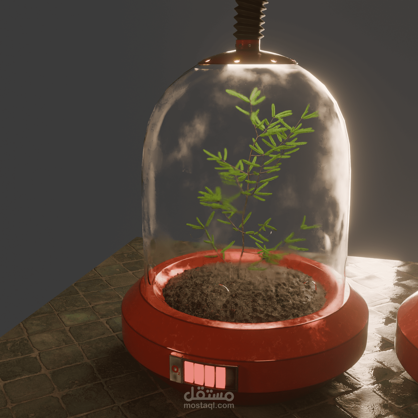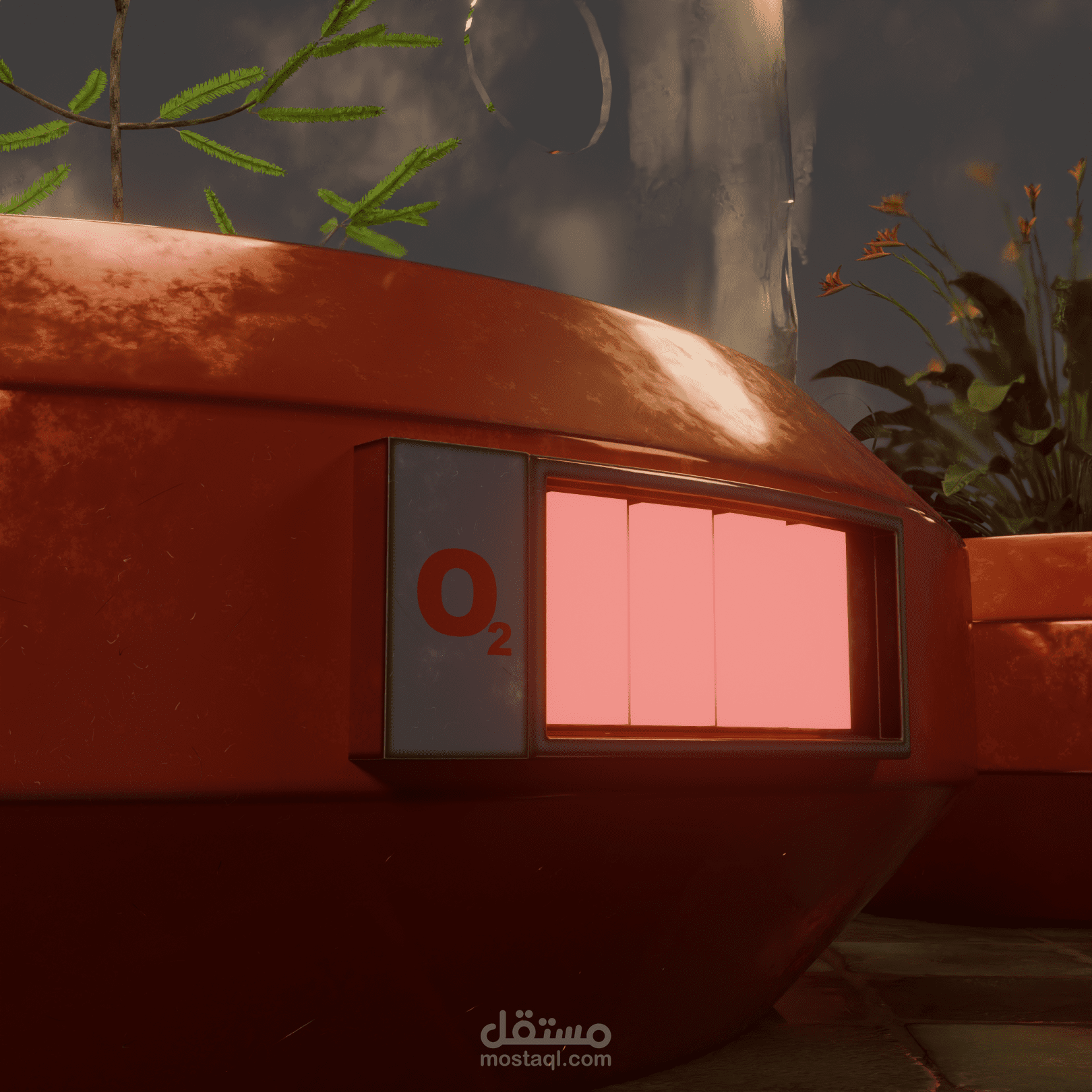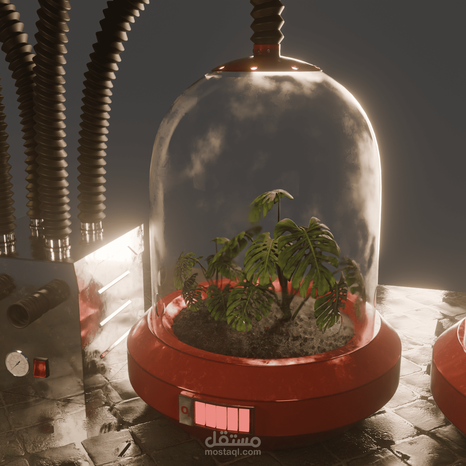 THE GREEN LUNG is a high-fidelity 3D study of a bio-mechanical life support system. Set in a desolate or low-oxygen future, this machine acts as a communal respiratory organ, extracting life from four isolated botanical sanctuaries. The project explores the tension between fragile organic life and the heavy, weathered machinery required to sustain it. Each "lobe" of the machine houses a different species, connected to a central "heart" that regulates pressure and filters oxygen for the surrounding environment.