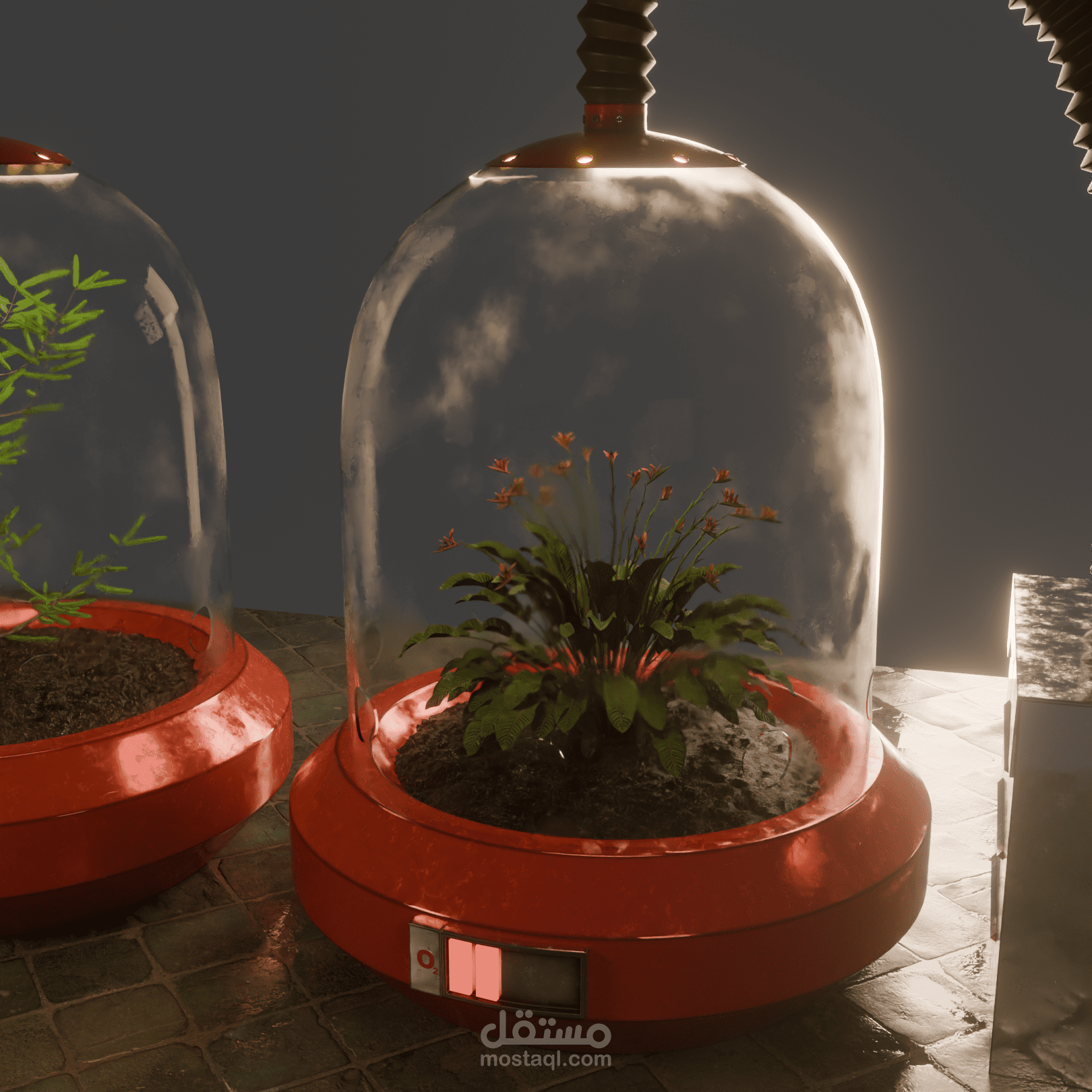 Narrative Storytelling: The "O2" status indicators on each pod vary in level, suggesting a living, breathing system where some plants are thriving more than others, creating a sense of urgency and realism.