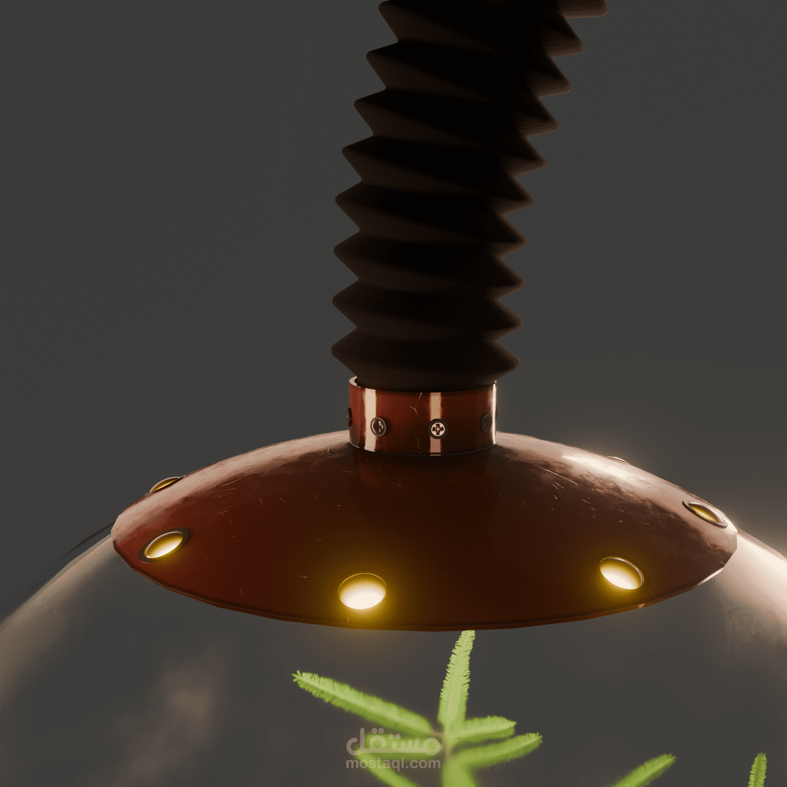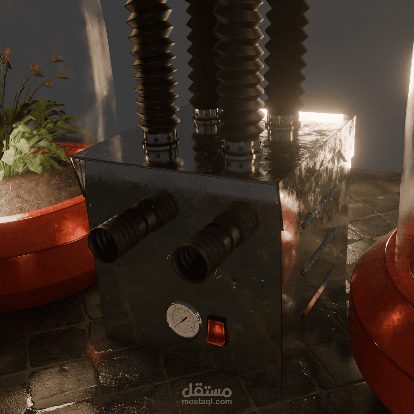 Material Artistry: Utilizes a PBR workflow to showcase realistic wear-and-tear. Key details include micro-scratches on the chrome processing hub, oxidized red enamel on the bases, and subtle condensation built up on the interior of the glass domes.
