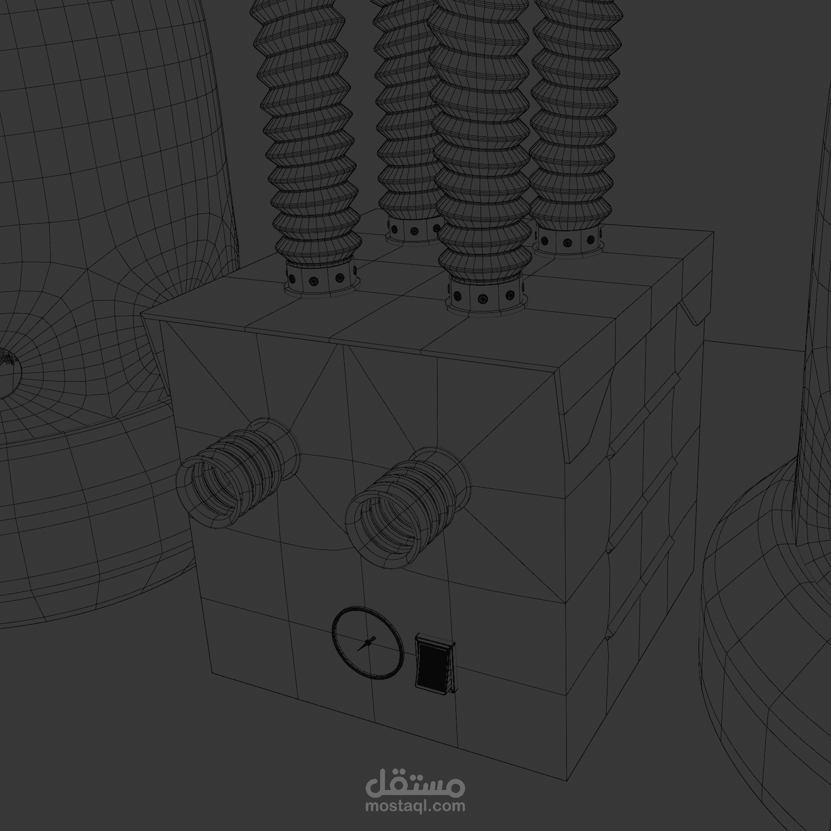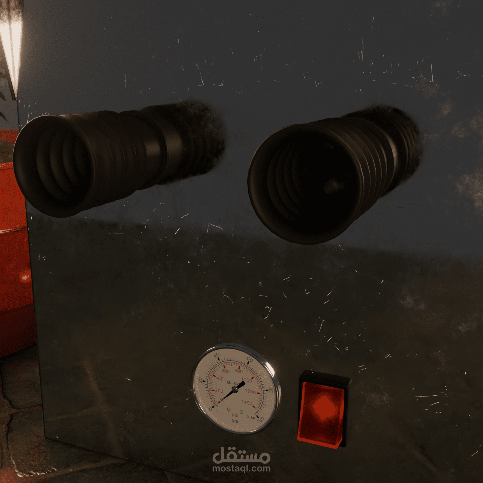 Hard Surface Precision: Features tactile mechanical components—including analog pressure gauges, industrial toggle switches, and Phillips-head fasteners—to ground the speculative design in a believable, "used-future" reality.
