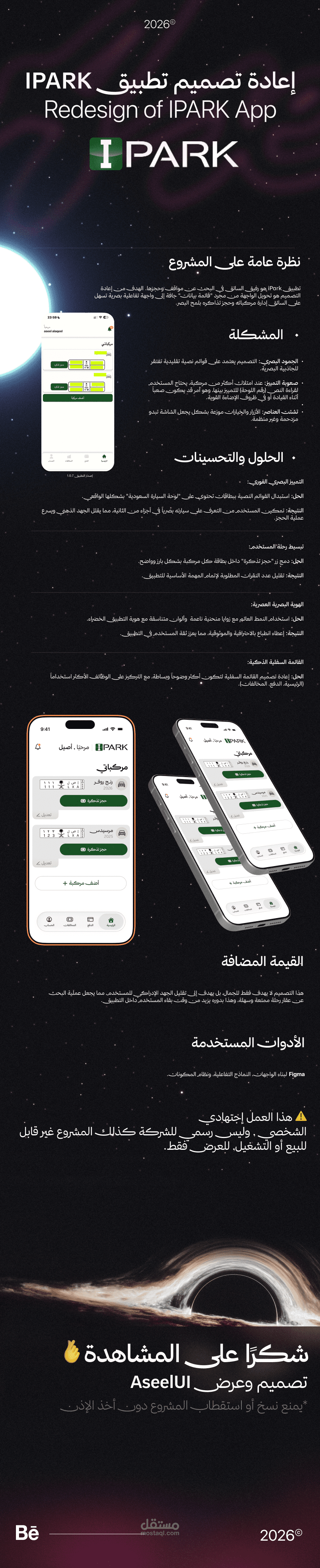تطبيق iPark هو رفيق السائق في البحث عن مواقف وحجزها. الهدف من إعادة التصميم هو تحويل الواجهة من مجرد "قائمة بيانات" جافة إلى واجهة تفاعلية بصرية تسهل على السائق إدارة مركباته وحجز تذاكره بلمح البصر.