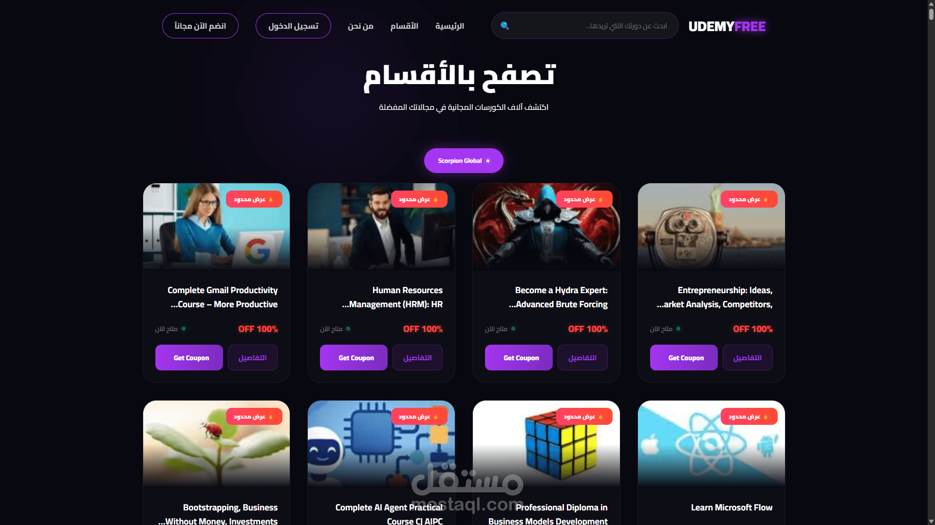 يوفر الموقع واجهة عصرية تعتمد على تصميم داكن (Dark UI) مع بطاقات كورسات تفاعلية، تتيح للمستخدم تصفح العروض المحدودة بسهولة، والانتقال مباشرة إلى صفحة الكوبون أو تفاصيل الكورس بنقرة واحدة.