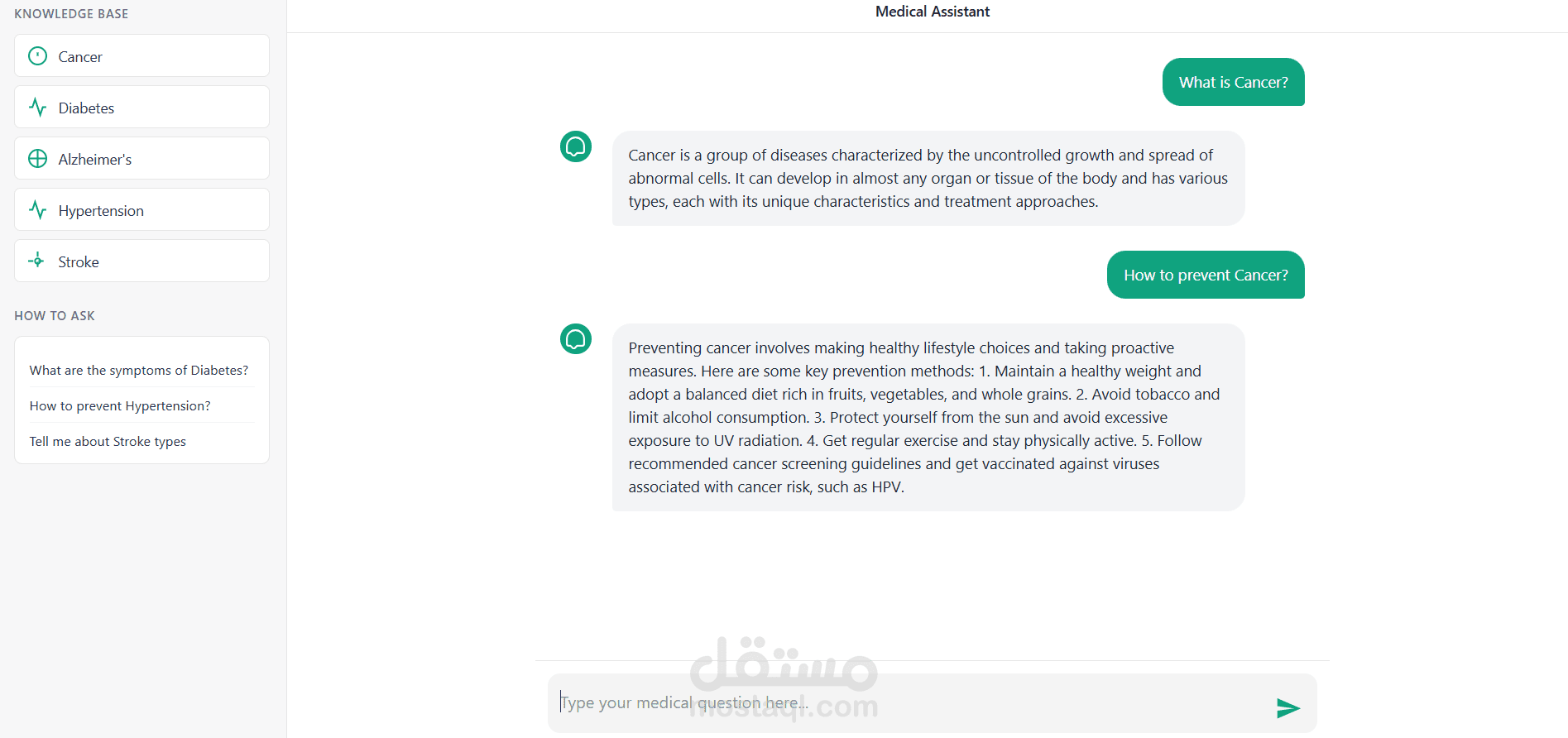 الشات بوت يعتمد على تحليل النص، تصنيف نية السؤال (Intent Classification)، ثم إرجاع الرد المناسب من قاعدة بيانات طبية، ويتم تشغيله من خلال واجهة ويب تفاعلية مبنية باستخدام Flask.