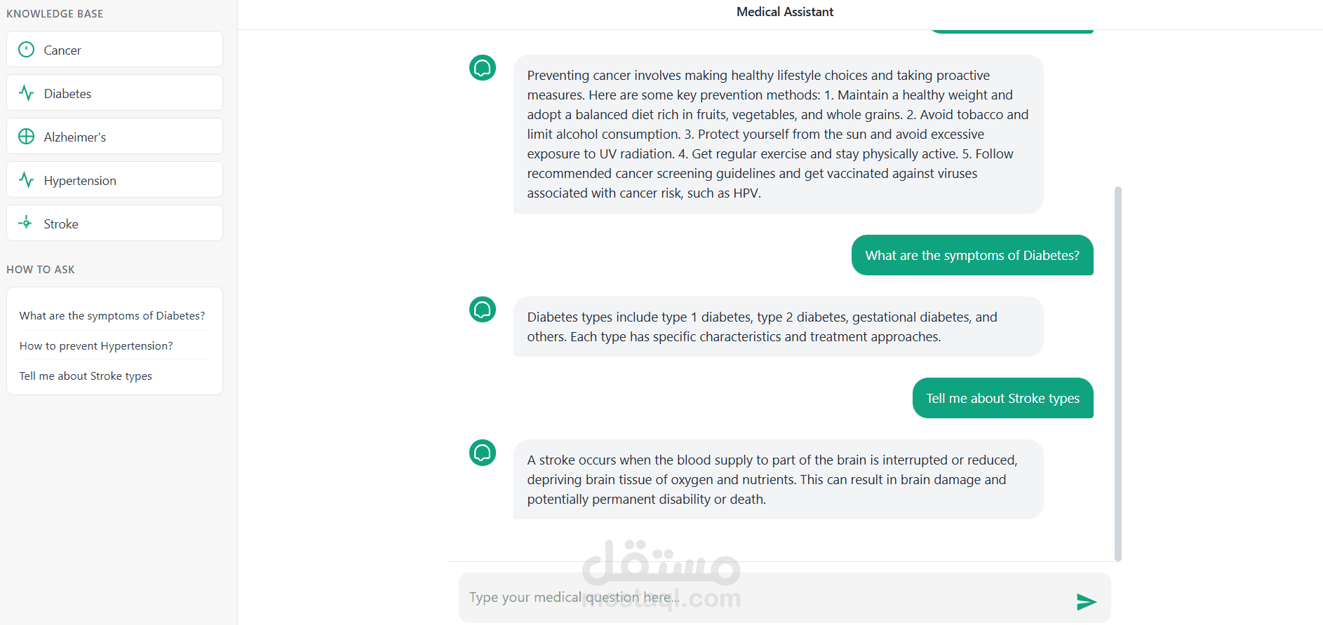 النظام مصمم لفهم أسئلة المستخدم الطبية والإجابة عليها بشكل دقيق باستخدام تقنيات معالجة النصوص والذكاء الاصطناعي.