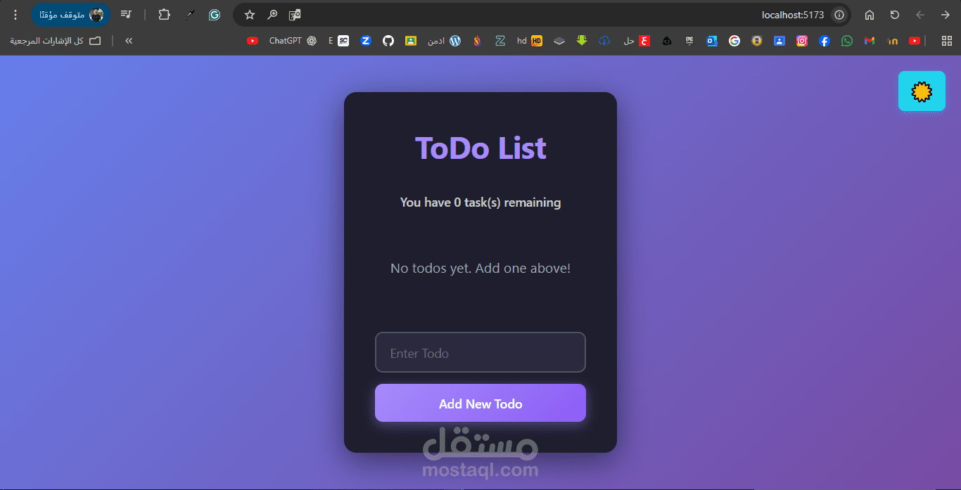 تطبيق متكامل لإدارة المهام اليومية باستخدام React. يمكن للمستخدم إضافة مهام جديدة، تعليمها كمكتملة، حذفها عند الانتهاء، وتصنيف المهام بسهولة. يتميز التطبيق بواجهة تفاعلية وسهلة الاستخدام، ويدعم الوضع الليلي (Dark Mode) لتجربة مريحة للعين، بالإضافة إلى إمكانية إضافة المهام بسرعة عن طريق الضغط على Enter من لوحة المفاتيح.